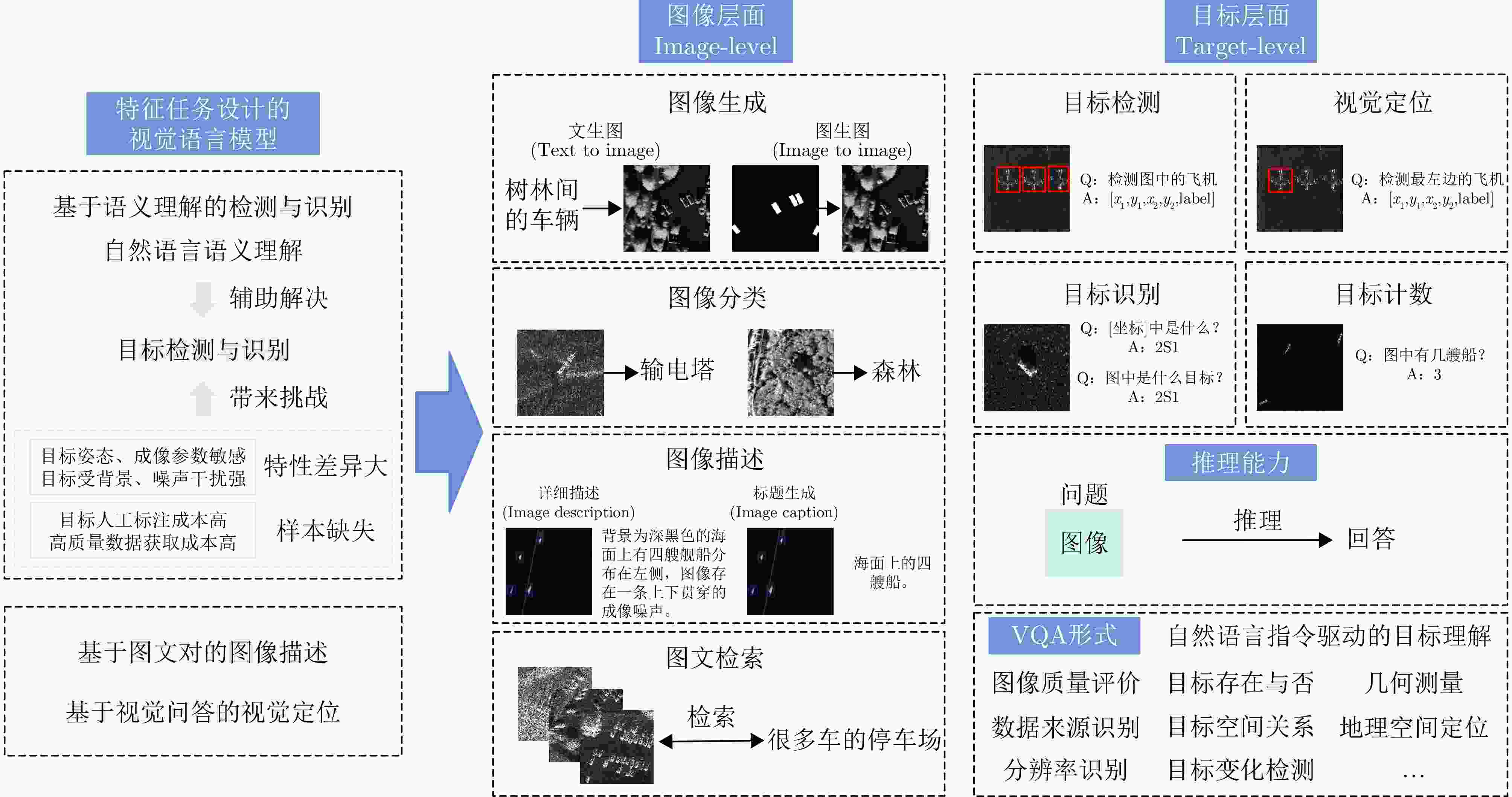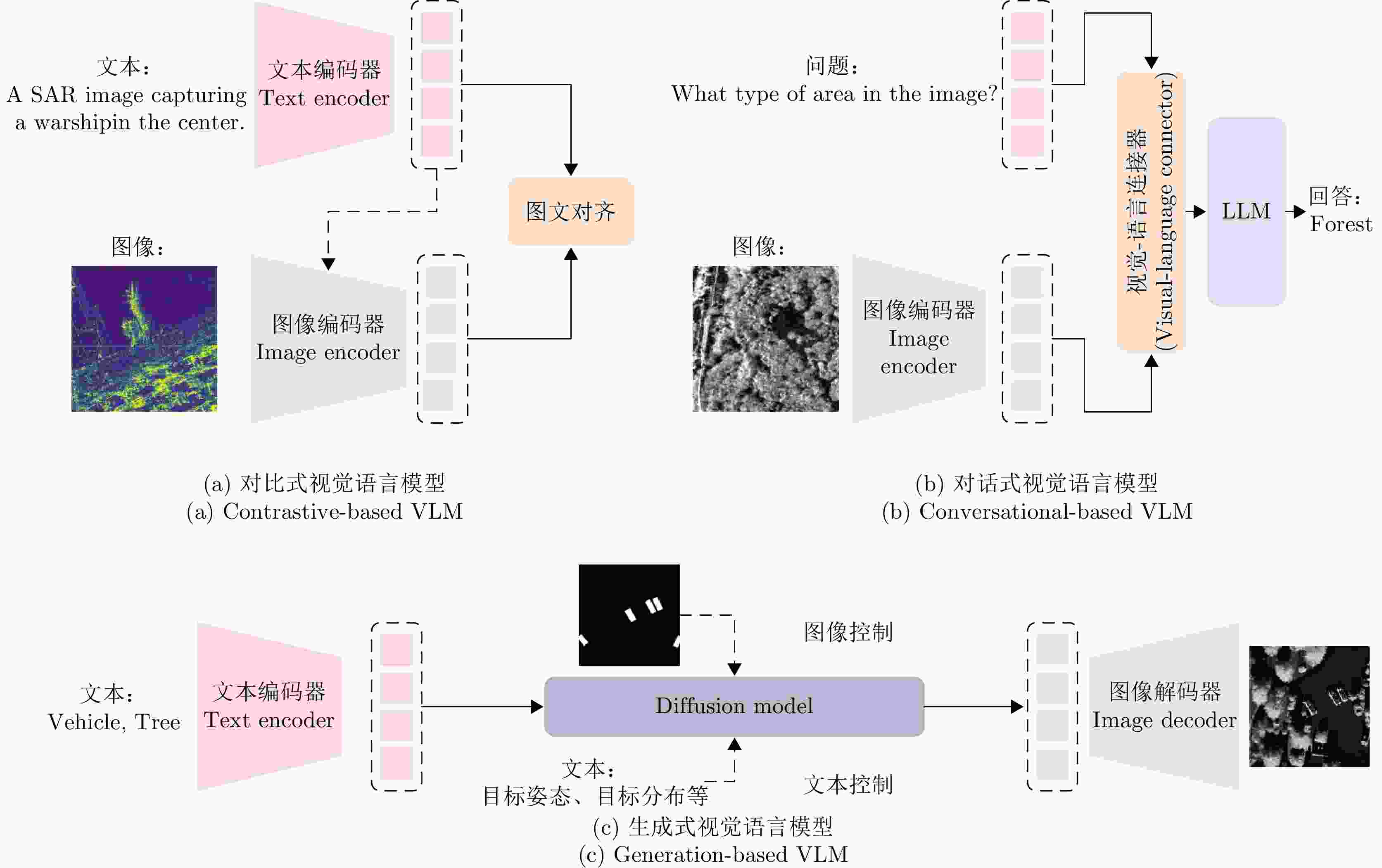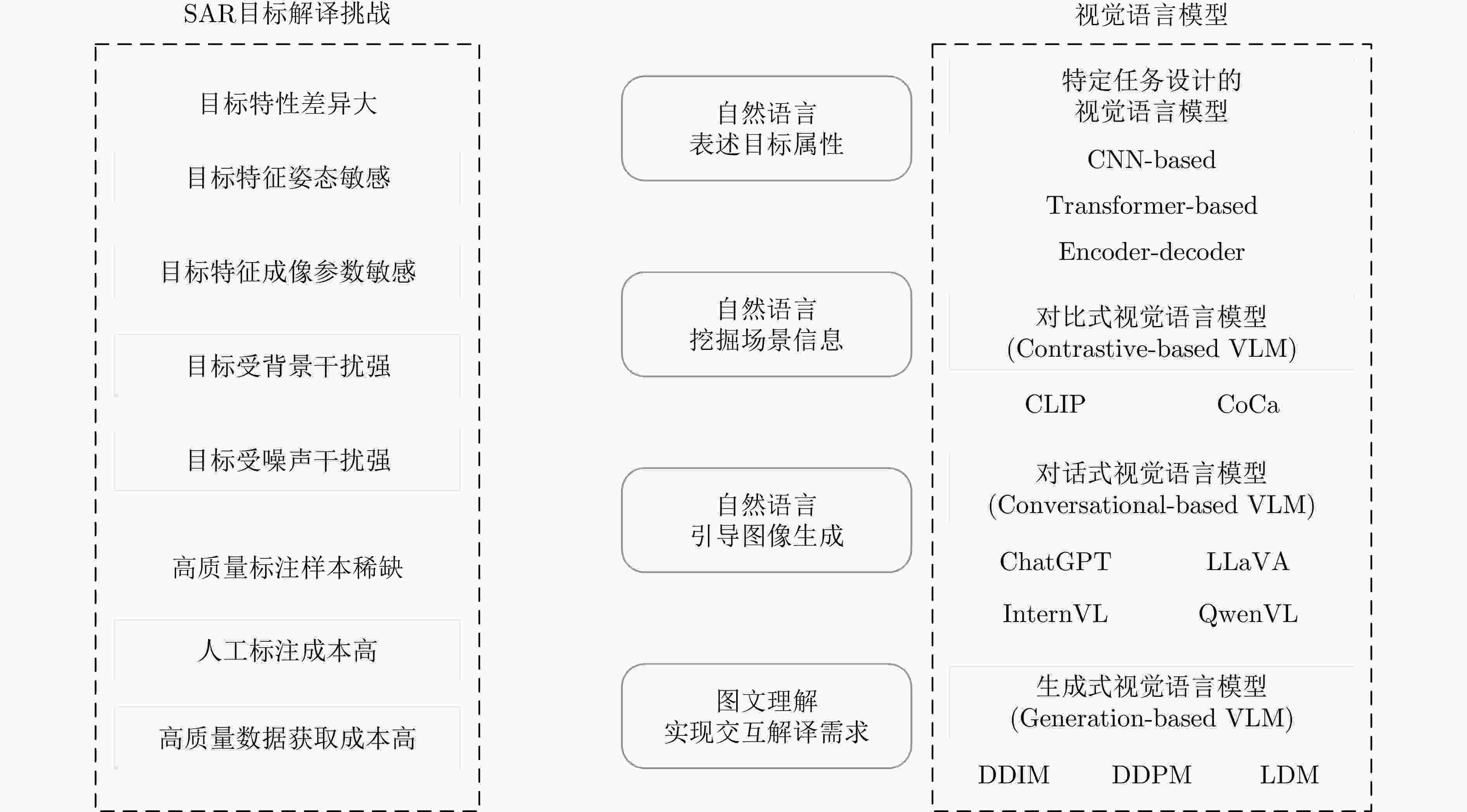 摘要: 合成孔径雷达(SAR)在军事和民用领域应用广泛,SAR图像目标智能解译是SAR应用的重要组成部分。视觉语言模型在SAR目标解译过程中发挥了关键作用,通过引入自然语言理解有效弥补了SAR目标特性差异大和高质量标注样本稀缺的挑战,实现了从纯视觉解译到目标语义理解的发展。该文结合团队在SAR目标解译理论、算法及应用等方面的长期研究积累,对基于视觉语言的SAR图像目标智能解译进行了全面回顾和综述,深入分析了现有挑战和任务并总结了研究现状,汇总整理了公开数据集,系统梳理了从特定任务的视觉语言模型到对比式、对话式和生成式视觉语言模型和基础模型的发展历程,最后探讨了该领域的最新挑战与展望。Abstract: Synthetic Aperture Radar (SAR) is widely used in military and civilian applications, with intelligent target interpretation of SAR images being a crucial component of SAR applications. Vision-Language Models (VLMs) play an important role in SAR target interpretation. By incorporating natural language understanding, VLMs effectively address the challenges posed by large intraclass variability in target characteristics and the scarcity of high-quality labeled samples, thereby advancing the field from purely visual interpretation toward semantic understanding of targets. Drawing upon our team’s extensive research experience in SAR target interpretation theory, algorithms, and applications, this paper provides a comprehensive review of intelligent SAR target interpretation based on VLMs. We provide an in-depth analysis of existing challenges and tasks, summarize the current state of research, and compile available open-source datasets. Furthermore, we systematically outline the evolution, ranging from task-specific VLMs to contrastive-, conversational-, and generative-based VLMs and foundational models. Finally, we discuss the latest challenges and future outlooks in SAR target interpretation by VLMs.