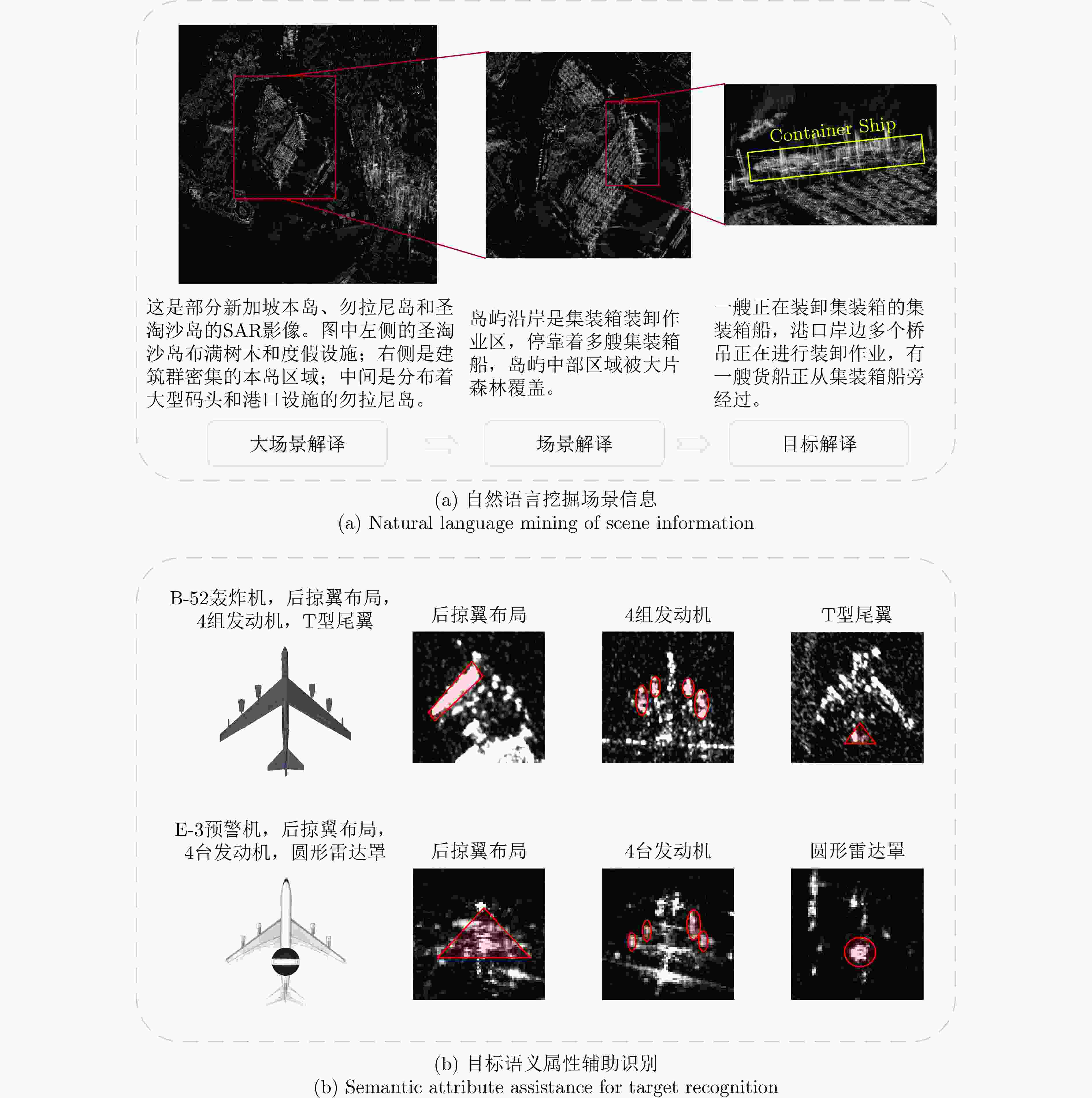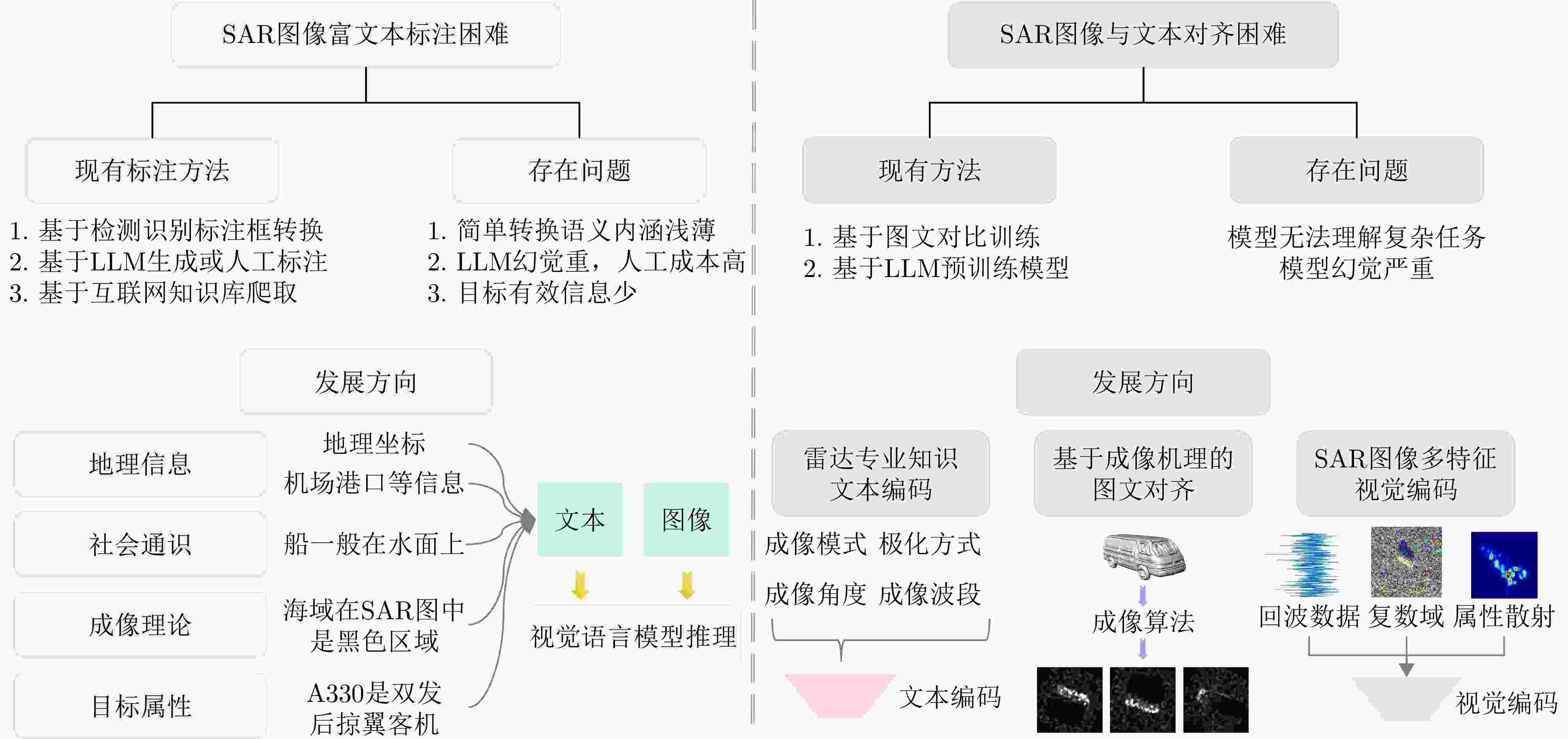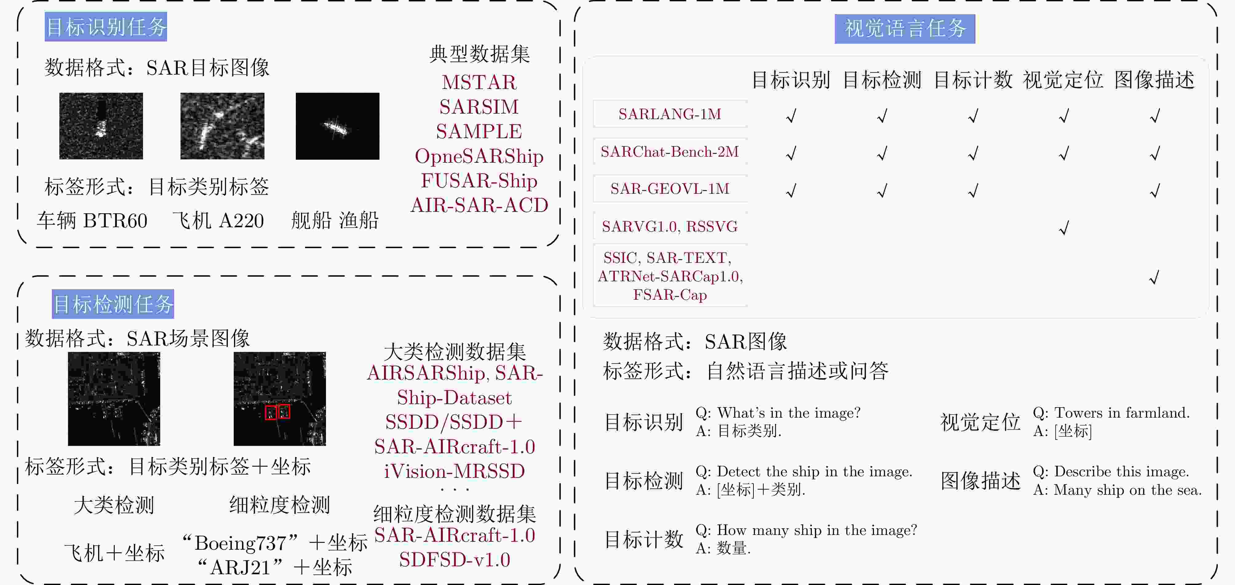 摘要: 合成孔径雷达(SAR)在军事和民用领域应用广泛,SAR图像目标智能解译是SAR应用的重要组成部分。视觉语言模型在SAR目标解译过程中发挥了关键作用,通过引入自然语言理解有效弥补了SAR目标特性差异大和高质量标注样本稀缺的挑战,实现了从纯视觉解译到目标语义理解的发展。该文结合团队在SAR目标解译理论、算法及应用等方面的长期研究积累,对基于视觉语言的SAR图像目标智能解译进行了全面回顾和综述,深入分析了现有挑战和任务并总结了研究现状,汇总整理了公开数据集,系统梳理了从特定任务的视觉语言模型到对比式、对话式和生成式视觉语言模型和基础模型的发展历程,最后探讨了该领域的最新挑战与展望。Abstract: Synthetic Aperture Radar (SAR) is widely used in military and civilian applications, with intelligent target interpretation of SAR images being a crucial component of SAR applications. Vision-Language Models (VLMs) play an important role in SAR target interpretation. By incorporating natural language understanding, VLMs effectively address the challenges posed by large intraclass variability in target characteristics and the scarcity of high-quality labeled samples, thereby advancing the field from purely visual interpretation toward semantic understanding of targets. Drawing upon our team’s extensive research experience in SAR target interpretation theory, algorithms, and applications, this paper provides a comprehensive review of intelligent SAR target interpretation based on VLMs. We provide an in-depth analysis of existing challenges and tasks, summarize the current state of research, and compile available open-source datasets. Furthermore, we systematically outline the evolution, ranging from task-specific VLMs to contrastive-, conversational-, and generative-based VLMs and foundational models. Finally, we discuss the latest challenges and future outlooks in SAR target interpretation by VLMs.