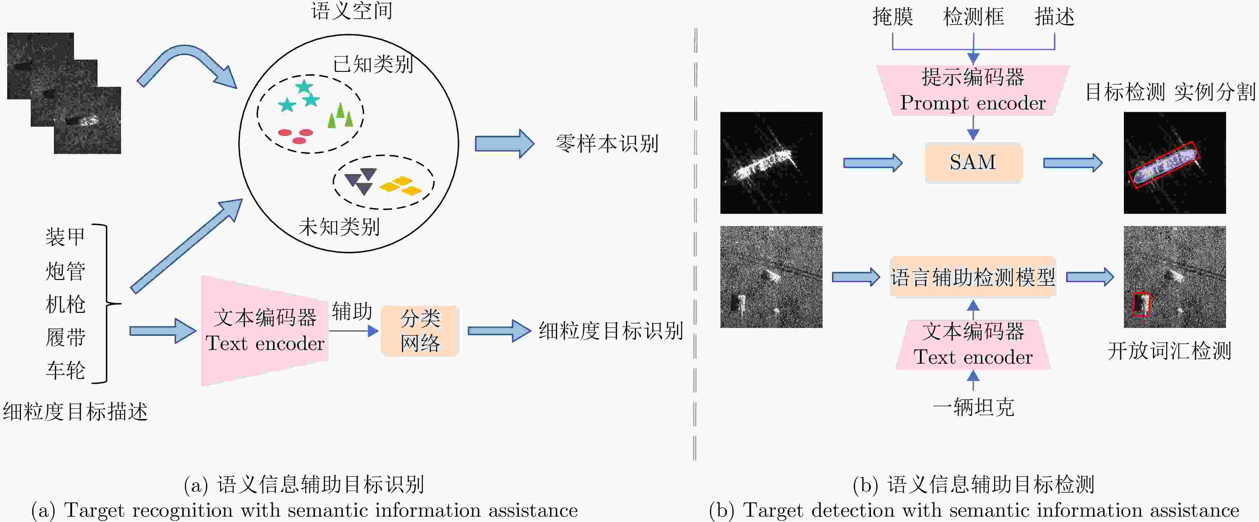 作者 时间 目标 任务类别 模型结构 Wei等人[72] 20-Mar-2023 车辆 零样本目标识别 CNN-based Yan等人[12] 19-Mar-2024 飞机 零样本目标识别 WGAN-based Chen等人[73] 22-Nov-2024 舰船 零样本目标识别 Dual-branch model based Liu等人[17] 25-May-2024 舰船、飞机 零样本目标识别 Dual-branch model based Wang等人[74] 1-Jul-2024 车辆 零样本目标识别 BLIP-2-based Chen等人[75] 11-Mar-2025 舰船 细粒度目标识别 Prototype-guided model Chen等人[76] 20-Jun-2025 舰船 细粒度目标识别 Open pretrained Transformers model Jin等人[77] 3-Nov-2024 车辆、飞机、舰船 开放词汇检测 GroundingDINO-based Liu等人[78] 16-Oct-2024 舰船 实例分割 SAM-based Zhang等人[79] 26-Mar-2025 舰船 实例分割 SAM-based Chen等人[80] 19-Jan-2024 舰船 实例分割 SAM-based Li等人[70] 24-Feb-2025 输电塔 视觉定位 BERT-based Chen等人[71] 31-Mar-2025 舰船 视觉定位 Transformer-based Zhao等人[69] 22-Aug-2022 舰船 图像描述 Encoder-decoder structure Gao等人[81] 24-Aug-2025 飞机 图像描述 Encoder-decoder structure Li等人[82] 10-Jan-2025 舰船 图像描述 Encoder-decoder structure Zhang等人[18] 18-Oct-2025 22类细粒度 图像描述 Encoder-decoder structure 表 4 基于对比式、对话式和生成式视觉语言模型的SAR目标解译工作