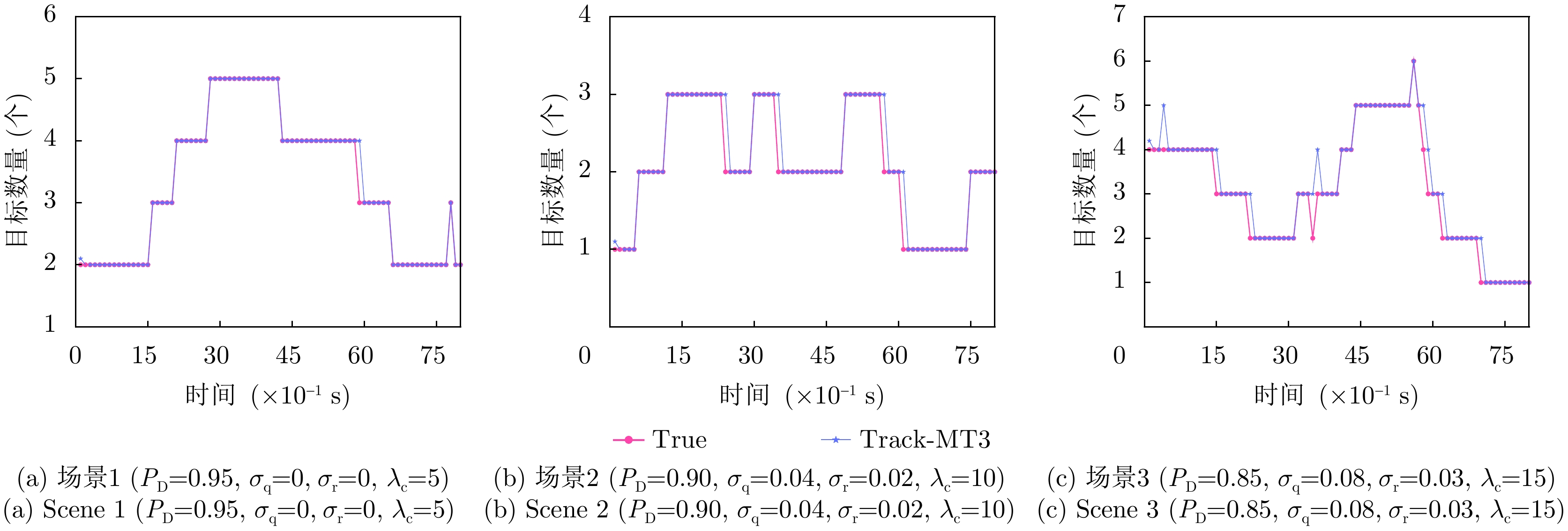 场景 目标数量(个) 出生率 死亡率 场景1 6 0.04 0.01 场景2 6 0.08 0.02 场景3 10 0.12 0.03 表 6 跟踪准确性对比