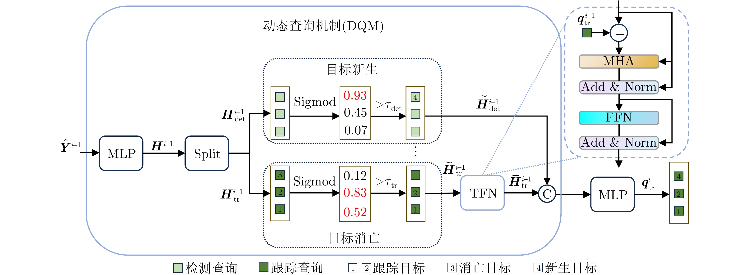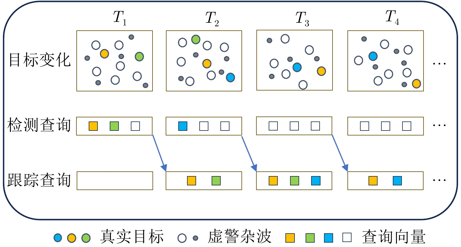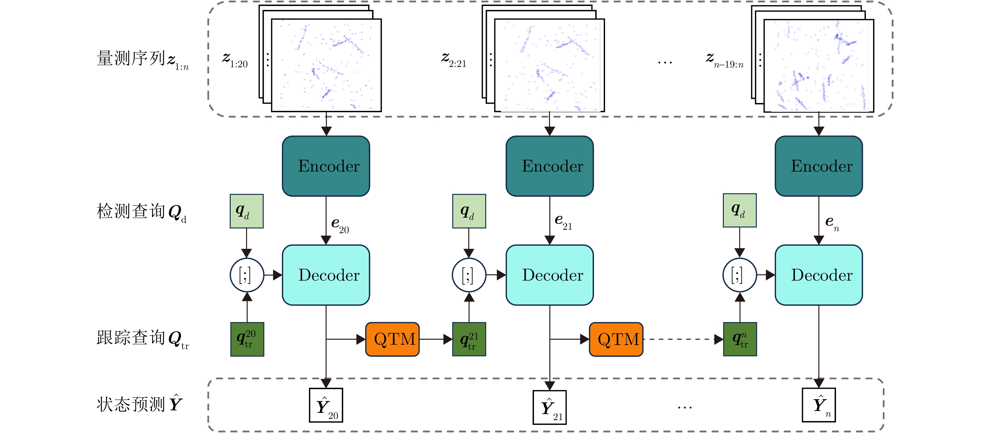 摘要: 针对复杂环境中多目标跟踪数据关联难度大、难以实现目标长时间稳定跟踪的问题,该文创新性地提出了一种基于Transformer网络的端到端多目标跟踪模型Track-MT3。首先,引入了检测查询和跟踪查询机制,隐式地执行量测-目标的数据关联并且实现了目标的状态估计任务。然后,采用跨帧目标对齐策略增强跟踪轨迹的时间连续性。同时,设计了查询变换与时间特征编码模块强化目标运动建模能力。最后,在模型训练中采用了集体平均损失函数,实现了模型性能的全局优化。通过构造多种复杂的多目标跟踪场景,并利用多重性能指标进行评估,Track-MT3展现了优于MT3等基线方法的长时跟踪性能,与JPDA和MHT方法相比整体性能分别提高了6%和20%,能够有效挖掘时序信息,在复杂动态环境下实现稳定、鲁棒的多目标跟踪。