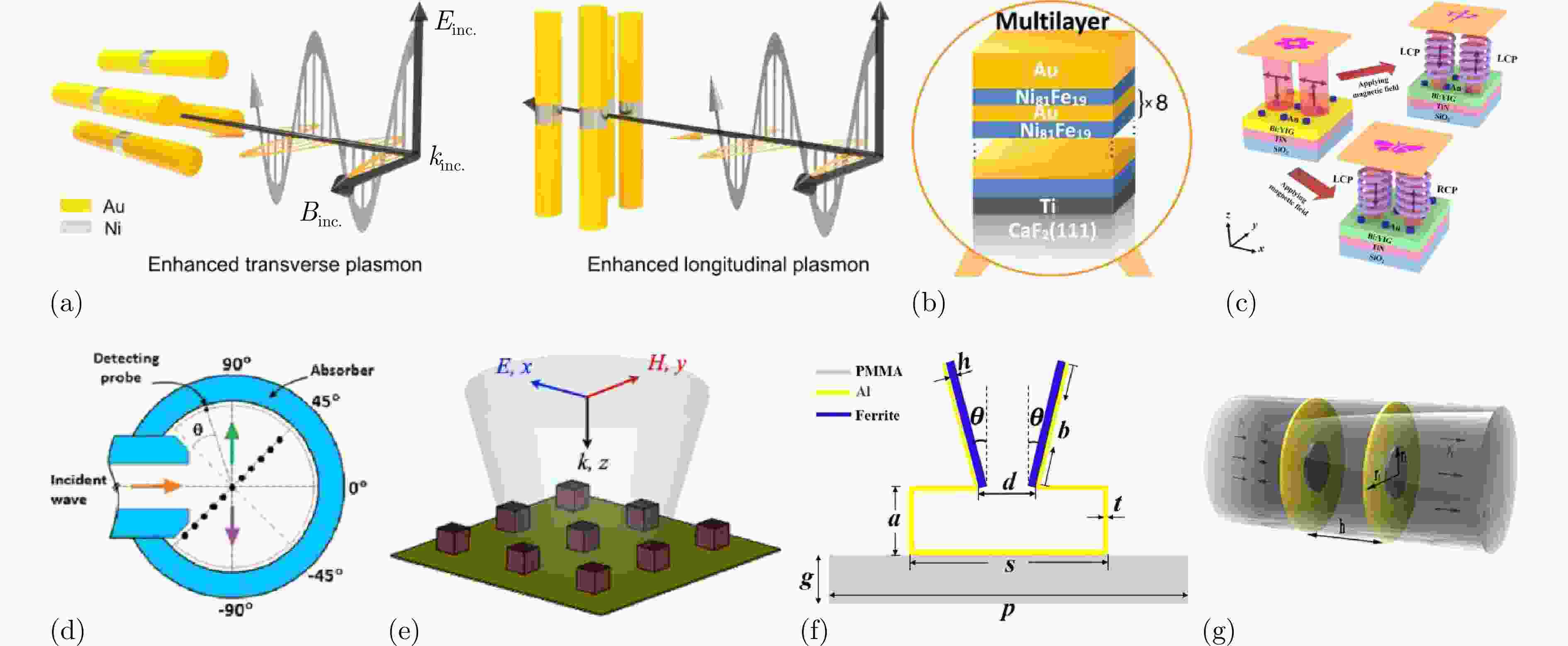 图 10 基于磁激励的动态调控方法:(a) 实现Au/Ni/Au纳米棒表面等离子体共振的磁调制的磁控超材料结构示意图[167];(b) 由Ni81Fe19/Au多层材料制成的微天线和孔阵列超材料平台结构示意图[168];(c) 极化复用全息超表面结构示意图[169];(d) 用铁氧体棒链实现非互易波传播结构示意图[170];(e) 基于超表面的可调控人造微波黑体结构示意图[171];(f) 由超薄柔性金属与Mn-Zn铁氧体组成的二维分裂环谐振器阵列结构示意图[172];(g) 由等截面圆管和膜组成的磁可调薄膜型声学超表面结构示意图[173]