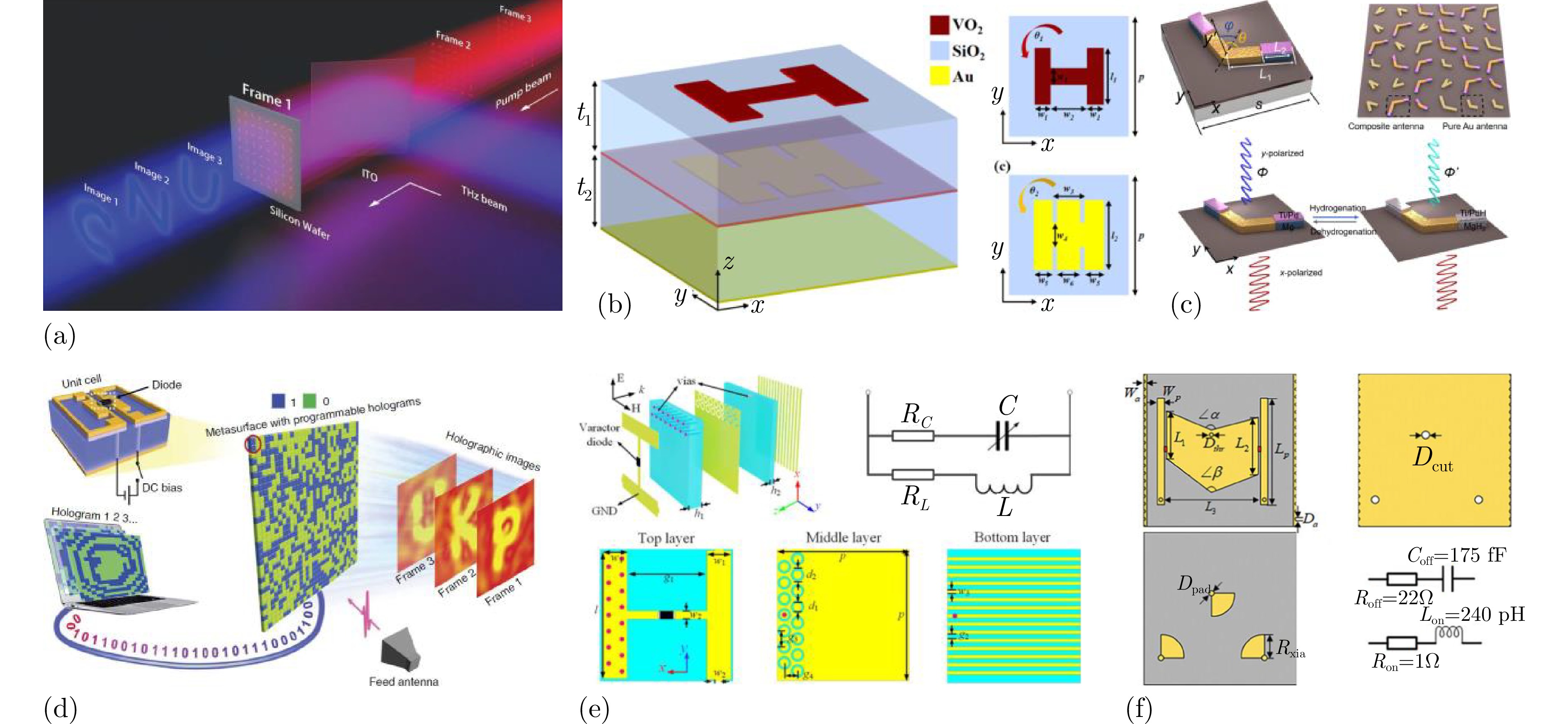 Figure 11. Implementation methods of holographic imaging: (a) Schematic diagram of reconfigurable metasurface for real-time holographic imaging by femtosecond laser pump[174]; (b) Schematic diagram of multi-channel holographic imaging metasurface in the terahertz band by using properties of vanadium dioxide[175]; (c) Schematic diagram of dynamic metasurface hologram by utilizing hierarchical reaction kinetics of magnesium upon a hydrogenation/dehydrogenation process[176]; (d) Schematic diagram of 1-bit coding metasurface for programmable holographic imaging[177]; (e) Schematic diagram of programmable supersurface for different holographic images on different detecting planes and operating frequencies[178]; (f) Schematic diagram of 2-bit space-time coding metasurface for near-field holographic reconstruction of two different images using ±1st order harmonics[179]