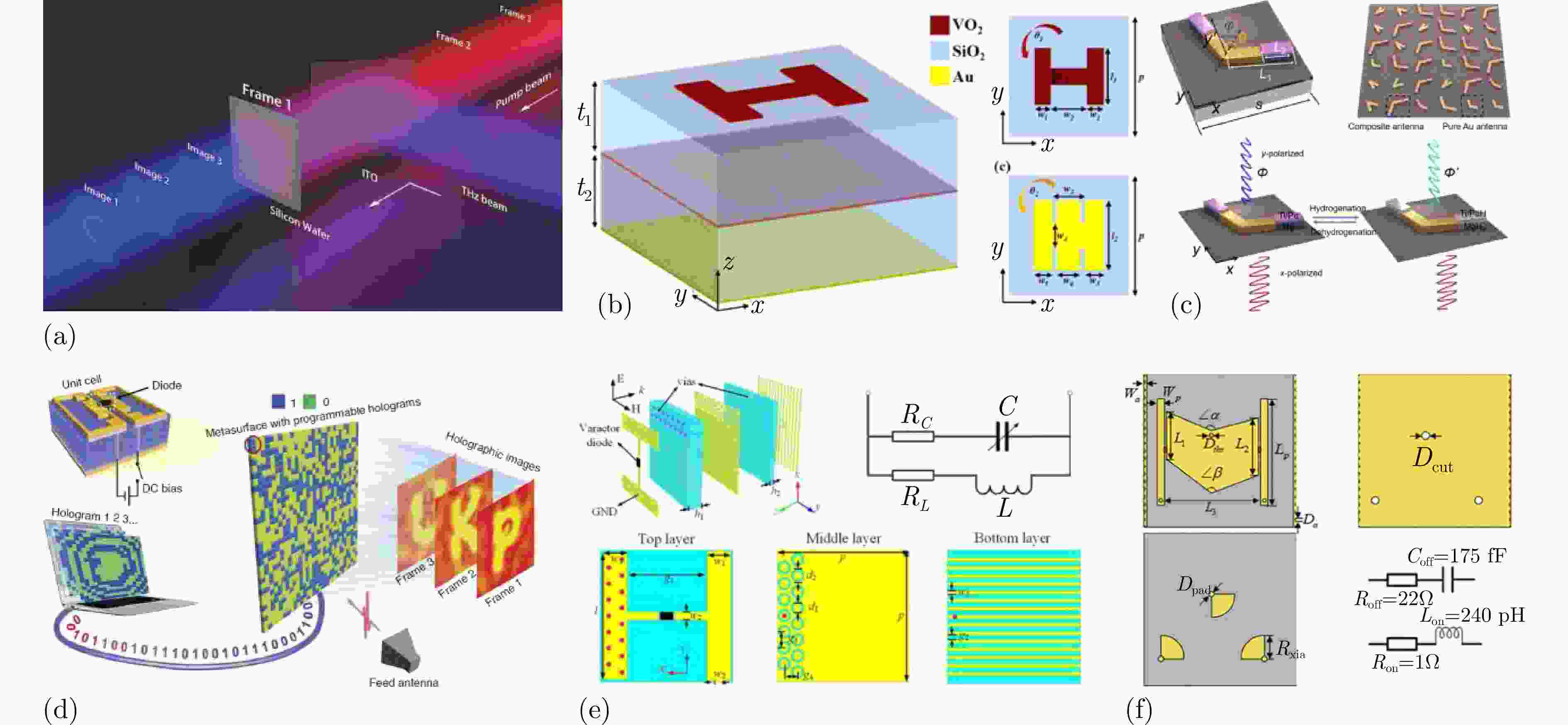 图 11 全息成像的实现方法:(a) 利用飞秒激光泵浦实现实时全息成像的可重构超表面原理示意图[174];(b) 利用VO2相变特性实现了太赫兹波段内多通道全息成像的超表面结构示意图[175];(c) 利用镁在加氢/脱氢过程中的分层反应动力实现动态全息成像的超表面结构示意图[176];(d) 实现可编程全息成像的1位编码超表面结构及原理示意图[177];(e) 在不同检测平面上和工作频率下实现不同全息图像可编程超表面结构示意图[178];(f) 利用±1阶谐波对两幅不同的图像进行近场全息重建的2位时空编码超表面结构示意图[179]