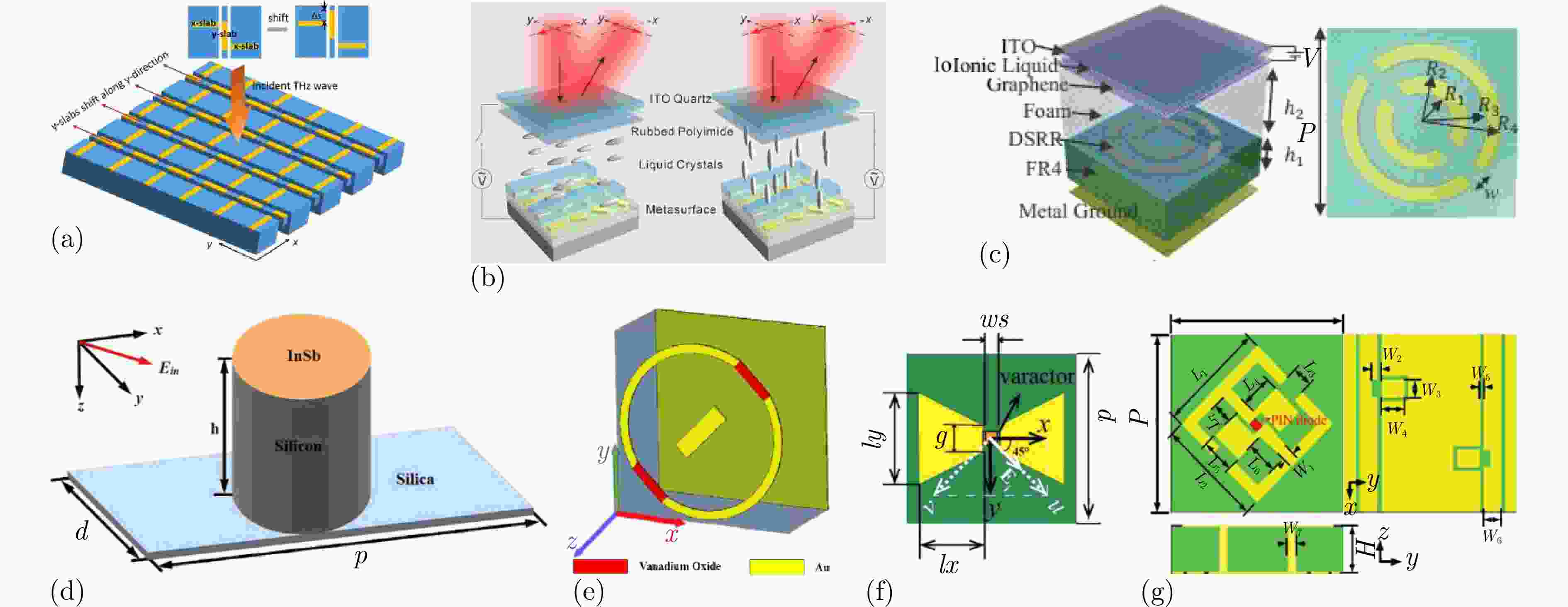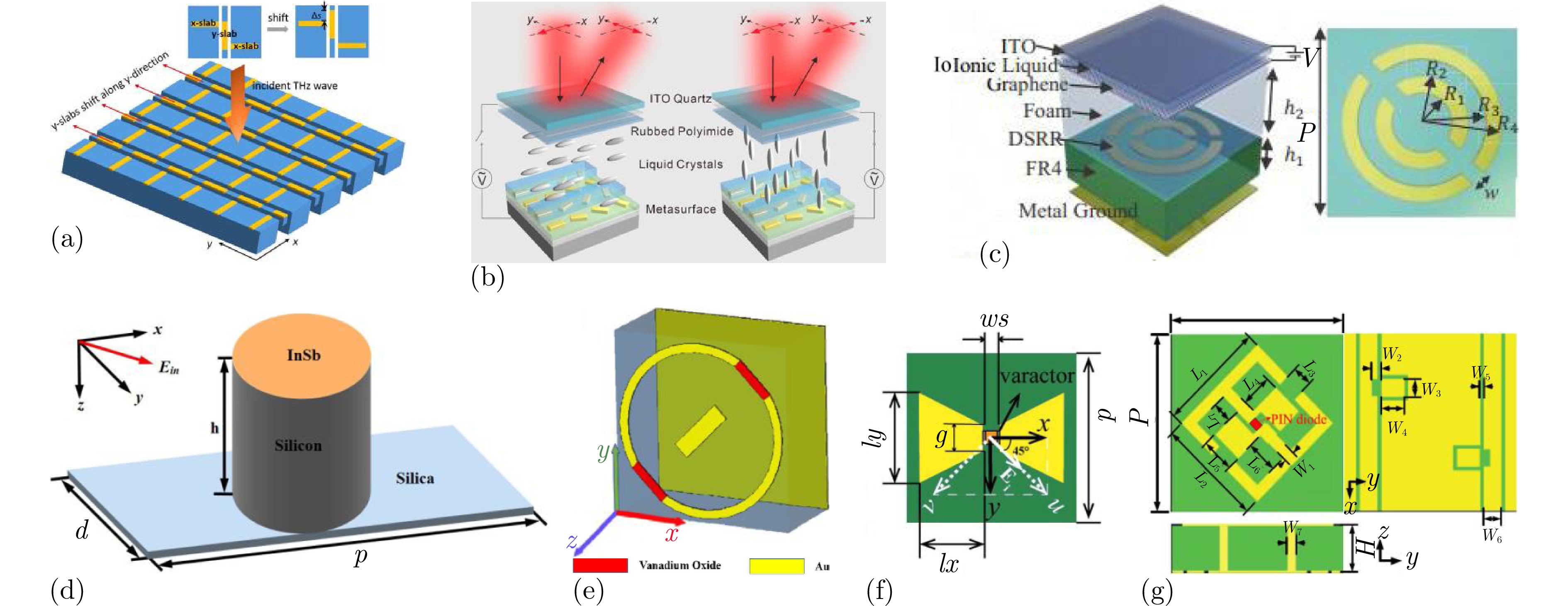 图 12 极化转换的实现方法:(a) 基于微机电系统驱动的可重构超表面结构示意图[180];(b) 电控光学超表面原理示意图[181];(c) 基于石墨烯超表面的宽带线性极化转换器结构示意图[182];(d) 基于全介电硅超表面的高效透射线-圆极化转换器结构示意图[183];(e) 由填充VO2的劈开金属圆环和中心棒组成的可调控反射极化转换器结构示意图[184];(f) 由蝴蝶形状金属结构、介质基板以及改进的金属偏置线组成的可重构宽带极化转换器结构示意图[185];(g) 基于PIN二极管的可重构极化转换超表面结构示意图[186]