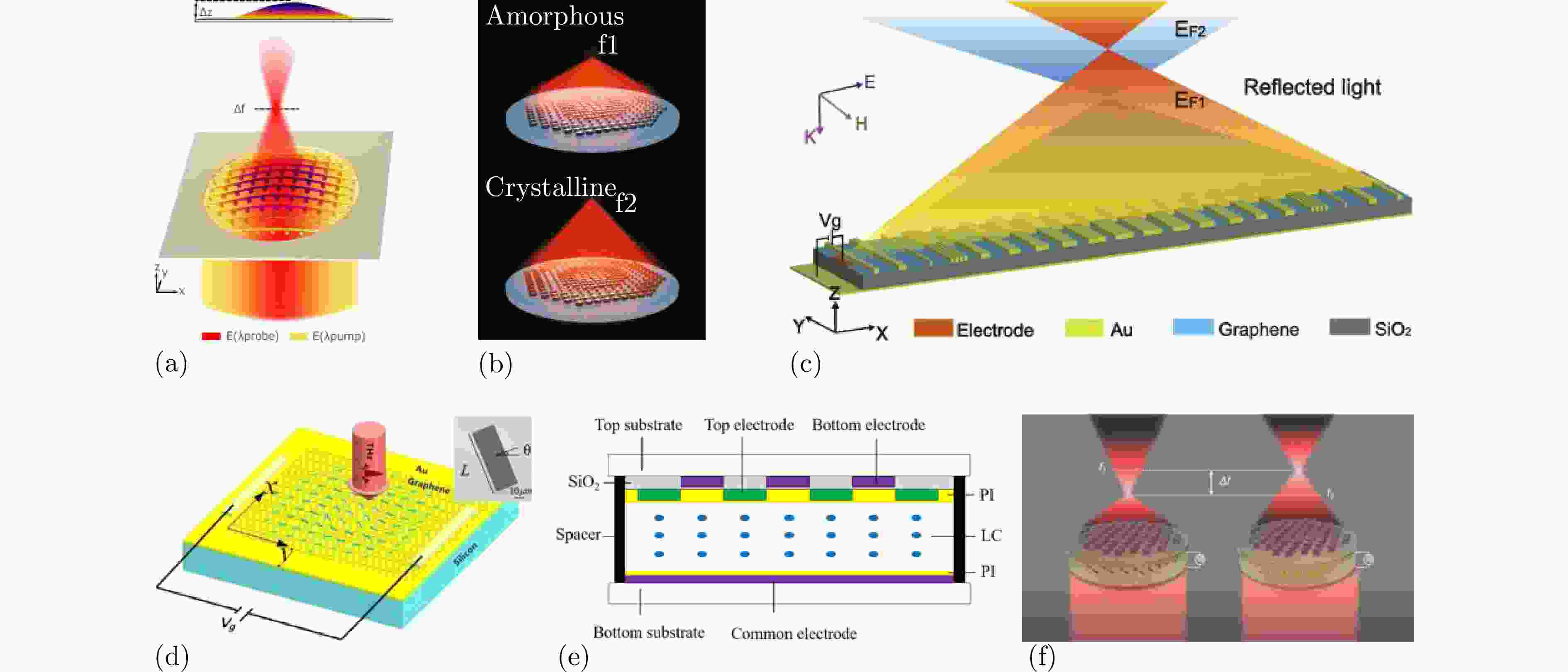 图 13 超构透镜的实现方法:(a) 由雕刻在独立晶体硅膜上的悬浮惠更斯原子组成的光学机械调控超构透镜原理示意图[187];(b) 由位于CaF2基板上的GSST惠更斯单元组成的高性能变焦超透镜原理示意图[188];(c) 采用金属超表面和单层石墨烯的混合结构的电控超构透镜原理示意图[189];(d) 由基于PB相位的金属超表面结构和单层石墨烯组成的电控超构透镜原理示意图[190];(e) 具有焦距可调和焦平面可控的双层电极驱动液晶透镜原理示意图[191];(f) 工作在可见光波段的电控双焦超构透镜原理示意图[192]