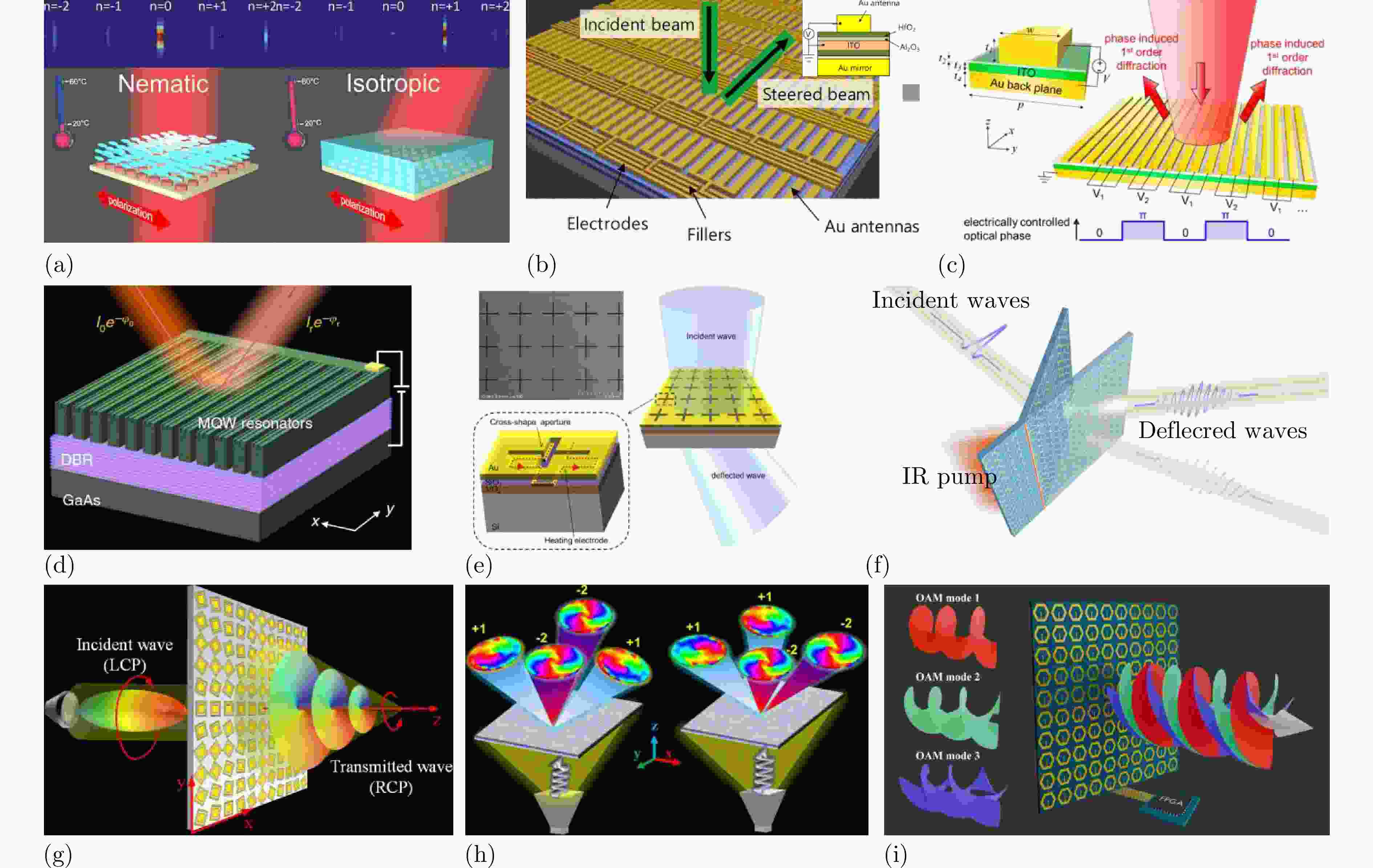 图 14 波束调控的实现方法:(a) 基于液晶的硅纳米片介电超表面原理示意图[193];(b) 由金属-介电-氧化物结构组成的反射型超表面原理示意图[194];(c) 在近红外波段内动态可调超表面结构示意图[195];(d) 基于III-V多量子阱的全介电有源超表面原理示意图[196];(e) 基于VO2的电控超表面结构示意图[197];(f) 基于液晶弹性体基板的太赫兹超表面原理示意图[198];(g) 产生携带轨道角动量的会聚和非衍射涡旋光束的金属透镜原理示意图[199];(h) 生成4个双模轨道角动量波束的多层透射式数字编码超表面原理示意图[200];(i) 利用空时编码超表面动态生成多路涡旋光束原理示意图[201]