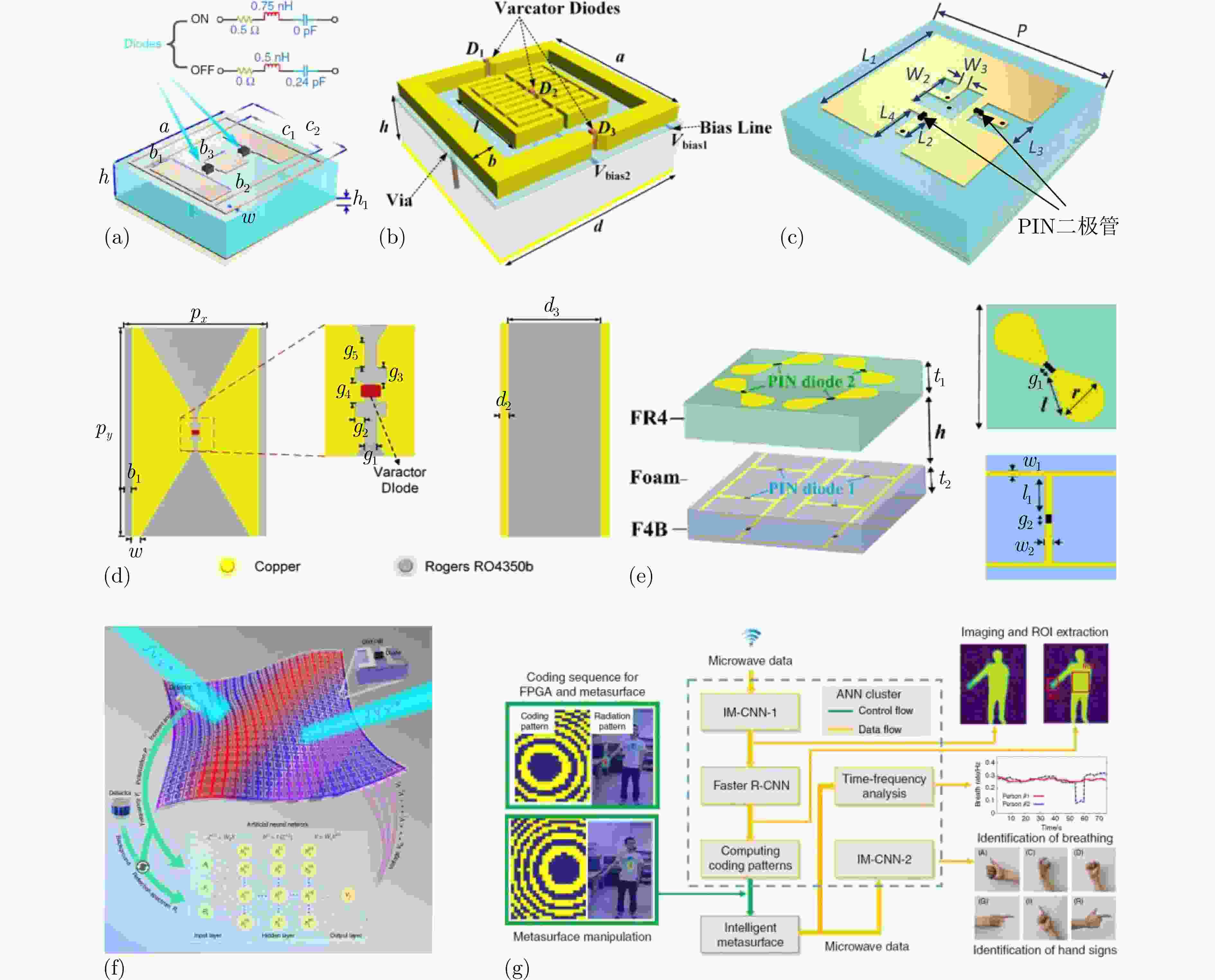 图 15 智能系统的实现方法:(a) 自适应调控电磁辐射波束的集成三轴陀螺仪的智能超表面结构示意图[202];(b) 自适应操纵不同频率入射波的智能超表面结构示意图[203];(c) 实现智能目标定位和波束自适应跟踪的信息超表面结构示意图[204];(d) 在宽波达方向和宽频带范围内动态改变工作频率的自适应智能路由系统结构示意图[205];(e) 基于入射功率信息自动调整电磁功能的智能超表面结构示意图[206];(f) 基于深度学习驱动的智能隐身斗篷原理示意图[207];(g) 实现呼吸监测和手语识别的基于人工神经网络驱动的智能超表面原理示意图[208]