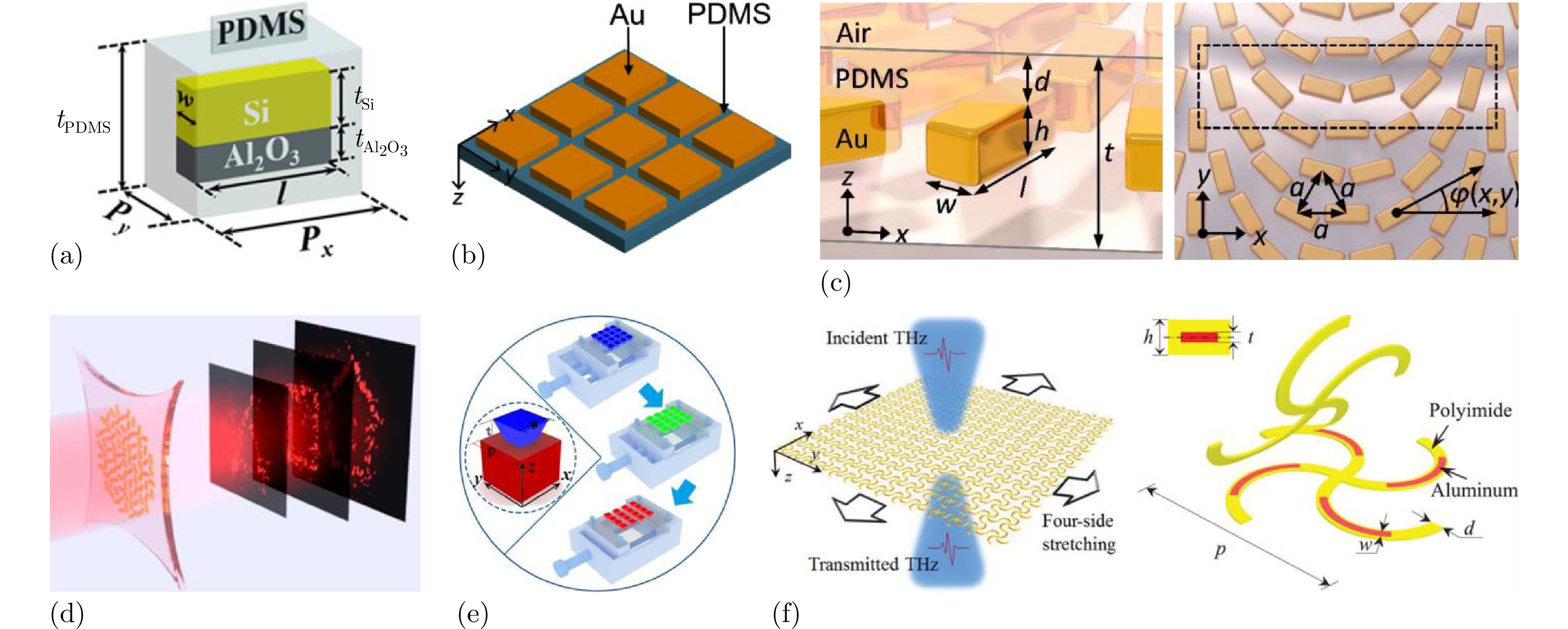 Figure 2. Dynamic control methods based on flexible substrate: (a) Schematic diagram of stretchable metasurface composed of dielectric rectangular resonators embedded in PDMS substrate[96]; (b) Schematic diagram of mechanically stretchable metamaterial composed of PDMS and gold[97]; (c) Schematic diagram of mechanically reconfigurable metasurface for continuously regulating wavefront in visible light frequency range[98]; (d) Schematic diagram of reconfigurable metasurface for holographic imaging[99]; (e) Schematic diagram of mechanically stretchable all-dielectric metasurface with polarization insensitivity[100]; (f) Schematic diagram of stretchable metasurface based on PI flexible substrate[101]