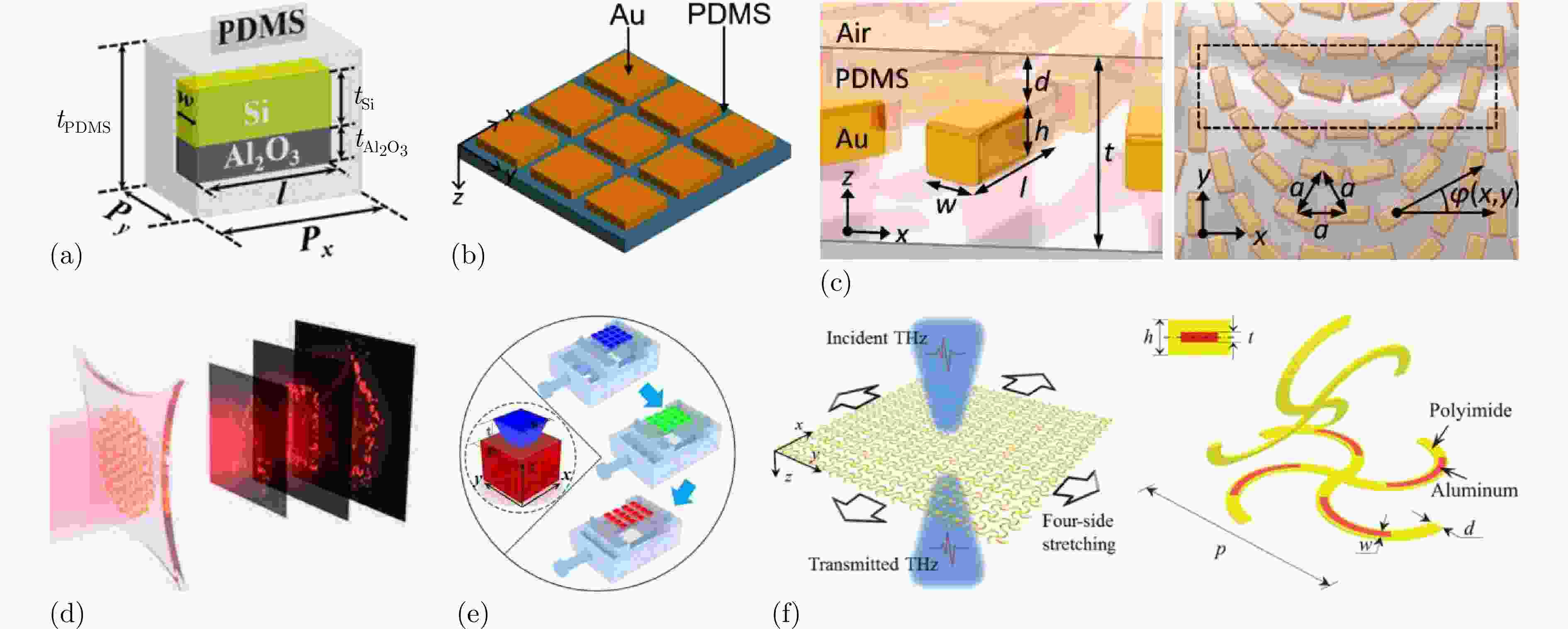 图 2 基于柔性基板的动态调控方法:(a) 由嵌在PDMS基板中的介电矩形谐振器组成的可拉伸超表面结构示意图[96];(b) 由PDMS和金组成的机械可拉伸超材料结构示意图[97];(c) 在可见光频率范围内连续调控波前的机械可重构超表面结构示意图[98];(d) 实现全息投影的可重构超表面原理示意图[99];(e) 具有极化不敏感特性的机械可拉伸全介电超表面结构示意图[100];(f) 基于PI柔性基板的可拉伸超表面结构示意图[101]