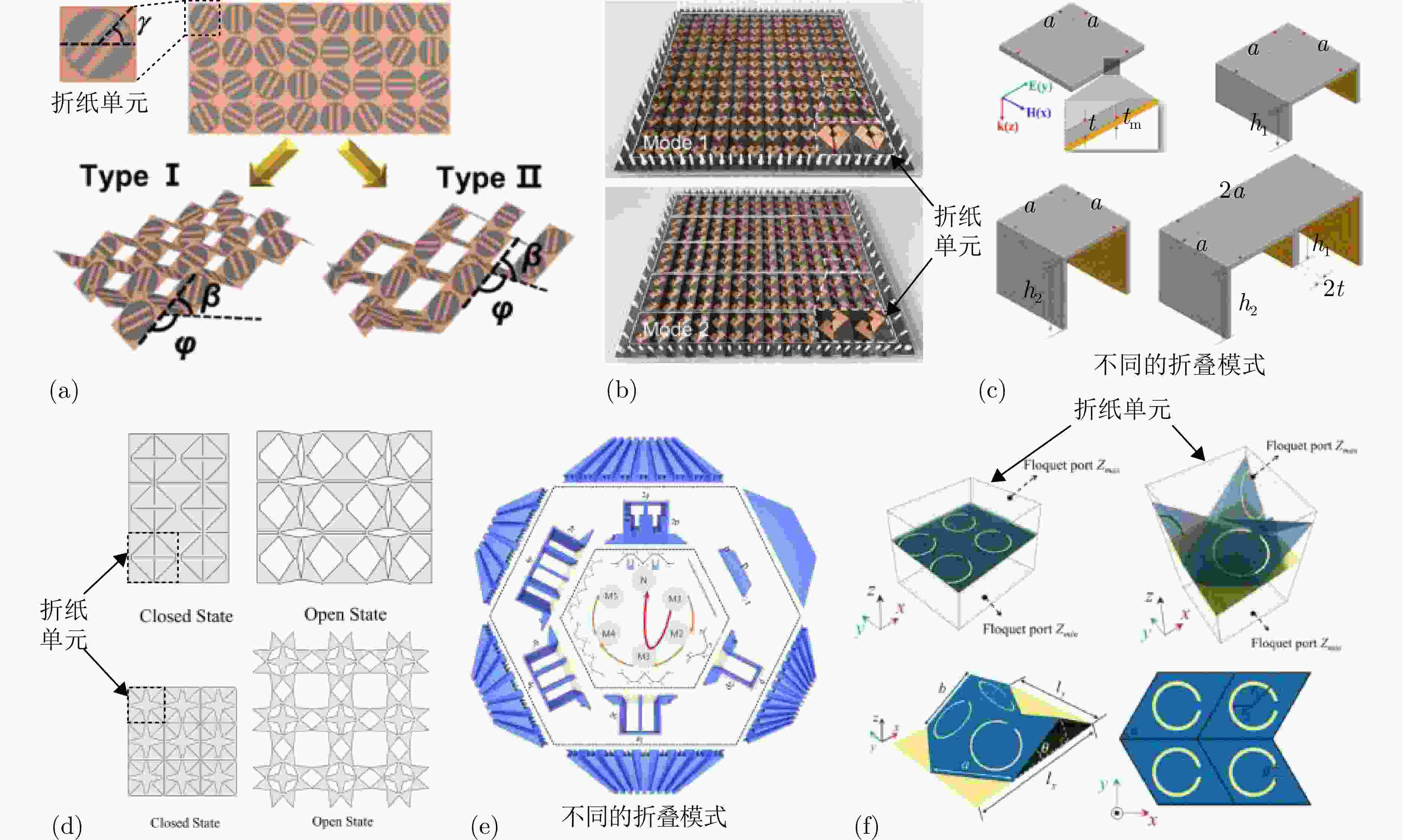 图 3 基于折纸的动态调控方法:(a) 多功能可重构梯度超表面结构示意图[111];(b) 多功能可重构超表面结构示意图[112];(c) 在反射器和频率选择吸收器之间相互转换的可编程超材料结构示意图[113];(d) 透射率和发射光谱可调的频率选择表面结构示意图[114];(e) 带宽可调的可重构吸收器结构示意图[115];(f) 可重构极化转换超表面结构示意图[116]