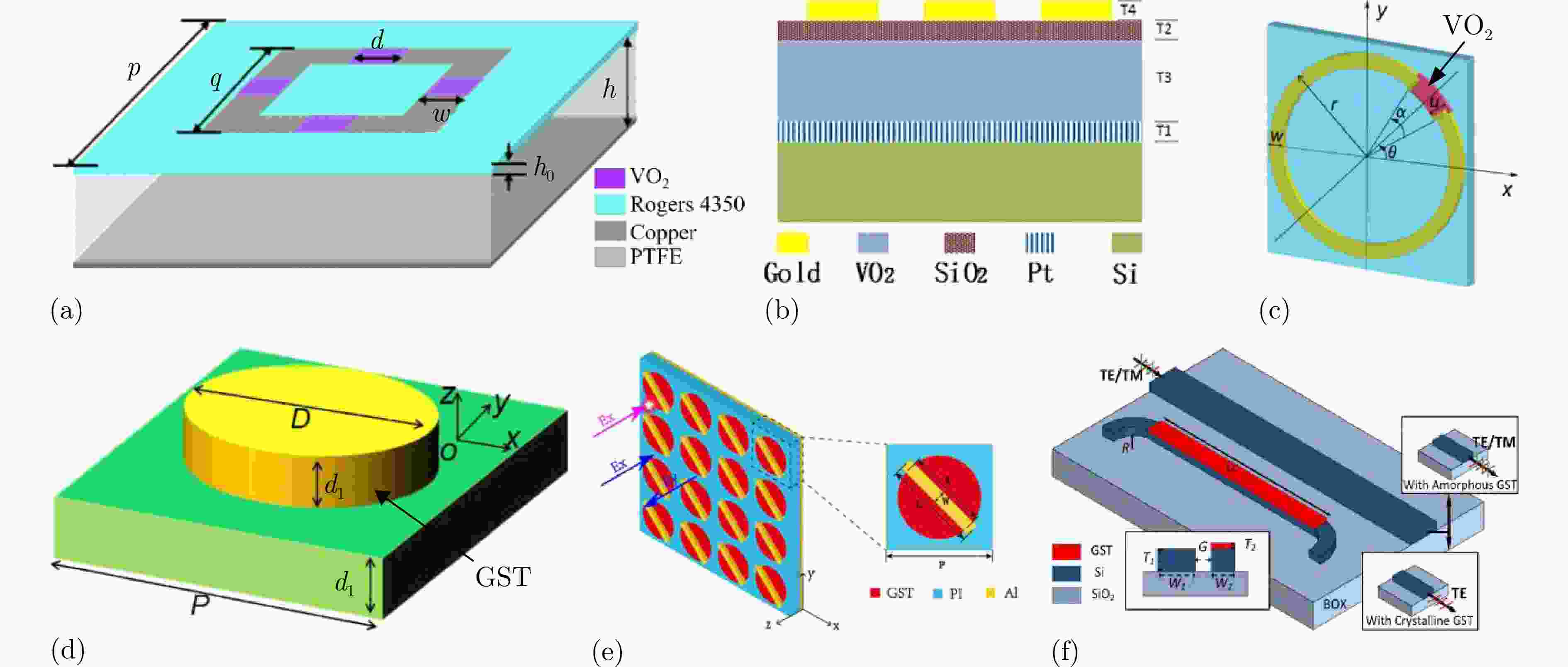 图 4 基于相变材料的动态调控方法:(a) 基于VO2薄膜的热控吸收超表面结构示意图[117];(b) 基于VO2薄膜的可调控太赫兹超材料结构示意图[118];(c) 宽带动态全息成像超表面结构示意图[119];(d) 由硅基板和GST圆柱阵列组成的可调控太赫兹超材料结构示意图[122];(e) 宽带极化转换和吸收相互切换的热控超表面结构示意图[123];(f) 基于非对称定向耦合器的超低插入损耗有源偏振器结构示意图[124]
