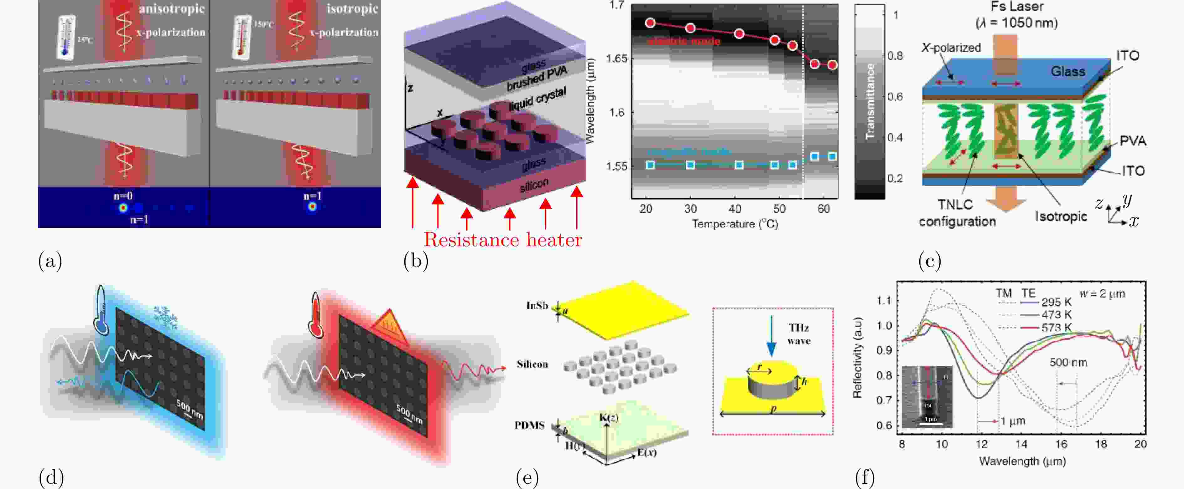 Figure 5. Dynamic control methods based on liquid crystal and semiconductor: (a) Schematic diagram of tunable dual-layered metasurface based on liquid crystal[125]; (b) Schematic diagram of all-dielectric silicon nanodisk metasurface[126]; (c) Schematic diagram of all-optically controlled liquid-crystal metasurface[127]; (d) Schematic diagram of tunable all-dielectric metasurface operating in the communication wavelength range[128]; (e) Schematic diagram of tunable all-dielectric metasurface absorber based on InSb film[129]; (f) Schematic diagram of resonant structure made of intrinsic InSb film on the highly doped InSb substrate[130]