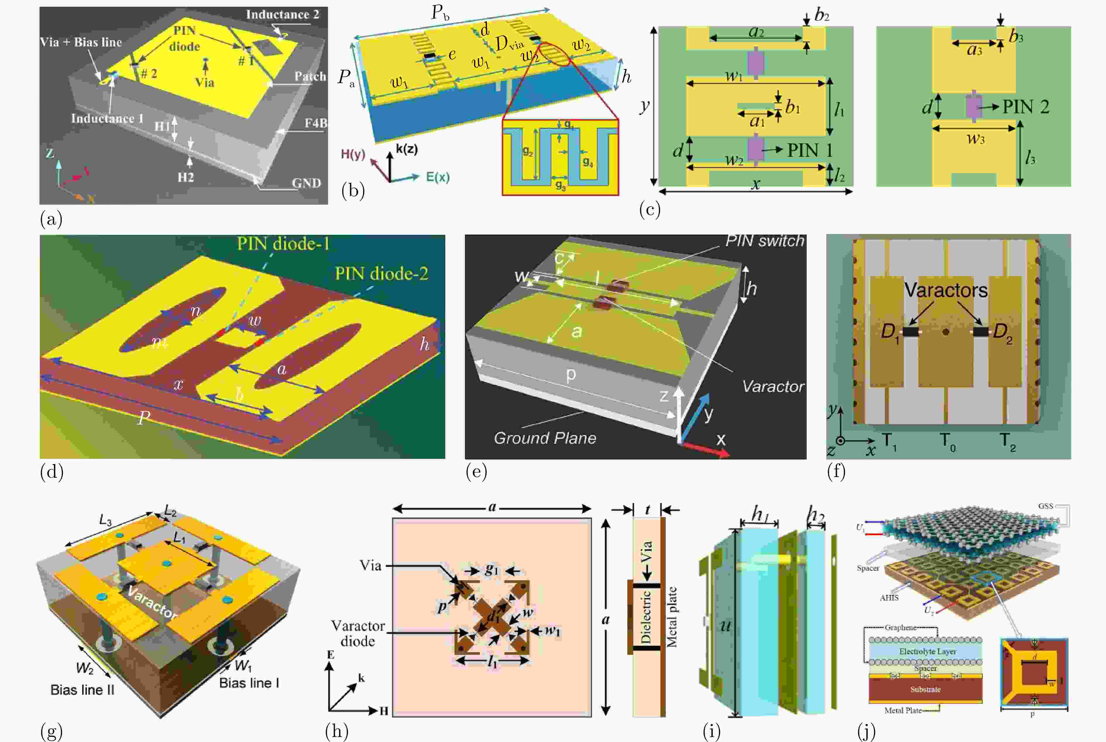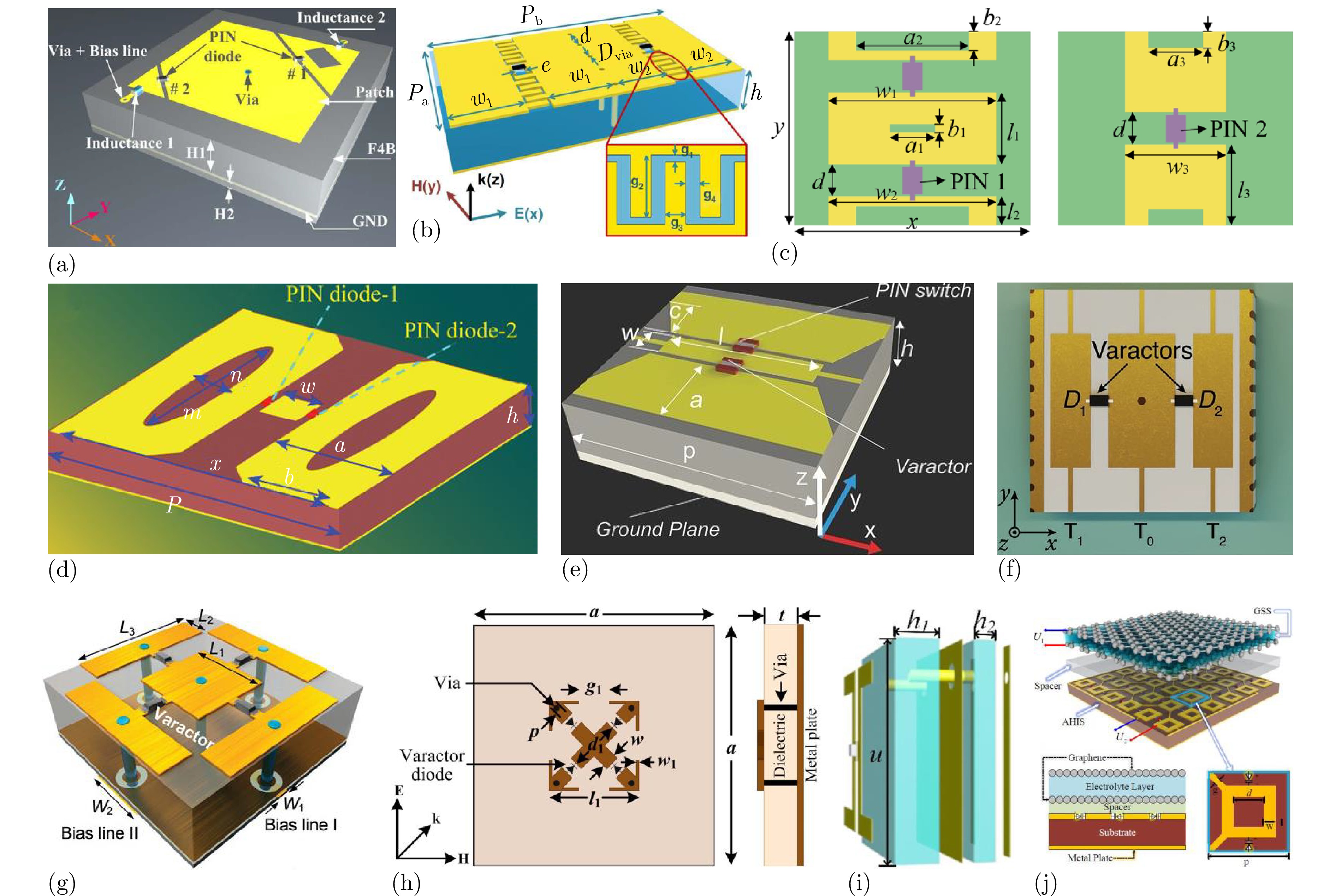 图 6 基于电控集总器件的动态调控方法:(a) 在频域和空域内具有可重构特性的超表面结构示意图[134];(b) 产生各种调频连续波信号的时空编码超表面结构示意图[135];(c) 实现反射、透射和吸收的有源超表面结构示意图[136];(d) 独立操纵反射幅度和相位的超表面结构示意图[137];(e) 实现波束分裂、波束偏转和极化变换的可重构超表面结构示意图[138];(f) 可调控多功能超表面结构示意图[140];(g) 具有模块化控制电路的双可编程超表面结构示意图[141];(h) 加载变容二极管的可调控单双频超表面吸收器结构示意图[142];(i) 基于多光谱检测的自适应可重构多波束反射超表面结构示意图[143];(j) 在宽带范围内连续独立调控谐振吸收的幅度和频率的可调控超表面结构示意图[144]