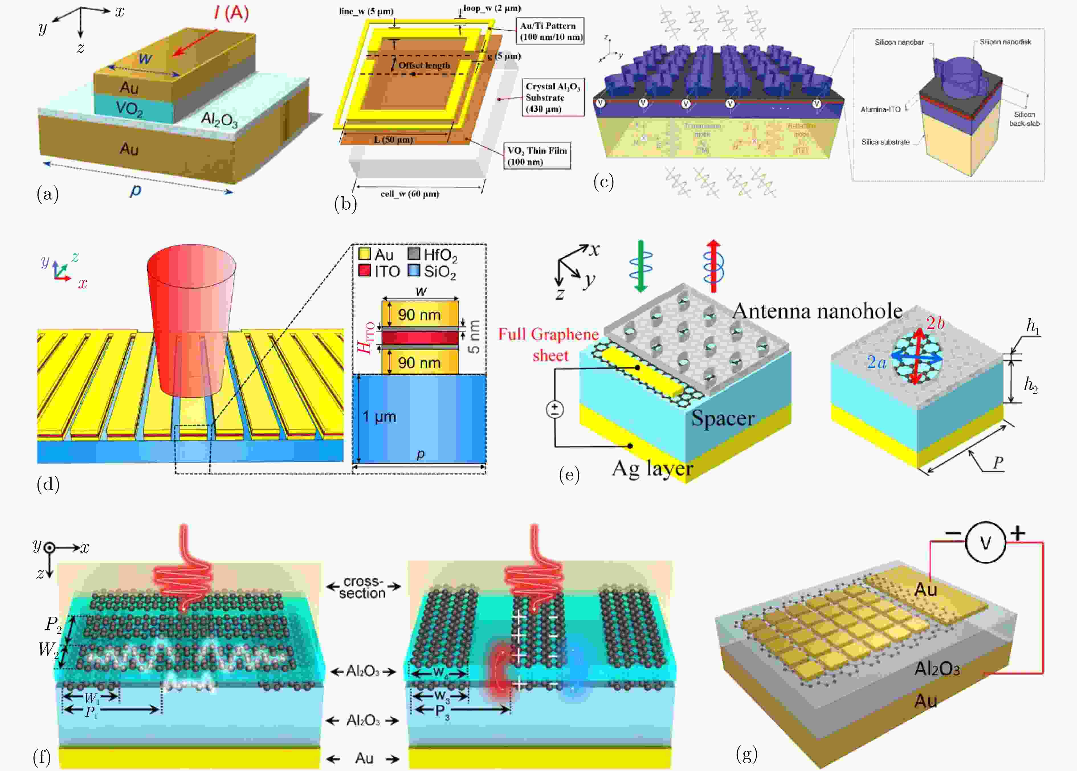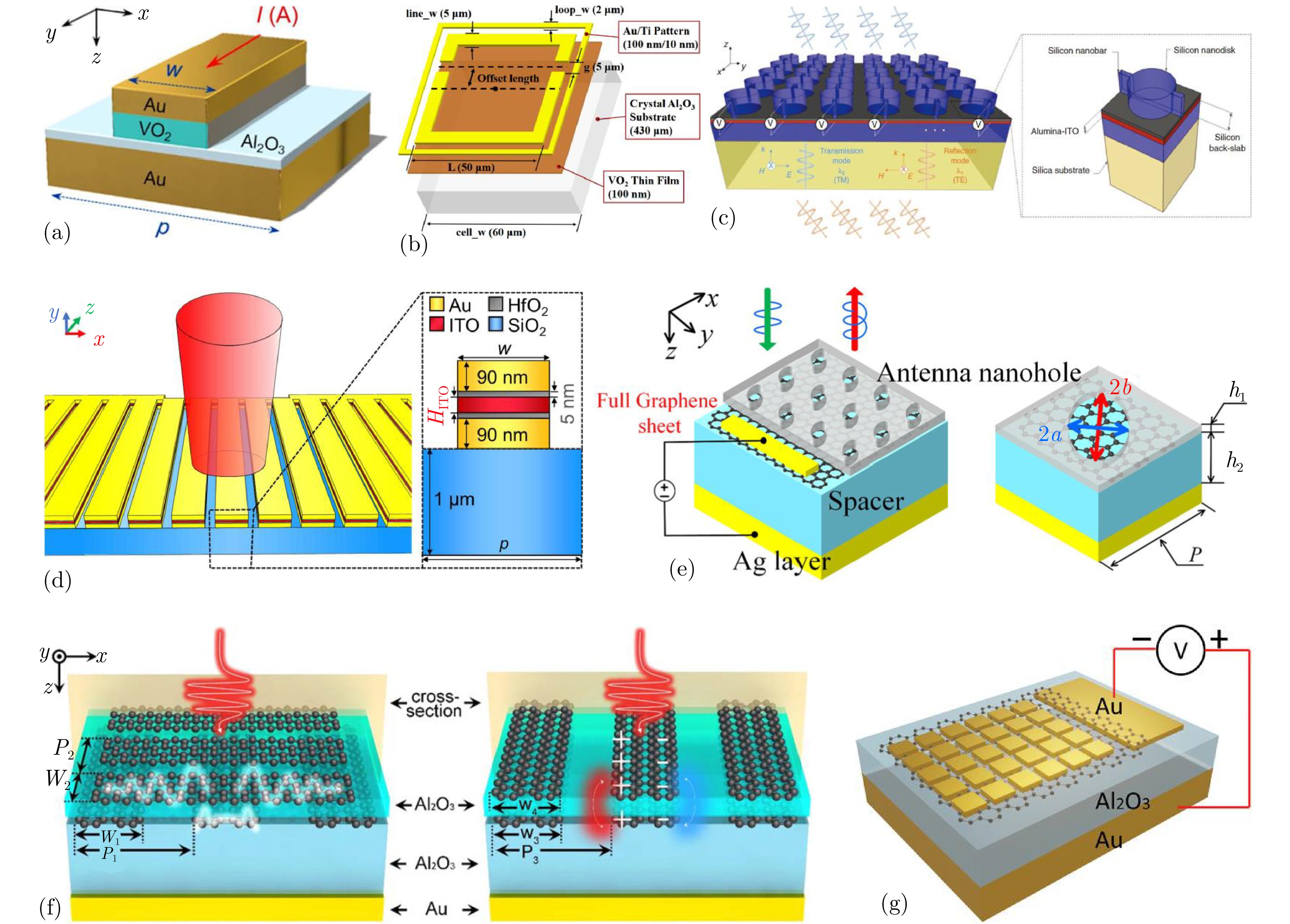 图 7 基于电控材料的动态调控方法:(a) 在近红外波长范围内连续调制反射相位的动态可调超表面结构示意图[145];(b) 基于VO2薄膜的外方环非对称分环谐振器结构示意图[146];(c) 基于铟锡氧化物的电控全介质超表面结构示意图[147];(d) 基于导电氧化物的异质结构超表面结构示意图[148];(e) 基于石墨烯超表面的新型电控红外光调制器结构示意图[149];(f) 石墨烯-氧化铝-石墨烯堆叠组成的超材料结构示意图[150];(g) 电控混合石墨烯超表面结构示意图[151]