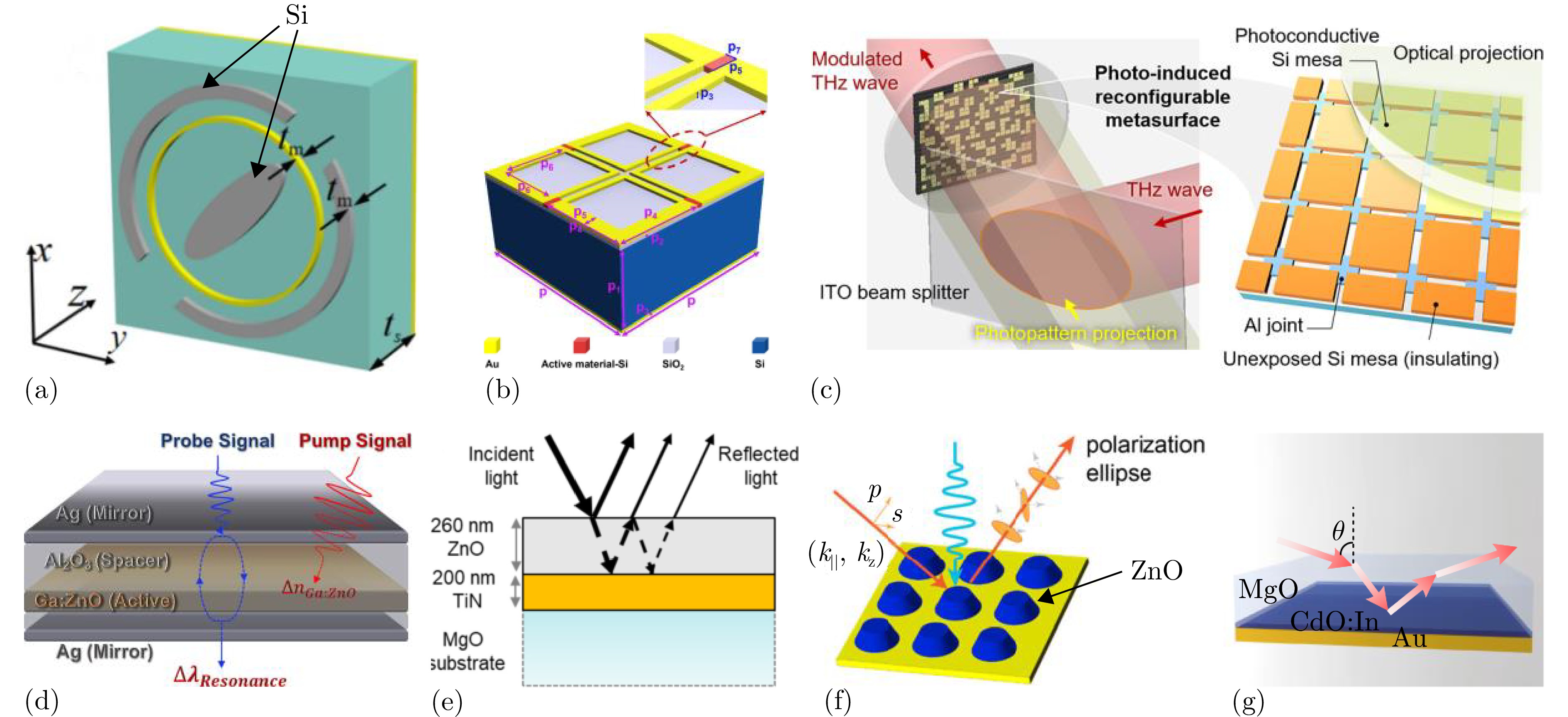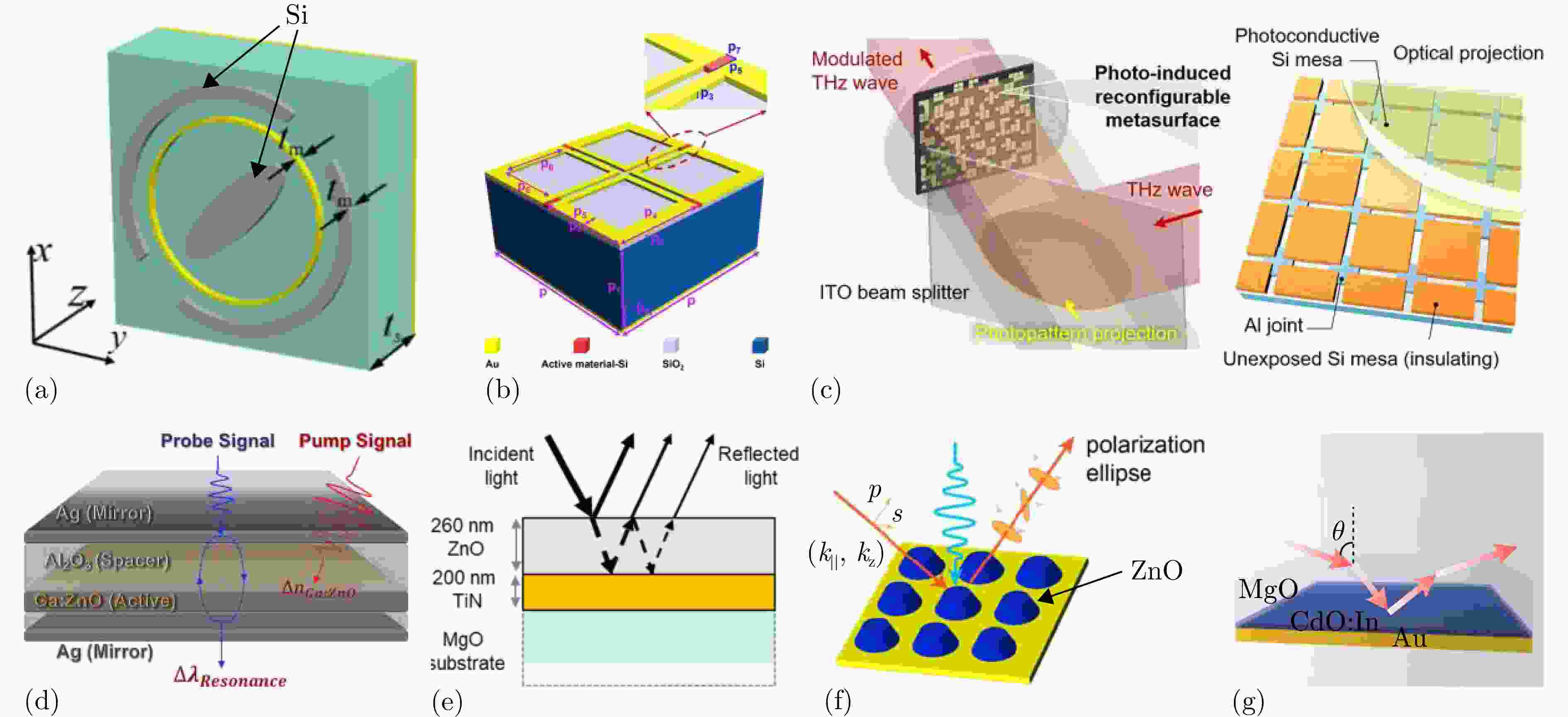 图 8 基于光控材料的动态调控方法:(a) 在不同频率上独立实现圆极化波的极化转换和波束偏转的光控超表面结构示意图[152];(b) 调制谐振频率、反射相位以及反射幅值的硅基太赫兹超表面调制器结构示意图[153];(c) 显著消除光激发载流子的横向扩散的光控超表面原理示意图[154];(d) 实现Fabry-Perot纳米腔静态和动态控制的结构示意图[155];(e) 基于光激励产生的自由载流子改变氧化锌薄膜介电常数原理示意图[156];(f) 基于ZnO的极化调制器结构示意图[157];(g) 在2.08 μm波长处具有高质量因子的Berreman型完美吸收器结构示意图[158]