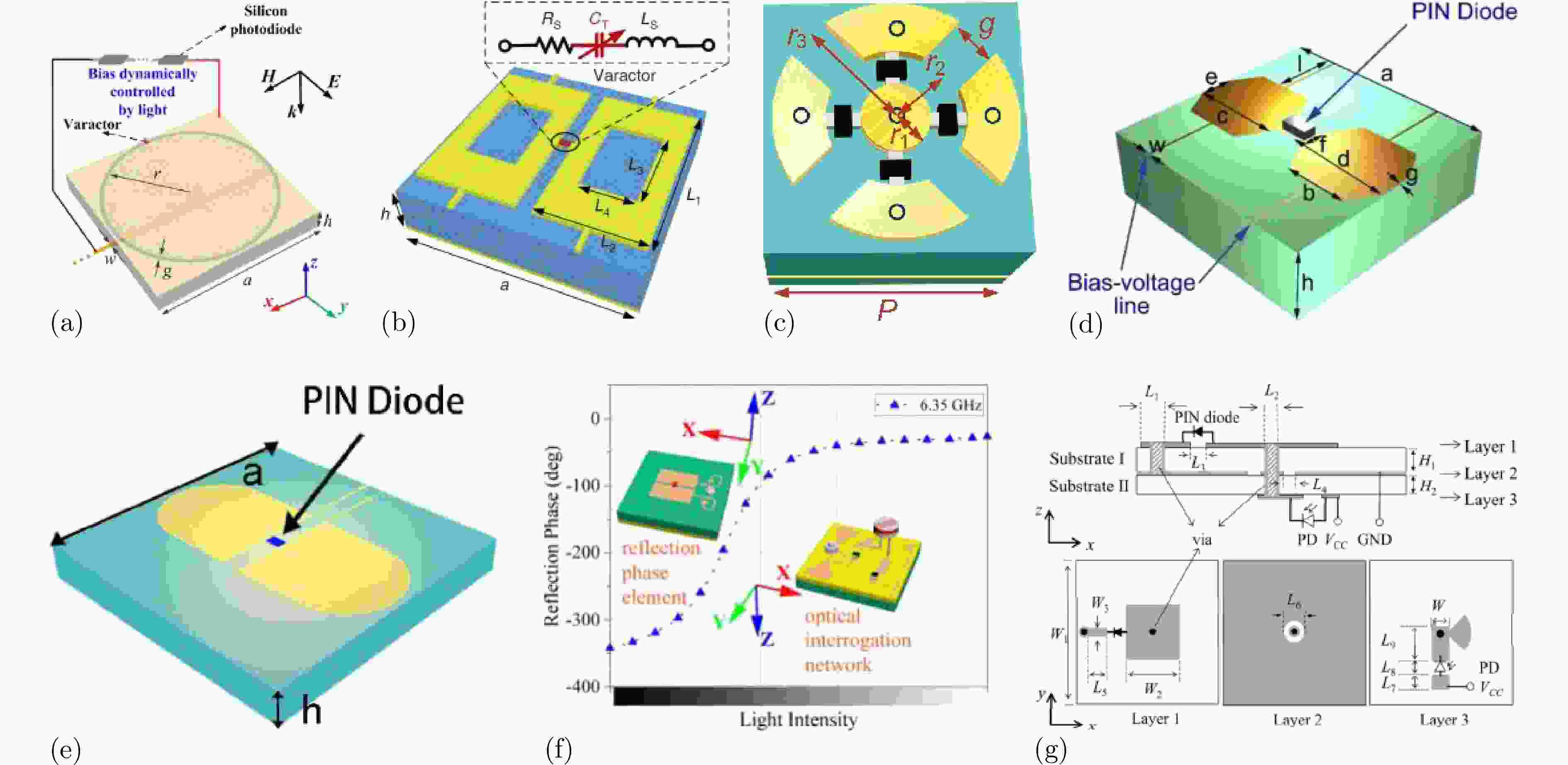 图 9 基于光控集总器件的动态调控方法:(a) 在不同频段上实现电磁波传输状态自由切换的光控数字编码超表面结构示意图[159];(b) 实现微波隐身、电磁错觉及涡旋波束等电磁功能的数字编码超表面结构示意图[160];(c) 由高速光电检测电路与全极化动态超表面组成的光控时域数字编码超表面结构示意图[161];(d) 由光敏电阻和电压模块组成的数字编码超表面结构示意图[162];(e) 基于紫外传感器的可编程超表面结构示意图[163];(f) 集成变容二极管和光敏电阻的光控超表面结构示意图[164];(g) 光控可重构微带反射天线结构示意图[165]