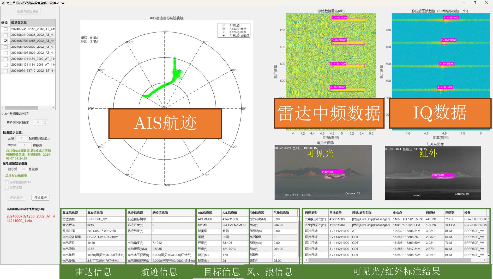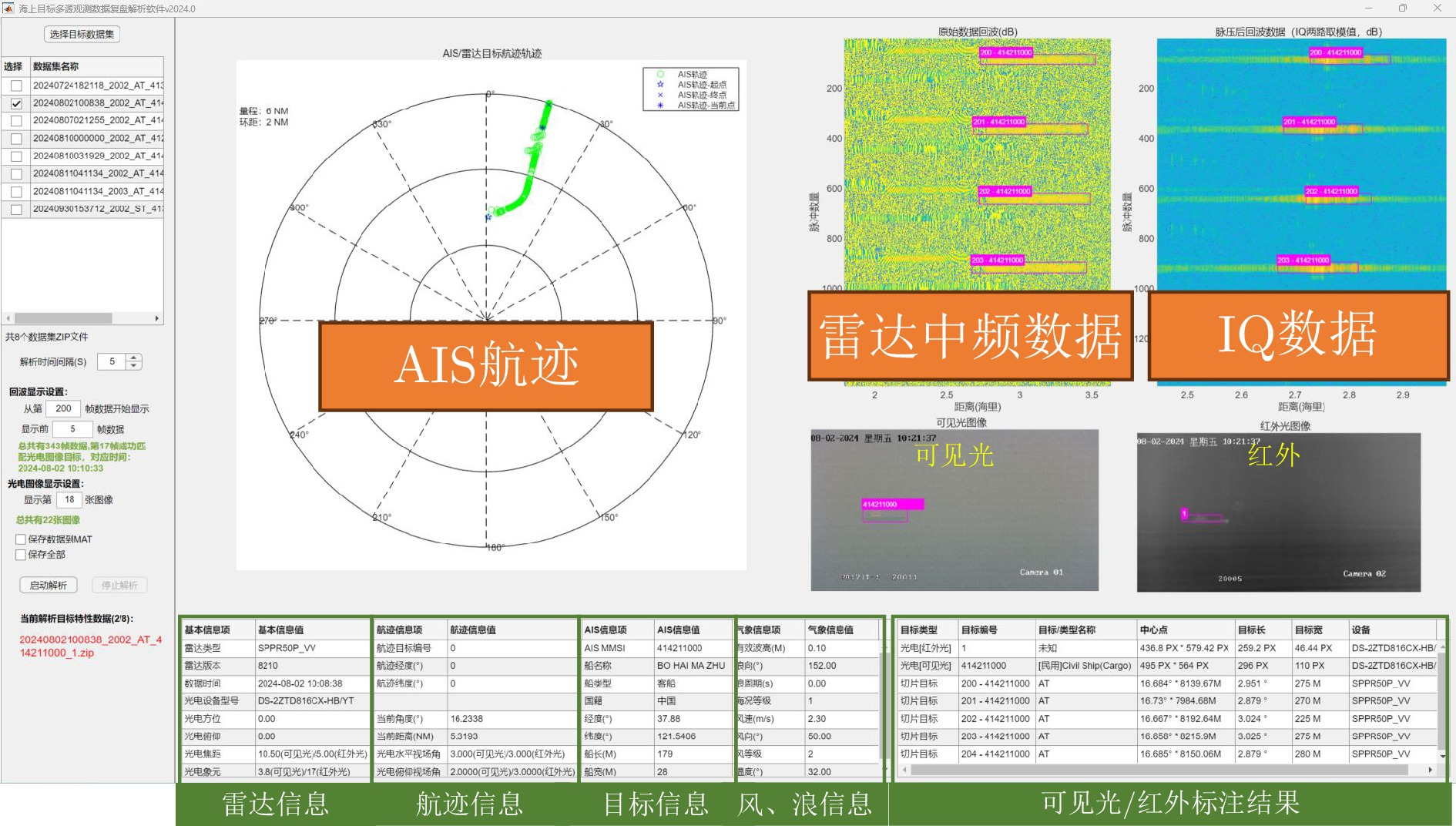 0表示不存在此数据)雷达原始中频数据(解调脉压前)标志位 雷达中频数据(解调脉压后)标志位 雷达包络数据标志位 雷达航迹数据标志位 雷达航迹报文类型标志位 AIS数据标志位 ADS-B数据标志位 可见光图像/视频数据标志位 红外图像/视频数据标志位 雷达录屏数据标志位 气象水文(浪)数据标志位 气象水文(风)数据标志位 气象水文(温度)数据标志位 航姿仪数据标志位 备注文档(TXT)标志位 数据时间 数据时间 雷达设备信息 雷达品牌 雷达型号 雷达工作频率范围(GHz) 雷达俯仰波束宽度(°) 雷达方位波束宽度(°) 雷达极化方式 雷达脉冲重复频率(Hz) 雷达距离分辨率(m) 雷达发射增益(dB) 雷达STC设置 雷达天线工作方式 目标切片方位(相比于正北)范围(°) 目标切片距离范围(m) 雷达目标航迹信息 雷达目标航迹编号 雷达目标航迹经度 雷达目标航迹纬度 雷达目标速度 雷达目标对地航向(°) 目标AIS信息 船编号(AIS) 船名(AIS) 国籍(AIS) 船只类型(AIS) 船长(m)(AIS) 船宽(m)(AIS) 航行状态(AIS) 船只经度(AIS) 船只纬度(AIS) 船只时间(AIS,数据起始帧) 船只速度(AIS,数据起始帧) 船艏向(°)(AIS,数据起始帧) 对地航向(°)(AIS,数据起始帧) 光电数据信息 图像时间/视频起始对应的系统时间 可见光图像目标识别结果 红外图像目标识别结果 气象水文信息 有效浪高(m) 浪向(°) 海况等级 风速 风向(°) 风力等级 温度(°C) 天气 备用信息位 备用信息位 表 7 船只目标数据分类