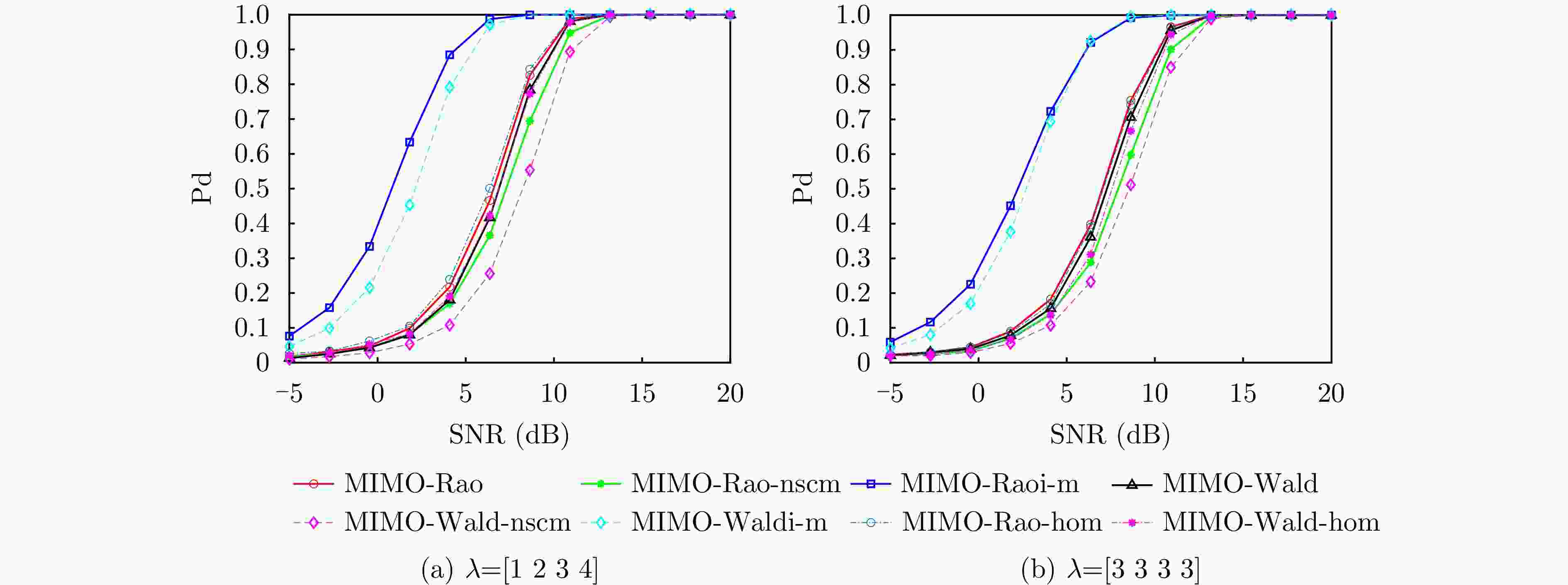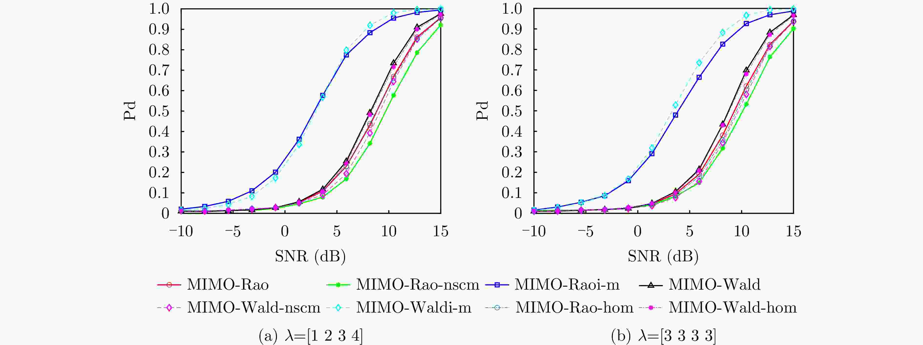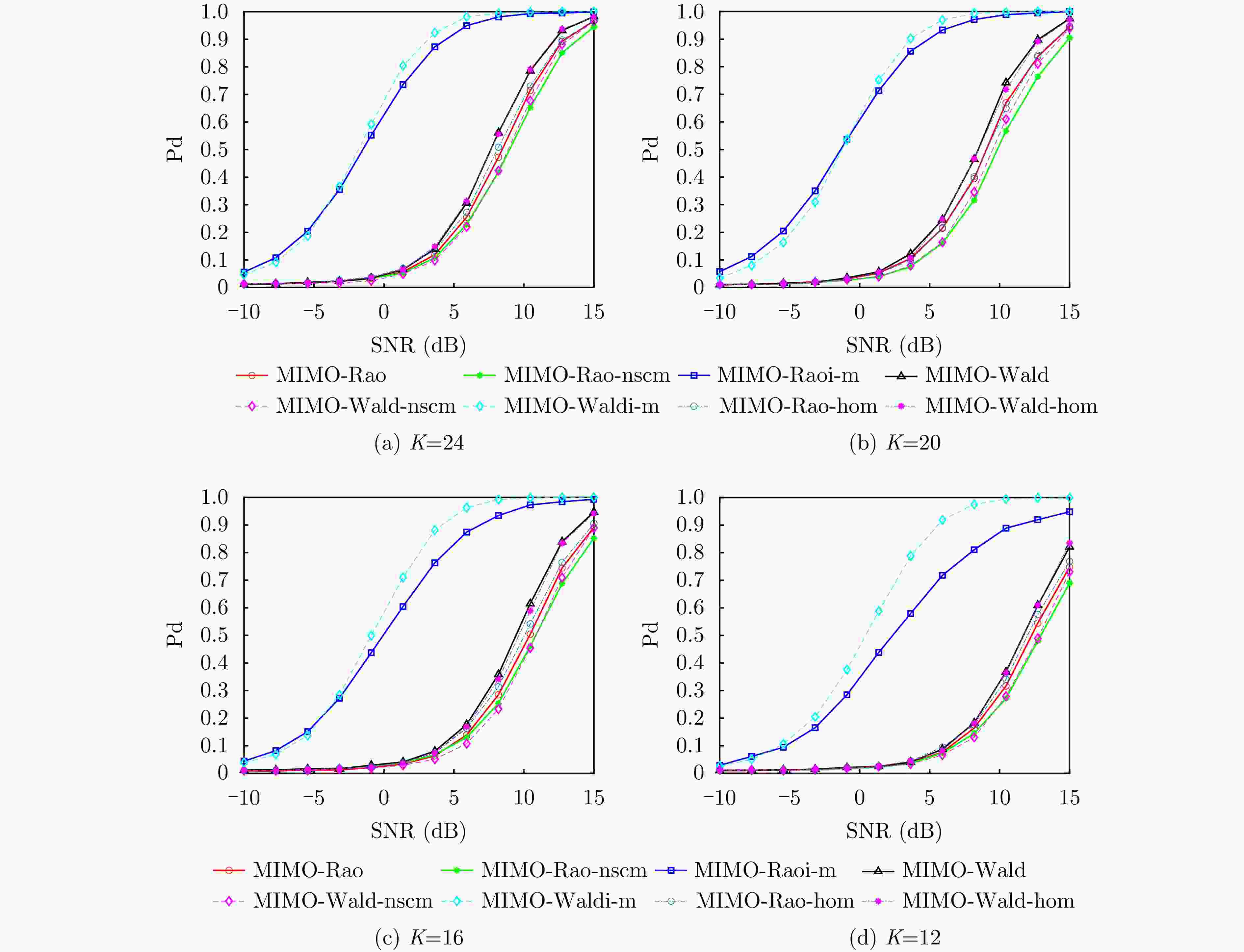 MIMO-Wald-nscm$O(MN({L^3} + {L^2}K + LK))$ MIMO-Raoi-m与MIMO-Waldi-m $O(MN ({L^3} + {L^2}K + K\log_2 K))$ -