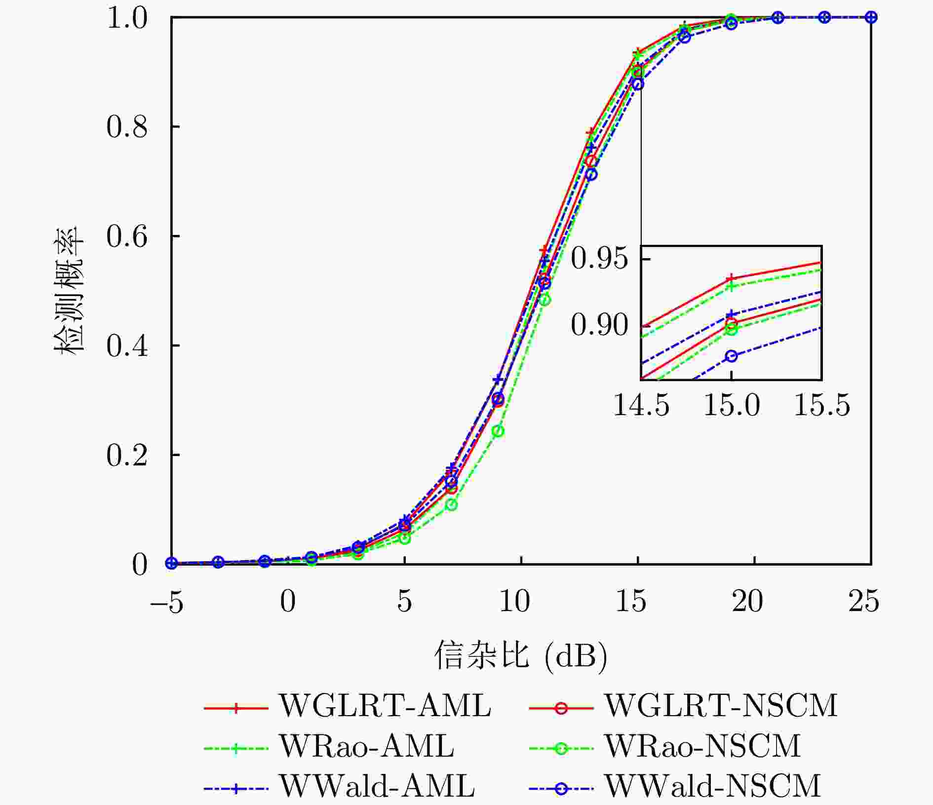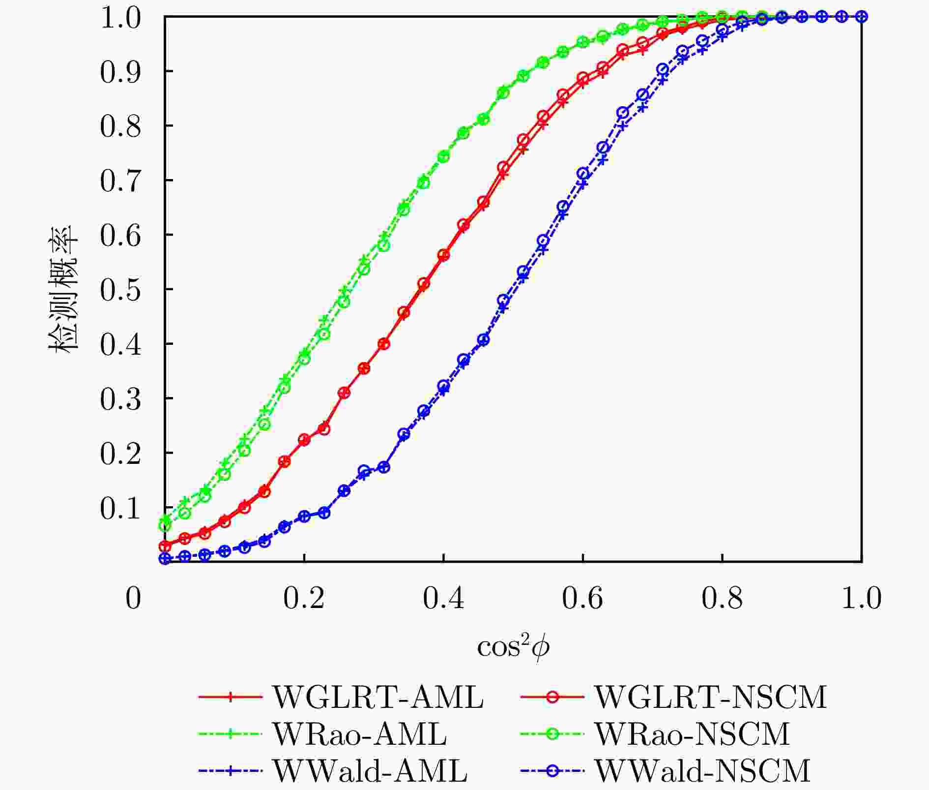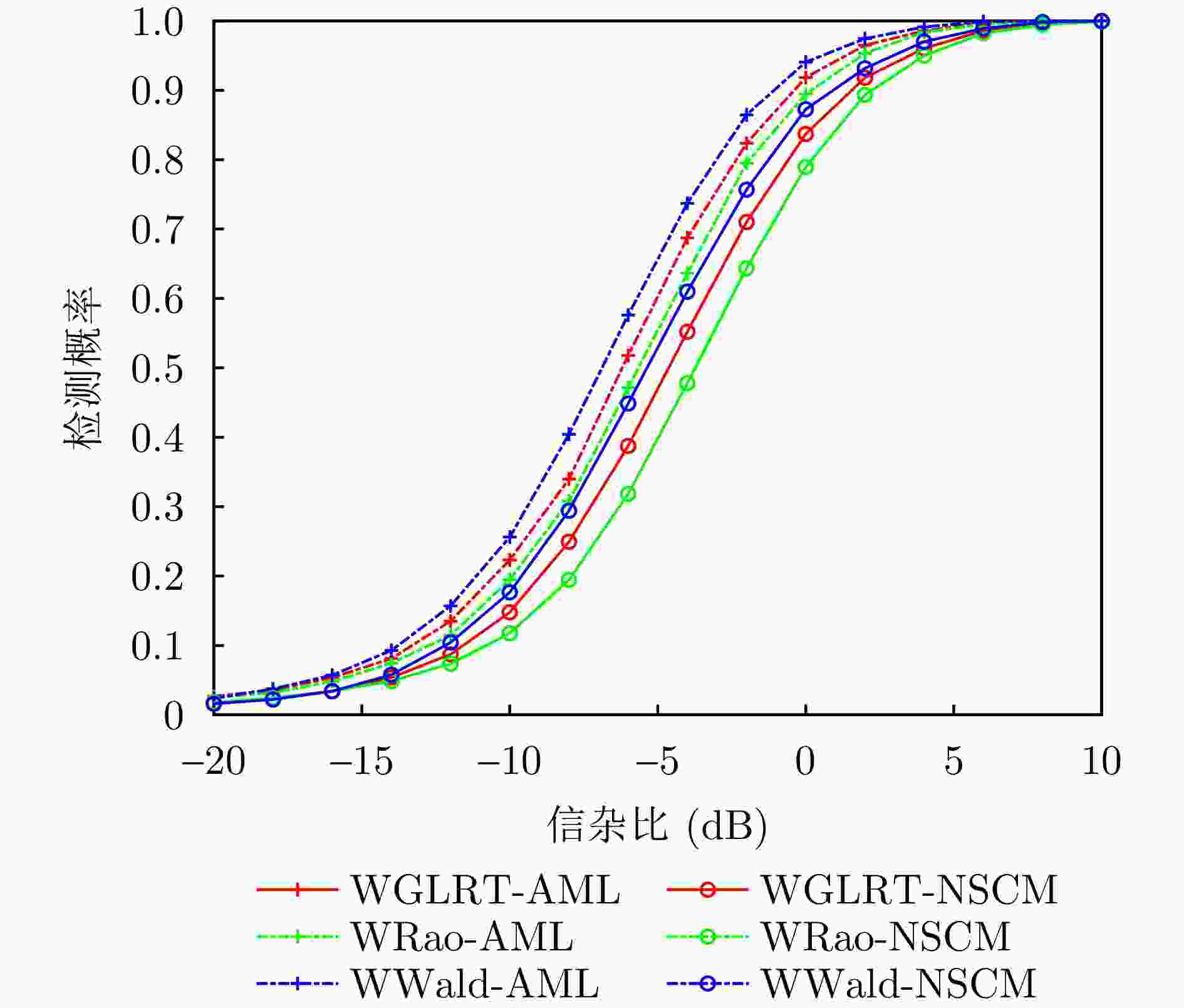 摘要: 该文研究了复合高斯杂波中距离扩展目标的自适应检测问题,其中杂波纹理分量服从加权广义逆高斯(WGIG)分布。该文基于两步Rao, Wald, Durbin和Gradient检验分别设计加权广义逆高斯杂波下的自适应检测器。针对未知协方差矩阵,分别采用近似最大似然(AML)和归一化采样协方差矩阵(NSCM)两种方法进行估计。由于纹理分量的最大后验(MAP)估计难以解析求解,因此在Rao, Wald和Durbin检验的检测器设计中,采用纹理分量的倒数期望的MAP进行替代;而在Gradient检验的检测器设计中,则基于后验概率密度函数推导检验统计量。理论分析表明,基于Rao, Durbin和Gradient检验所得到的检测器具有一致性。在性能评估方面,通过仿真数据和实测数据,分别对无信号失配和存在信号失配两种情况下的检测性能进行了系统评估。实验结果表明:(1)该文提出的基于AML的检测器均具有恒虚警率(CFAR)特性;(2)在无信号失配情况下,基于Rao准则和Wald准则的检测器在两种实测数据集上分别表现出最优的检测性能,并且相较于两步GLRT检测器的检测性能分别提升0.1~0.5 dB和0.7~0.8 dB;(3)在信号失配情况下,基于Rao准则与AML估计的检测器具有最佳的稳健性,而基于Wald准则的检测器对失配信号表现出最强的抑制能力。Abstract: In this paper, we investigate the adaptive detection of range-distributed targets in compound-Gaussian clutter, where the texture component follows a Weighted Generalized Inverse Gaussian (WGIG) distribution. We propose adaptive detectors for WGIG-distributed clutter based on two-step Rao, Wald, Durbin, and Gradient tests. The unknown covariance matrix is estimated using Approximate Maximum Likelihood (AML) and the Normalized Sample Covariance Matrix (NSCM). To address the analytical intractability of Maximum A Posteriori (MAP) estimation for the texture component, we adopt an alternative approach: The MAP estimator of the reciprocal expectation of the texture component, which is used in designing adaptive detectors based on the Rao, Wald, and Durbin tests. For the Gradient test-based detector, the test statistic is derived directly from the posterior probability density function. Our theoretical analysis confirms the consistency of the detectors derived from the Rao, Durbin, and Gradient tests. Extensive evaluations on both simulated and real data yield three key findings: (1) The proposed AML-based detectors maintain the constant false alarm rate property; (2) Under matched signal conditions, the detectors based on the Rao and Wald tests achieve the best performance on both the IPIX radar dataset and the Journal of Radar’s maritime surveillance dataset—specifically, they outperform the two-step generalized likelihood ratio test-based detector, requiring 0.1~0.5 dB and 0.7~0.8 dB lower Signal-to-Clutter Ratio (SCR) to achieve the same detection probability, respectively; and (3) Under mismatched signal conditions, the Rao test-based detector with AML estimation exhibits superior robustness, while the Wald test-based detector demonstrates the strongest suppression capability against mismatched signals.