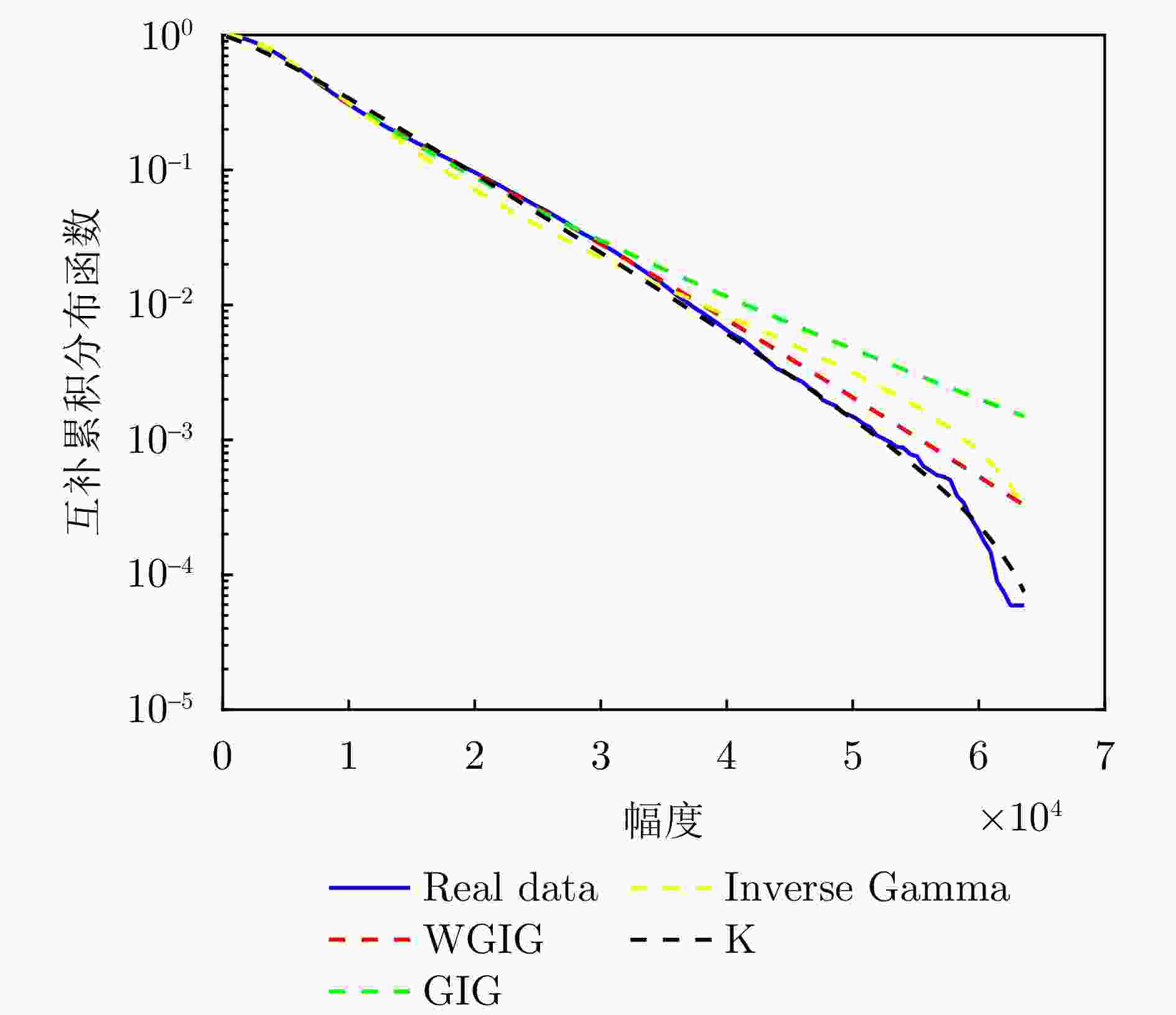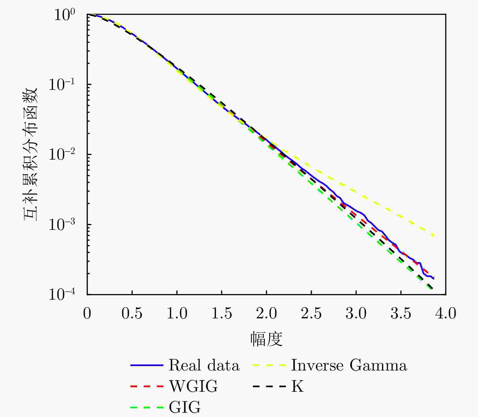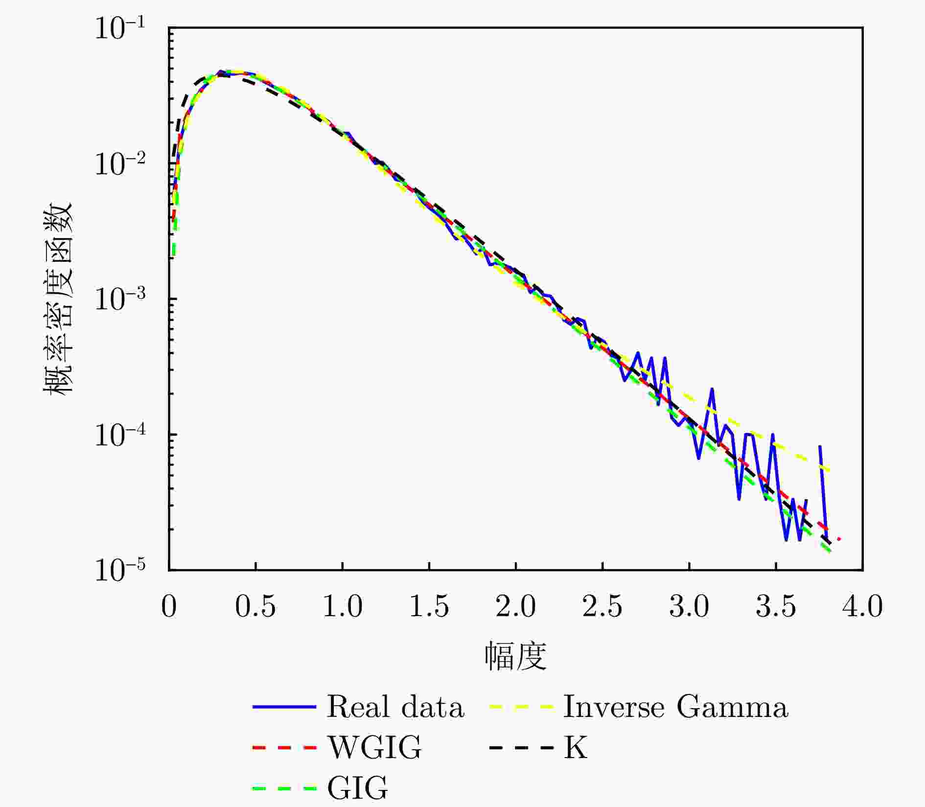 20221112175025 _stre_VV sea clutter模型 参数 MSE WGIG $ {\boldsymbol{w}} = \left[ \begin{gathered} 0.5514 \\ 0.4486 \\ \end{gathered} \right] $, $ a = \left[ \begin{gathered} 1.0905{\text{E}}-06 \\ 1.0434{\text{E}}-08 \\ \end{gathered} \right] $, $ {\boldsymbol{b}} = \left[ \begin{gathered} {\text{1}}{\text{.1835E08}} \\ 1.6943{\text{E}}08 \\ \end{gathered} \right] $, $ {\boldsymbol{v}} = \left[ \begin{gathered} 18.0474 \\ 0.9568 \\ \end{gathered} \right] $ 3.4592E–06 GIG $a = 2.0837{\text{E}} - 09$,$b = 7.4187{\text{E}}07$, $ v = - 0.6409 $ 2.2676E–05 Inverse Gamma $\lambda = 1.5807$, $\beta = 9.8920{\text{E07}}$ 1.2227E–04 K $\lambda = - 0.2396$, $\beta = 7.0049{\text{E03}}$ 3.9341E–04 表 2 M = 2时各个分布模型拟合IPIX_