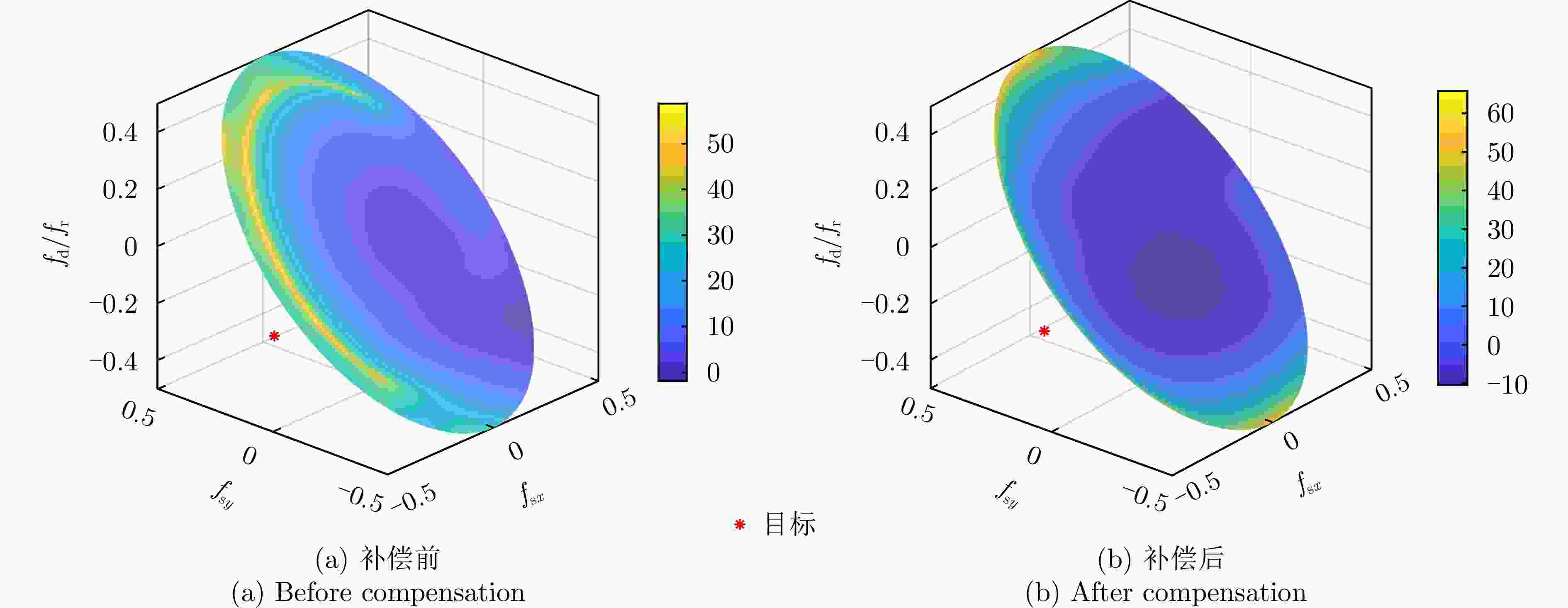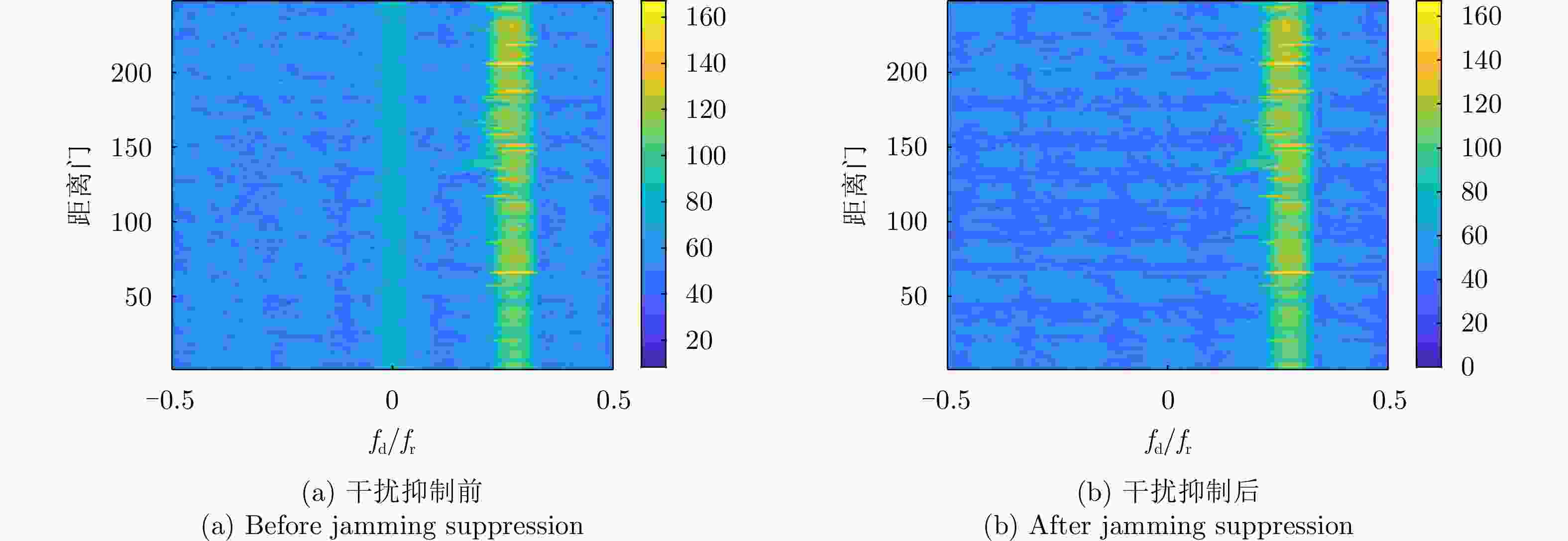 名称 符号 数值 载机高度 H 8 km 载机速度 V 140 m/s 脉冲数 K 100 接收机带宽 B 2.5 MHz 波长 λ 0.1 m 主波束方位角 θ0 90° 主波束俯仰角 $\varphi_0 $ 12° 脉冲重复频率 fr 12000 Hz占空比 D 0.1 表 4 干扰及目标仿真参数