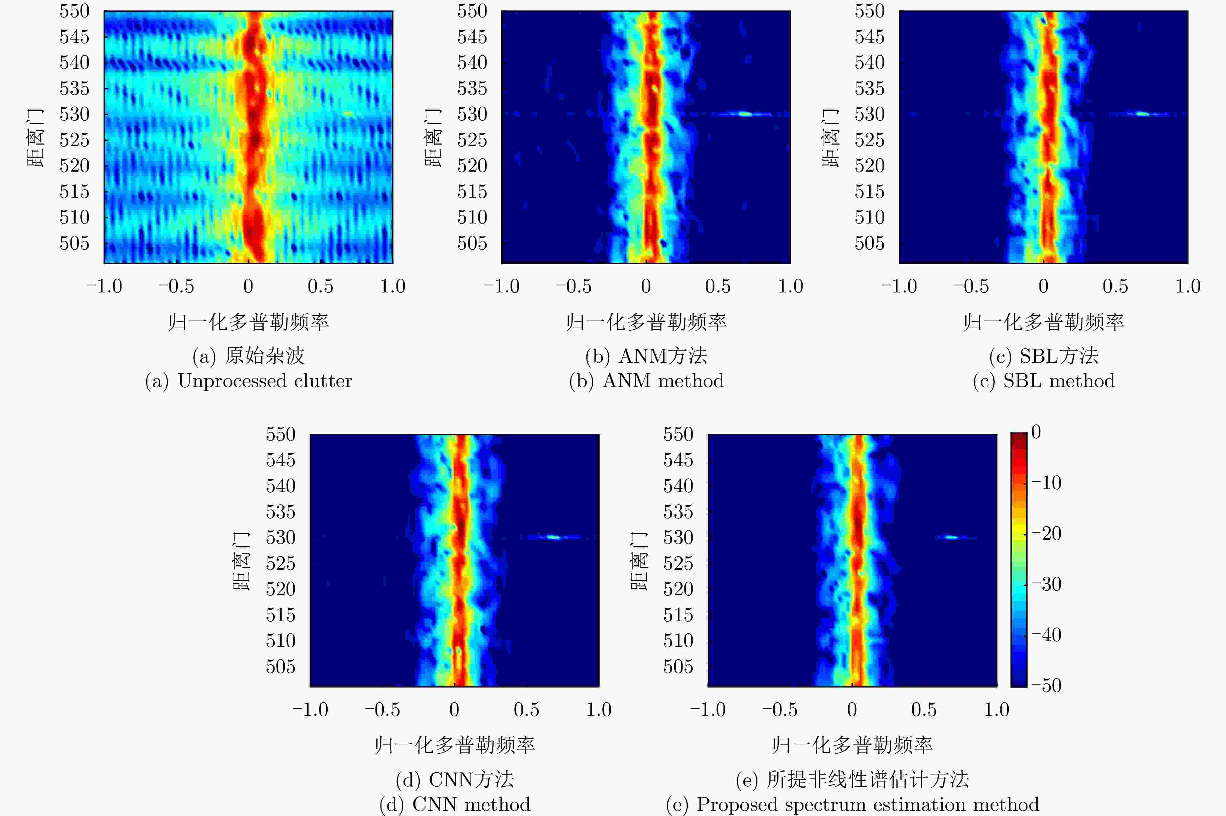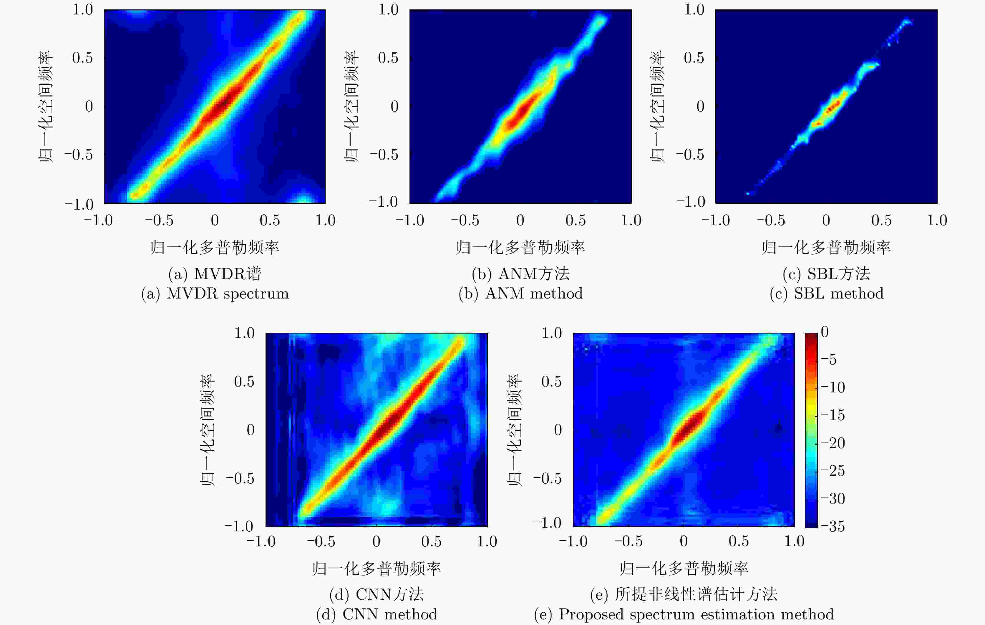 方法 运算复杂度 运行时间(s) FOCUSS $ O\left( {\left( {NK{N_{\text{S}}}{N_{\text{D}}} + {{\left( {NK} \right)}^3} + 2{{\left( {NK} \right)}^2}{N_{\text{S}}}{N_{\text{D}}} + NK{{\left( {{N_{\text{S}}}{N_{\text{D}}}} \right)}^2}} \right){I_{{\text{FOC}}}}} \right) $ 61.87 SBL $ O\left( {\left( {NK{N_{\text{S}}}{N_{\text{D}}} + {{\left( {NK} \right)}^3} + 3{{\left( {NK} \right)}^3}{N_{\text{S}}}{N_{\text{D}}} + 2NK{{\left( {{N_{\text{S}}}{N_{\text{D}}}} \right)}^2}} \right){I_{{\text{SBL}}}}} \right) $ 130.40 CNN $ O\left( {{\text{28777 }}{N_{\text{S}}}{N_{\text{D}}}} \right) $ 1.53 所提非线性空时谱估计方法 $ O\left( {{\text{12960 }}{N_{\text{S}}}{N_{\text{D}}}} \right) $ 0.79 表 2 脉冲压缩网络运算复杂度分析