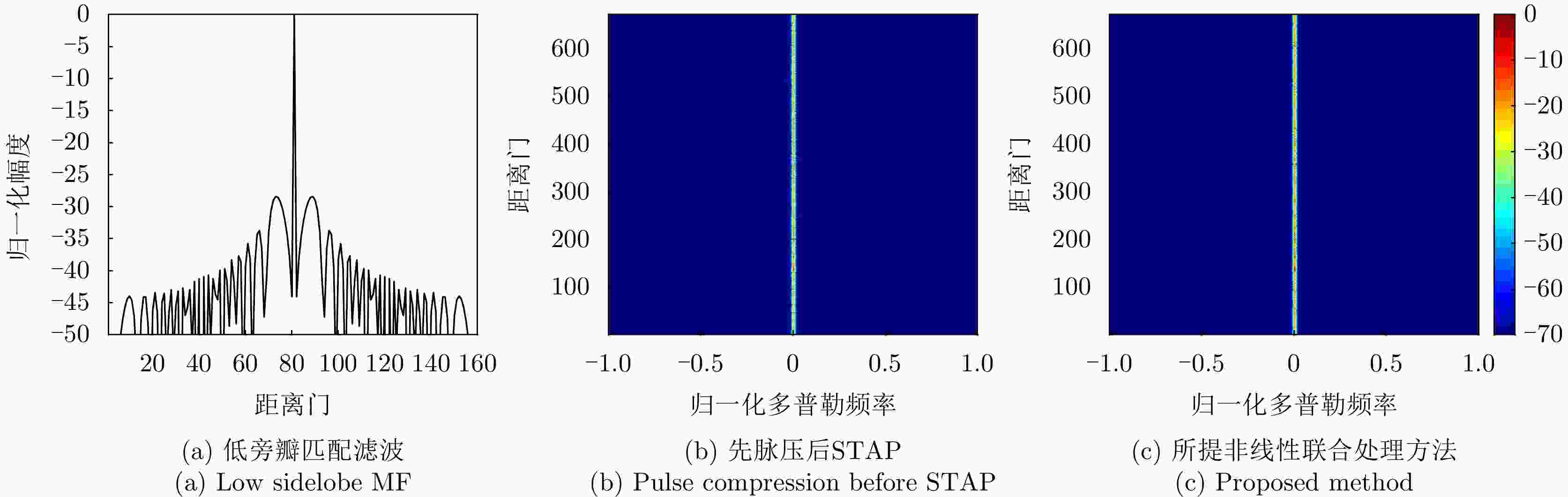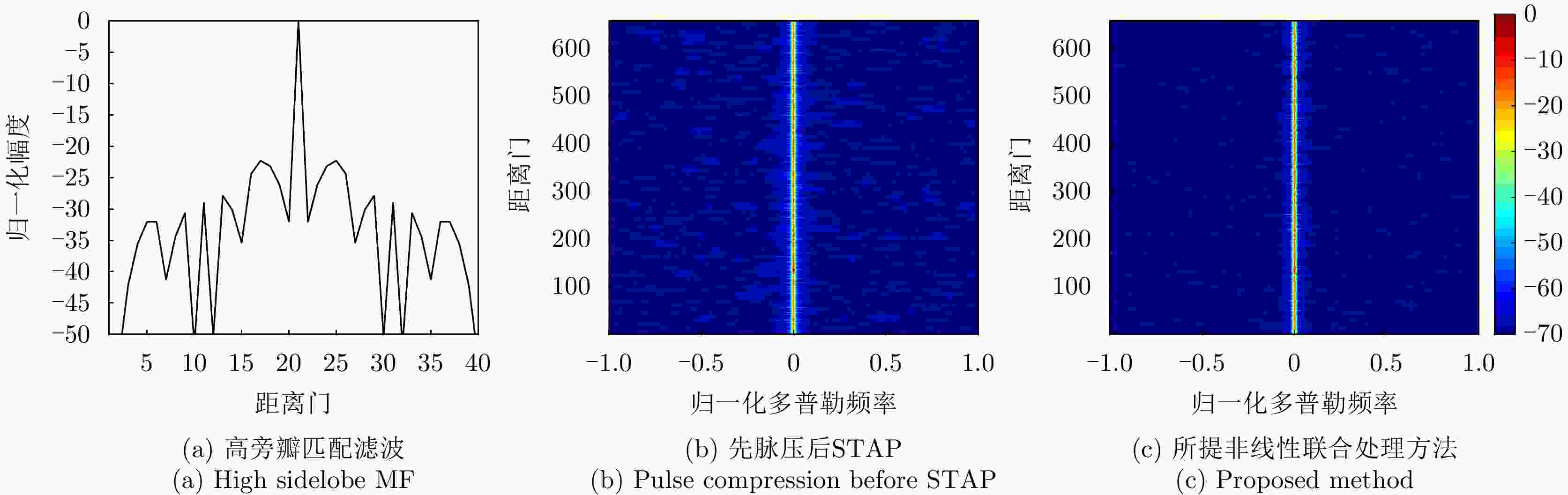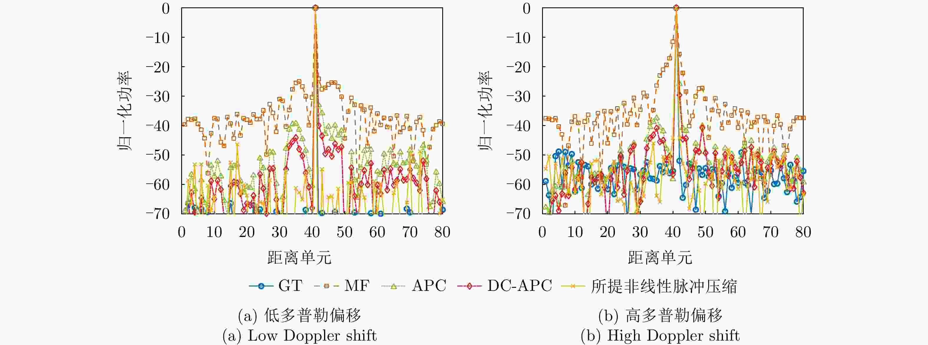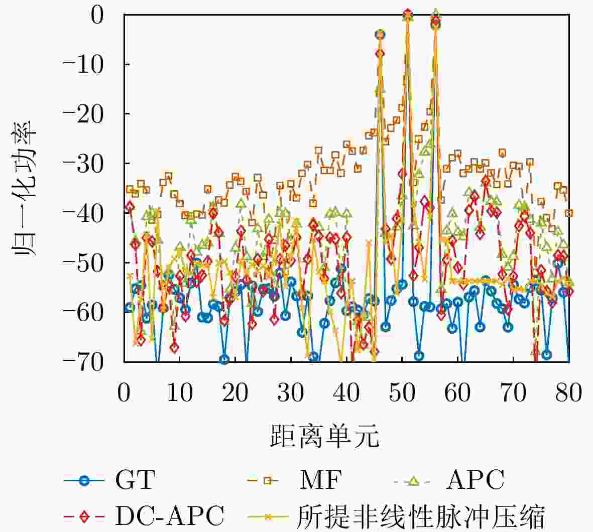方法 运算复杂度 运行时间(s) MF $O(P)$ 0.02 APC $O({P^3})$ 1.70 DC-APC $O({P^3})$ 1.83 所提非线性脉冲压缩 $O(3744P)$ 0.18 表 3 雷达系统参数