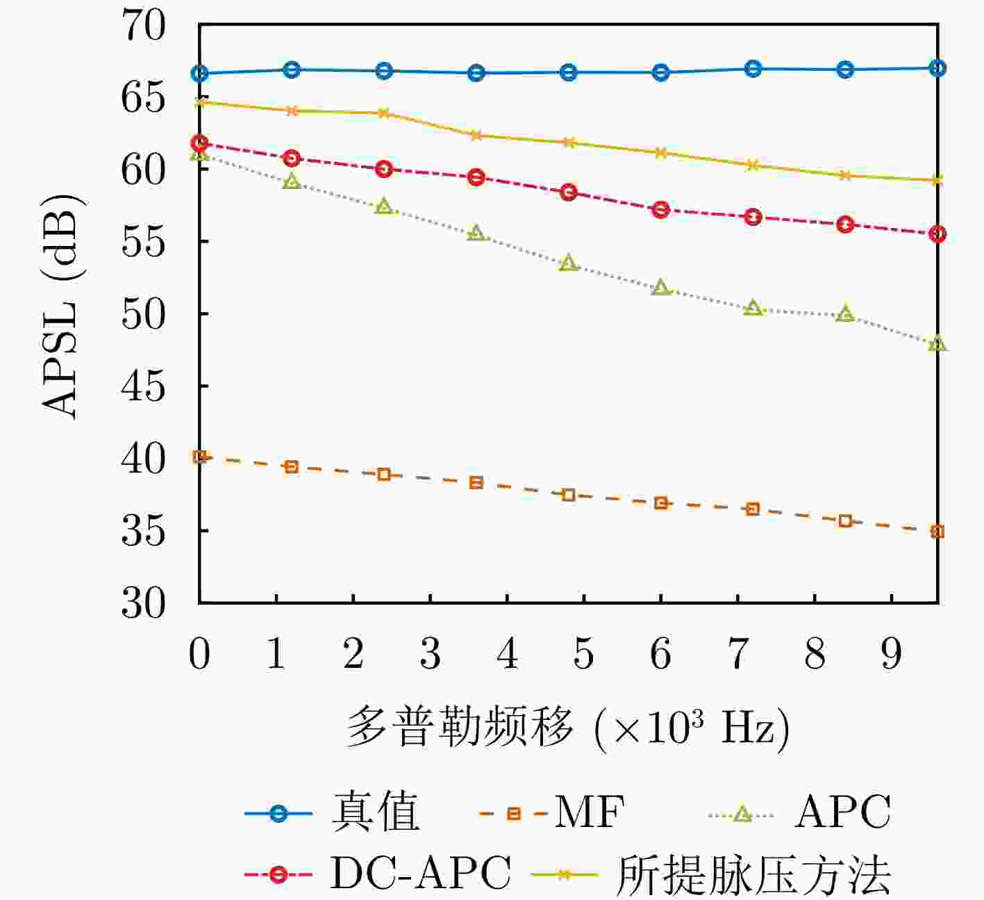 目标 距离门 SNR (dB) 多普勒频移(Hz) 目标1 46 25 120 目标2 51 29 1200 目标3 56 27 1920 表 5 各对比方法的APSL (dB)