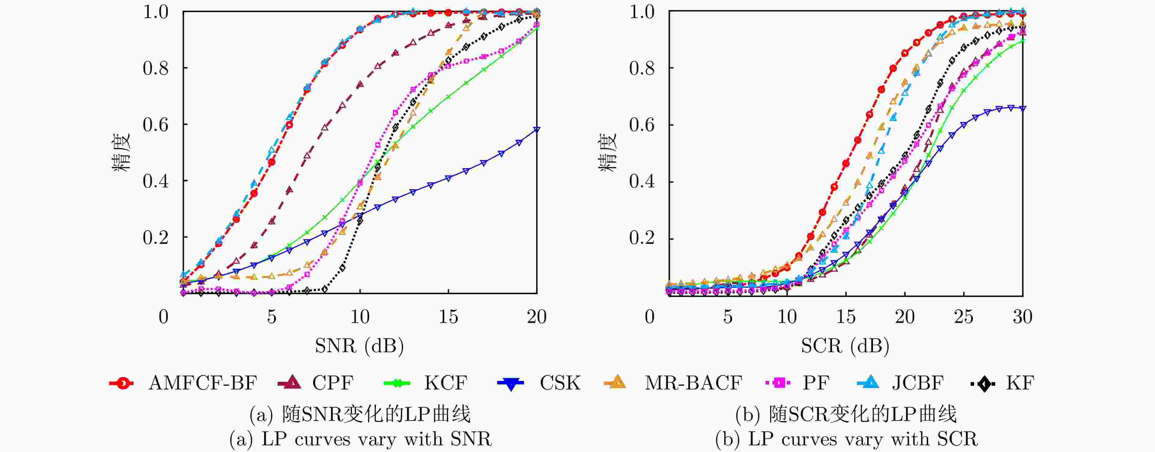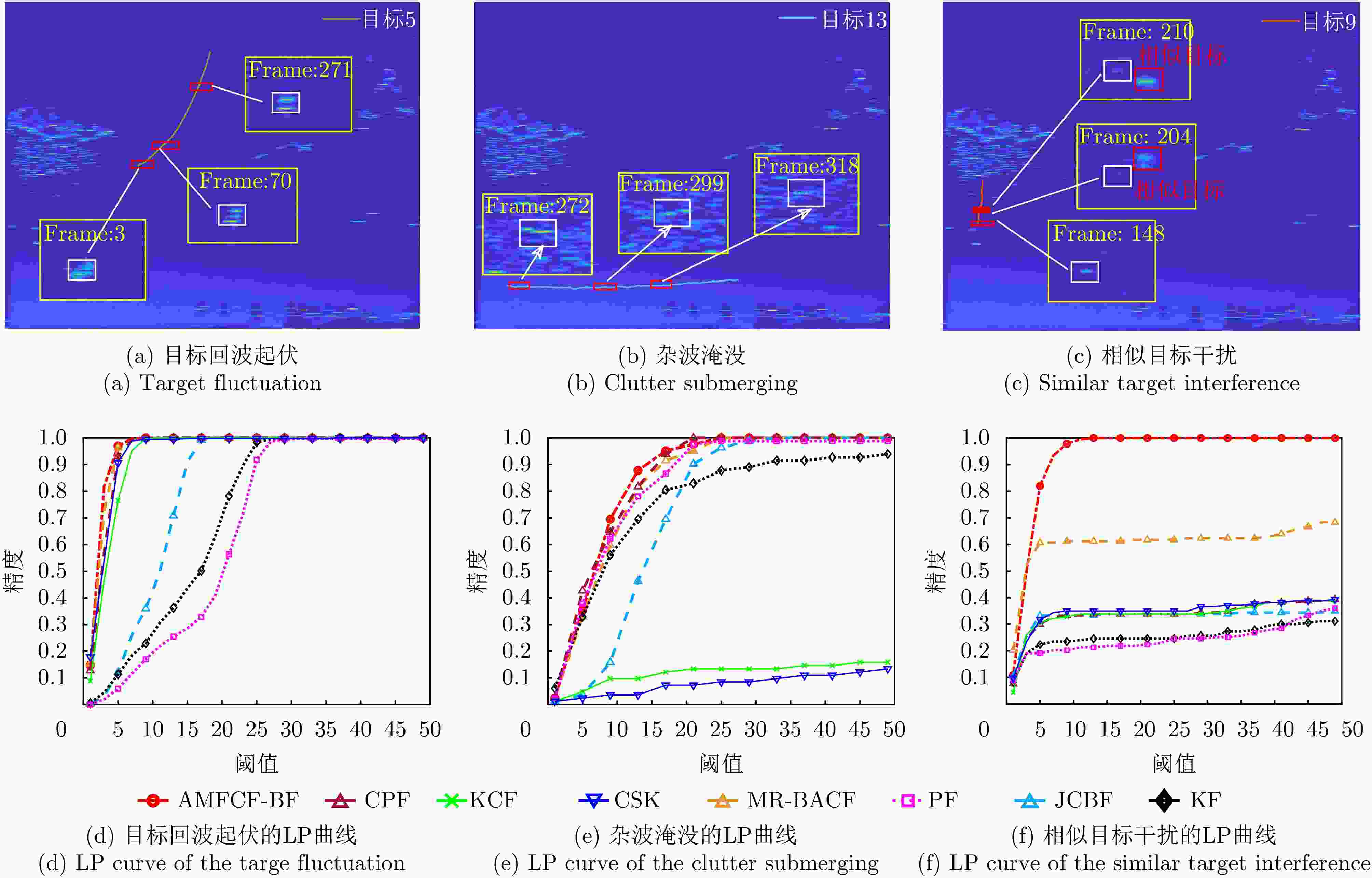 跟踪器 FPS$ \uparrow $ AMFCF-BF 10.08 MR-BACF 5.88 JCBF 40.54 CPF 11.03 KCF 169.83 CSK 915.95 KF 3353.00 PF 635.00 注:$ \uparrow $表示得分越高越好。 表 4 实测数据中各目标的经验信杂比