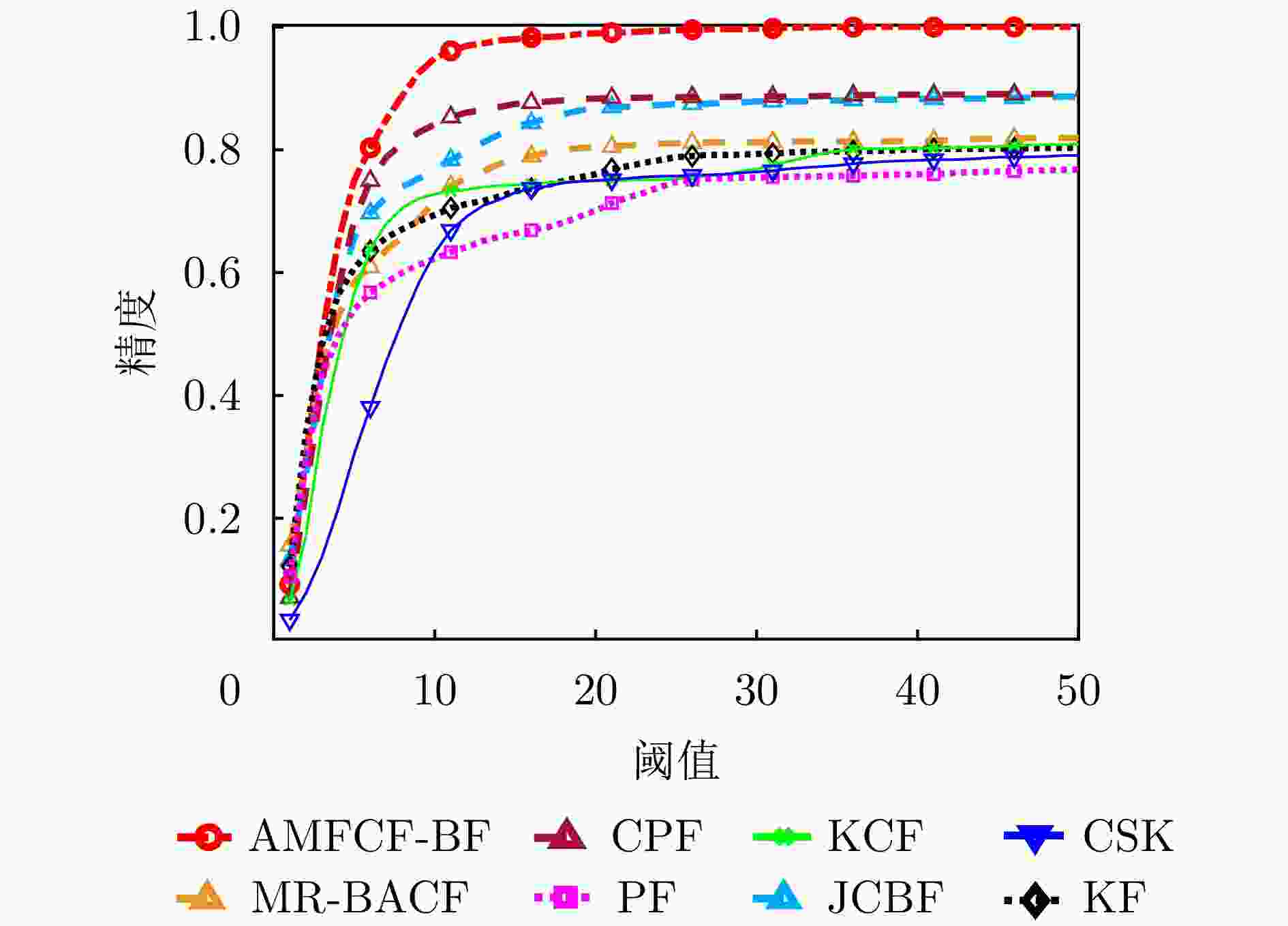 目标 AMFCF-BF MR-BACF JCBF CPF KCF CSK KF PF 1 2.73 6.51 2.63 4.17 4.07 3.96 3.01 2.73 2 2.04 1.85 3.14 2.63 3.42 5.08 2.18 2.42 3 7.89 6.83 3.69 3.23 5.93 8.24 2.01 2.08 4 6.88 10.70 3.94 3.95 4.24 7.67 5.97 9.51 5 2.18 2.45 10.04 2.47 3.17 15.14 15.11 17.94 6 2.34 45.55 48.00 48.20 44.40 46.85 49.69 48.45 7 3.97 1.79 1.82 4.66 3.97 6.90 2.47 2.89 8 1.85 20.30 2.32 4.85 2.57 22.31 2.45 3.13 9 2.76 19.75 33.67 36.85 38.47 32.75 37.31 37.84 10 3.41 1.94 3.03 3.34 3.30 7.46 2.38 2.92 11 3.46 3.31 3.95 4.04 3.98 18.44 6.03 35.60 12 1.79 3.18 6.33 2.80 3.96 5.78 2.43 3.18 13 7.69 8.33 7.37 14.09 47.02 46.12 12.44 8.90 14 2.09 47.60 2.58 3.51 3.76 5.41 49.08 49.34 平均 3.47 12.86 9.46 9.41 12.31 16.56 13.75 16.21 注:加粗数值为最优。 -
