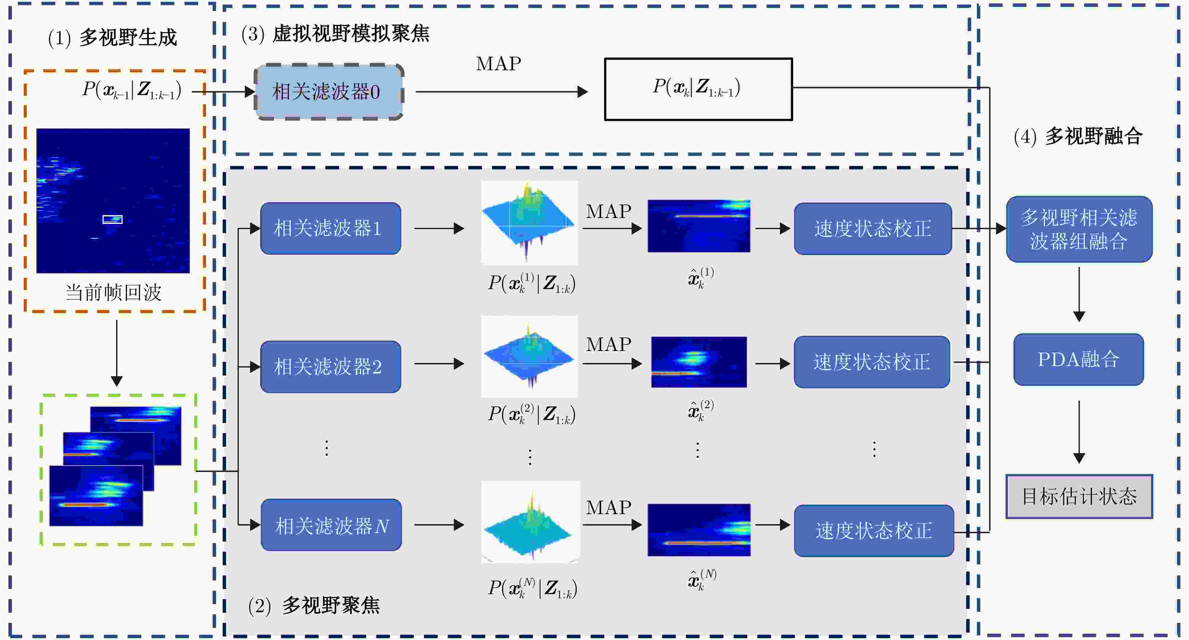 摘要: 该文针对复杂海面背景下雷达目标跟踪的关键技术展开研究。基于特征辅助的经典贝叶斯跟踪方法在海面雷达目标跟踪问题中已取得一定进展,但在强杂波淹没与目标相互作用的复杂场景中,其鲁棒性显著降低。为解决这些问题,该文提出了一种自适应多视野聚焦贝叶斯融合相关滤波器。该方法在目标状态概率分布区域内生成多个子视野,并在每个视野中部署独立的相关滤波器构建局部响应图,实现多假设状态建模。在跟踪器的迭代过程中,各滤波器生成的响应图不仅用于状态估计,还引导子视野分布在时序中动态聚焦于目标存在的高置信区域,从而增强跟踪器对复杂运动的适应能力。此外,针对复杂海面背景下跟踪器容易出现虚警和漏警的问题,算法引入了虚拟视野模拟聚焦模型,有效抑制了复杂环境因素导致的滤波器漂移现象。最终,该文在贝叶斯多量测跟踪框架下融合多视野量测,构建全局状态估计,获得了更精确的目标状态融合估计。基于仿真与实测雷达数据的实验结果表明,所提算法在中心定位误差指标上平均误差为3.47像素,较典型特征辅助相关滤波方法平均降低约70%,在定位精度指标上整体提升了约21%,显著提升了目标跟踪精度与抗干扰能力,验证了多视野聚焦相关滤波机制和贝叶斯融合策略的有效性。Abstract: This study addresses the critical challenge of radar target tracking in complex maritime environments. Although conventional feature-aided Bayesian tracking methods have advanced in maritime radar applications, their robustness considerably deteriorates in scenarios with severe sea clutter and interacting targets. To overcome these limitations, an Adaptive Multifocus Correlation Filter with Bayesian Fusion (AMFCF-BF) is proposed herein. The method constructs multiple subviews within the probabilistic distribution of the target state, with each subview assigned an independent correlation filter to generate a local response map, enabling multihypothesis state modeling. During iterative tracking, these response maps are used to estimate states and dynamically guide the focusing of subviews toward high-confidence regions, enhancing adaptability to complex target maneuvers. To further mitigate false alarms and missed detections caused by strong sea clutter, a virtual-view simulation based focusing model is developed, which effectively suppresses filter drift under adverse conditions. Finally, all subview responses are fused within a Bayesian multimeasurement framework to produce a globally consistent target-state estimate. Experimental results using simulated and real maritime radar data demonstrate that the proposed AMFCF-BF achieves an average center location error of 3.47 pixels, reducing tracking error by ~70% compared with typical feature-assisted correlation filtering methods. In terms of location precision, the proposed filter achieves an overall improvement of ~21%, showing significantly enhanced tracking accuracy and anti-interference performance, validating the effectiveness of the multifocus correlation filtering mechanism and Bayesian fusion strategy.