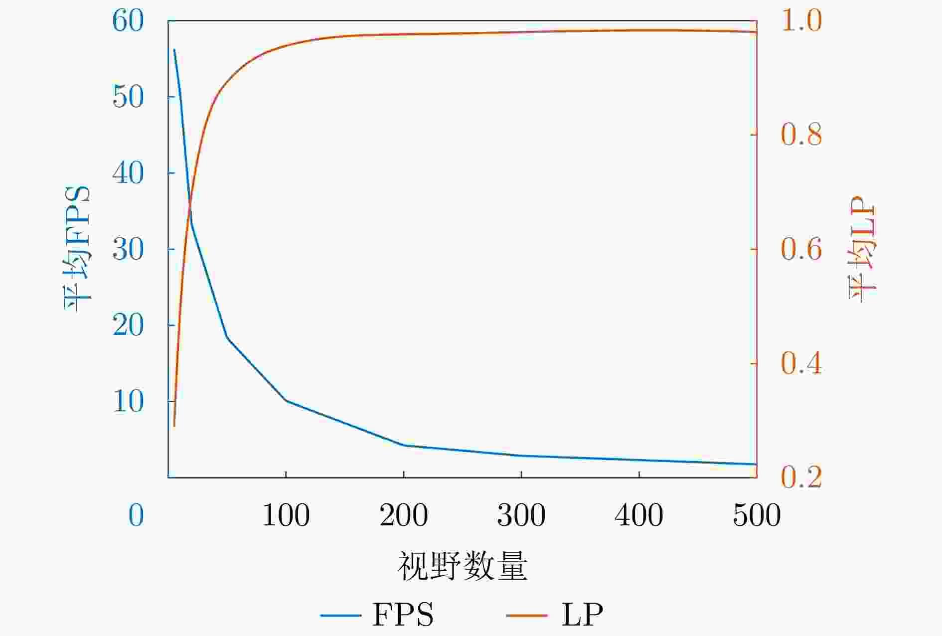 视野数量 CLE$ \downarrow $ LP$ \uparrow $ FPS$ \downarrow $ 5 38.32 0.29 56.27 10 29.10 0.49 50.61 20 18.71 0.70 33.05 50 9.57 0.89 18.33 100 6.81 0.96 10.08 200 3.66 0.98 4.23 300 3.86 0.98 2.88 500 3.60 0.98 1.75 注:$ \downarrow $表示得分越低性能越好,$ \uparrow $表示得分越高越好,加粗数值表示最优。 表 3 跟踪器的计算效率