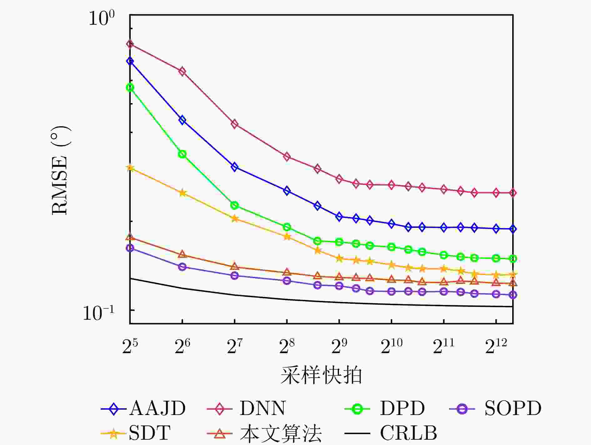图  10  角度跟踪RMSE受采样快拍数目影响对比