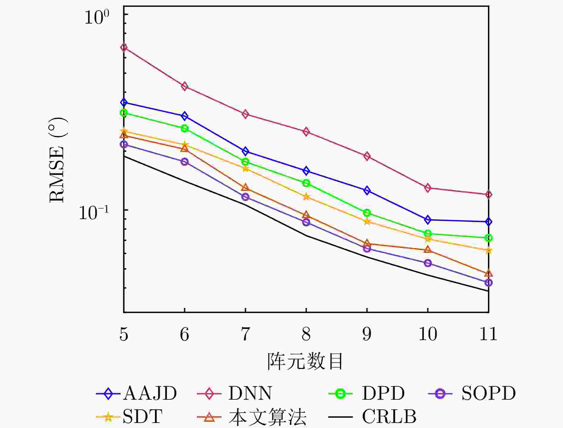 图  9  角度跟踪RMSE受阵元数目影响对比