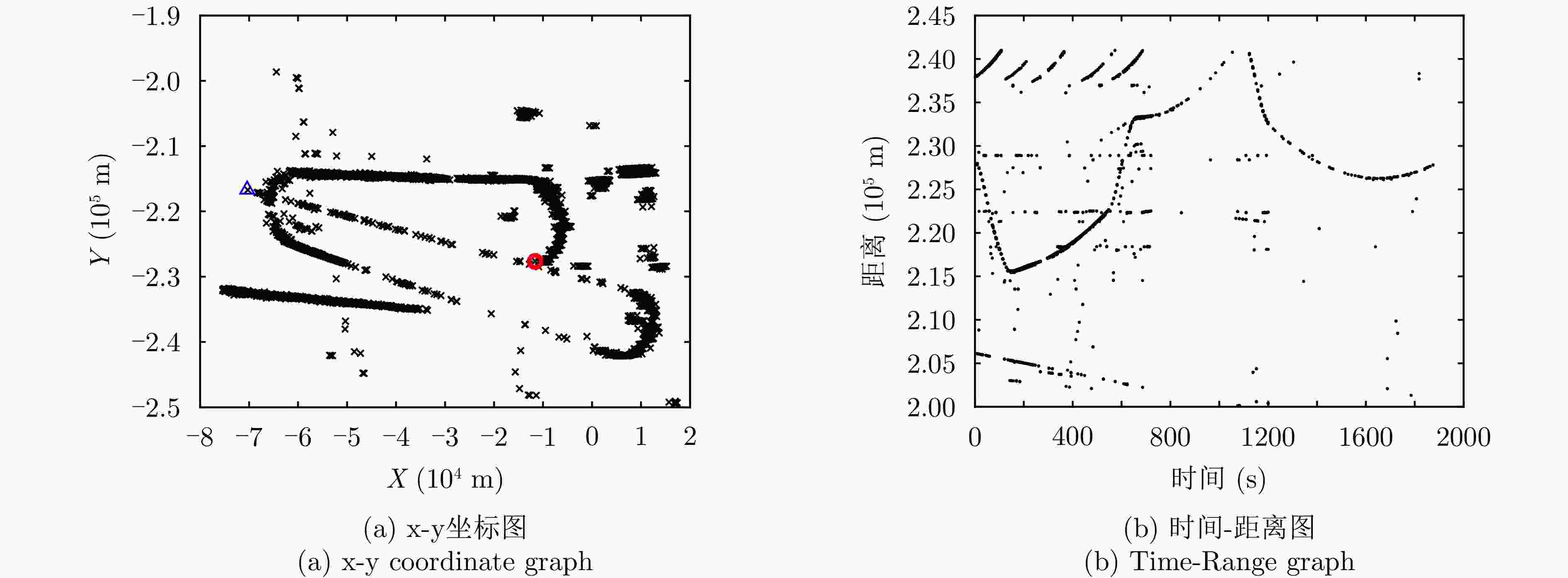 双基地基线距离 10 km 探测距离范围 [10 km, 60 km] 探测角度范围 [30°, 150°] 目标检测概率$ {P}_{d} $ 0.5 泊松杂波均值$ \lambda $ 20 距离量测误差(精度) 30 m 角度量测误差(精度) 1° -
