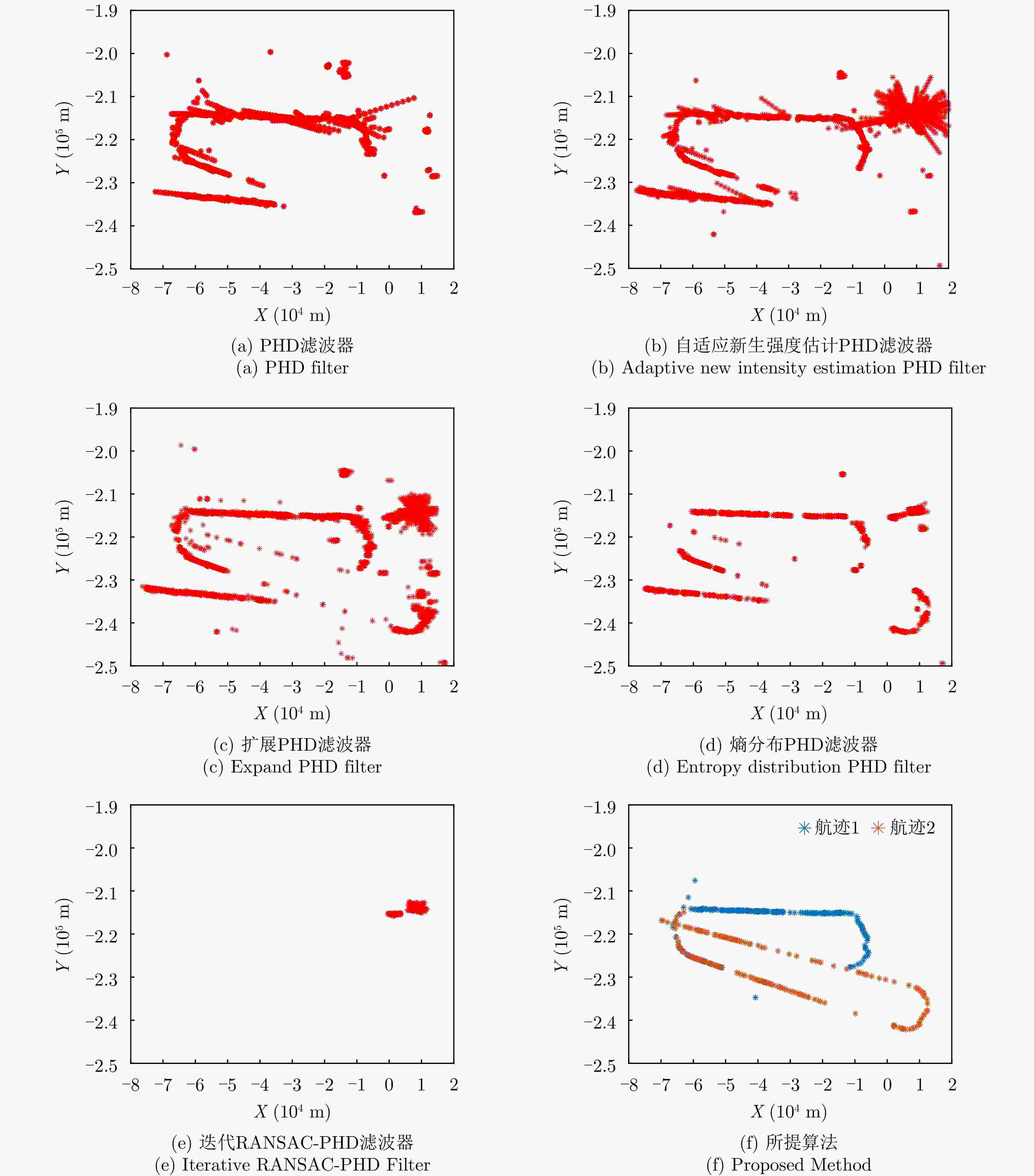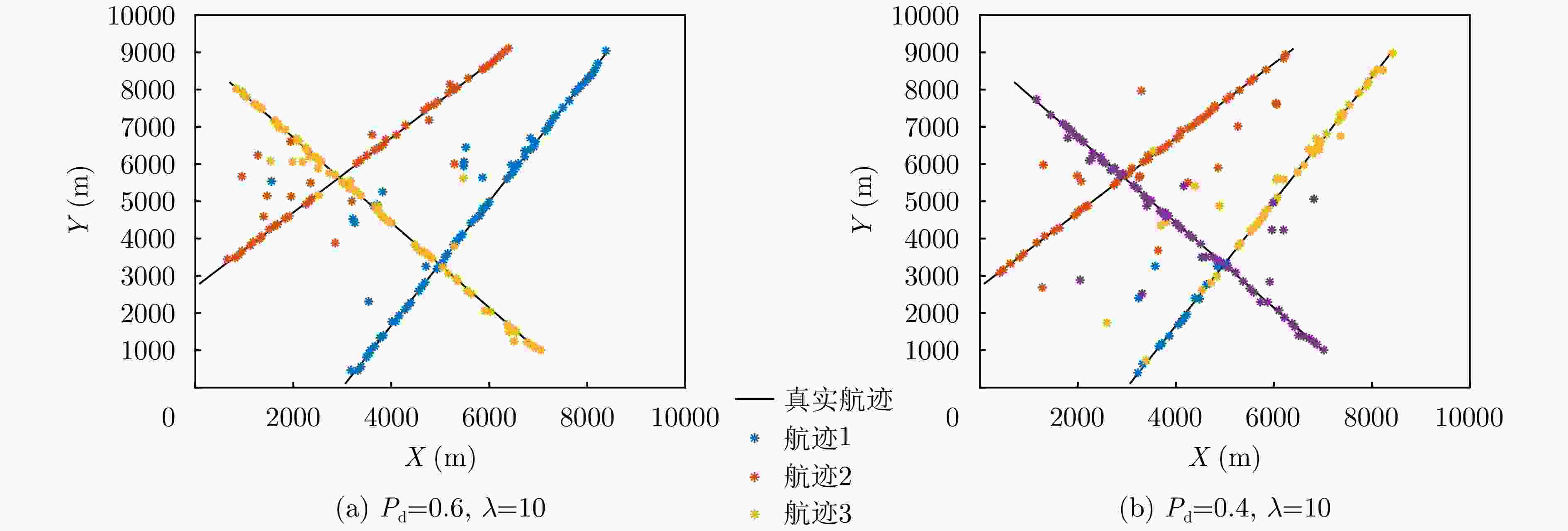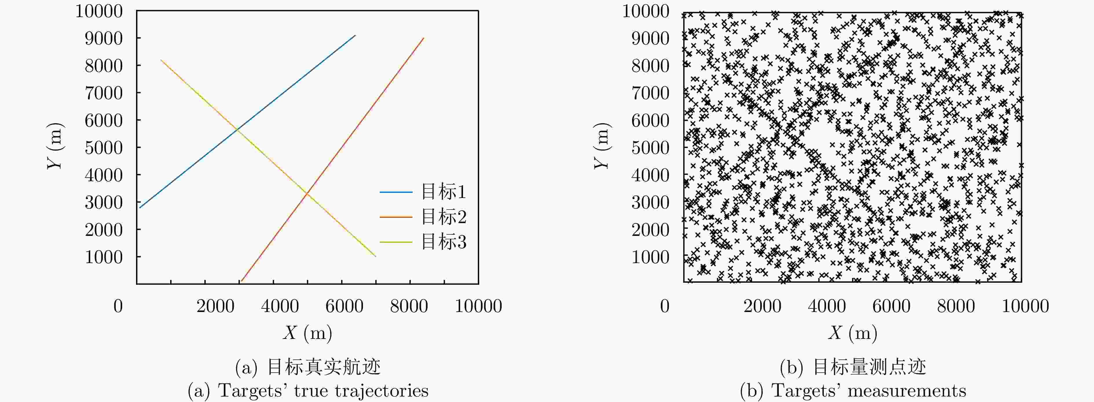 目标 起始位置(x,y)/ m 速度($ {v}_{x},{v}_{y} $)/ m/s 存活时间/ s 1 (0, 2700 )(80, 80) (0, 80) 2 ( 3000 , 0)(60, 100) (0, 90) 3 (0, 9000 )(70, -80) (10, 100) 表 2 仿真场景参数设置