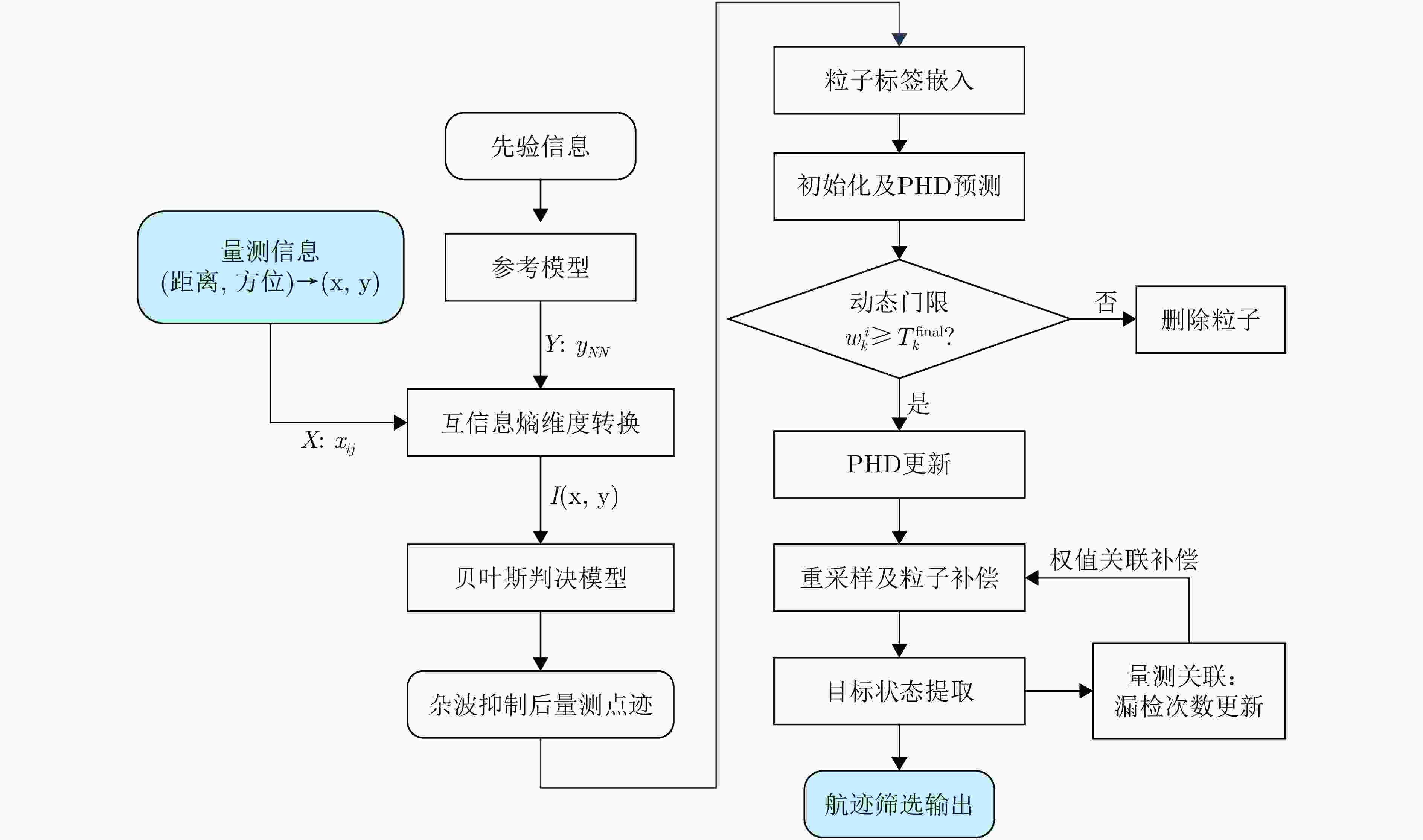 摘要: 针对非合作双基地雷达目标跟踪时主要面临的高杂波率、低检测概率等问题,该文提出了一种基于互信息熵和改进PHD滤波器的目标跟踪协同处理框架,首先将目标点和杂波点与参考模型间不同的统计相关程度量化为互信息熵值,基于互信息熵维特征完成杂波点迹筛除;其次通过动态权值补偿对经典PHD滤波器进行改进,减缓粒子权值归零过程的同时减少目标误删现象,解决低检测概率下点迹不连续且间隔随机给目标跟踪带来的点迹断联、目标丢失等问题。通过仿真实验验证了所提算法框架的有效性与性能,外场实测数据验证了所提方法在实际应用中可取得良好的目标跟踪结果。Abstract: This study proposes a processing framework based on mutual information entropy and an improved probability hypothesis density filter to address the key challenges—high clutter density and low detection probability—in passive bistatic radar target tracking. First, statistical differences in the correlation between target and clutter points, as well as between reference models, are quantified as mutual information entropy values, which are then used to eliminate clutter points. Second, the classical probability hypothesis density filter is improved through dynamic weight compensation, mitigating particle weight degeneration and reducing the deletion of false targets. This approach effectively resolves issues such as track fragmentation and target loss caused by discontinuous measurements with random intervals under low detection probability. The effectiveness of the proposed framework was verified through simulation experiments, and field test data demonstrated that the proposed method achieves good target-tracking performance in practical applications.