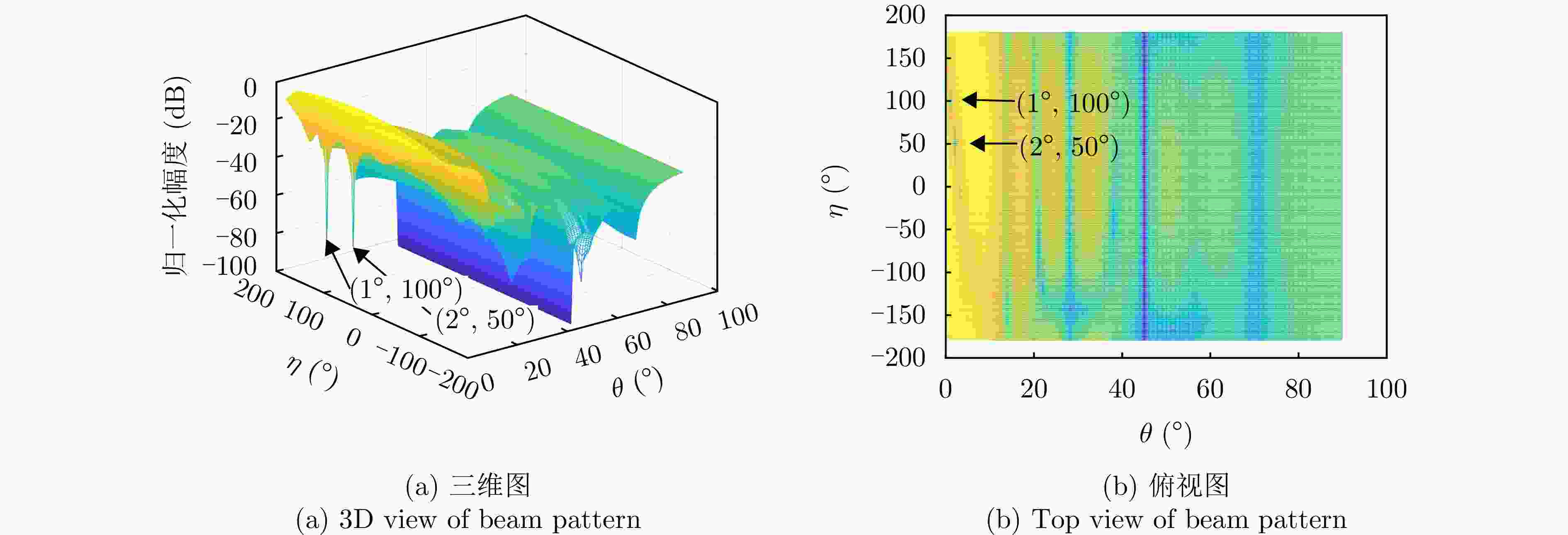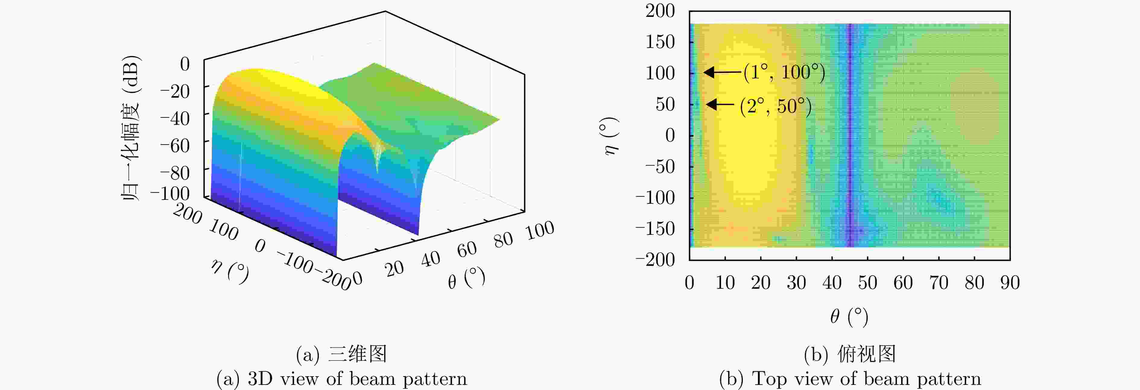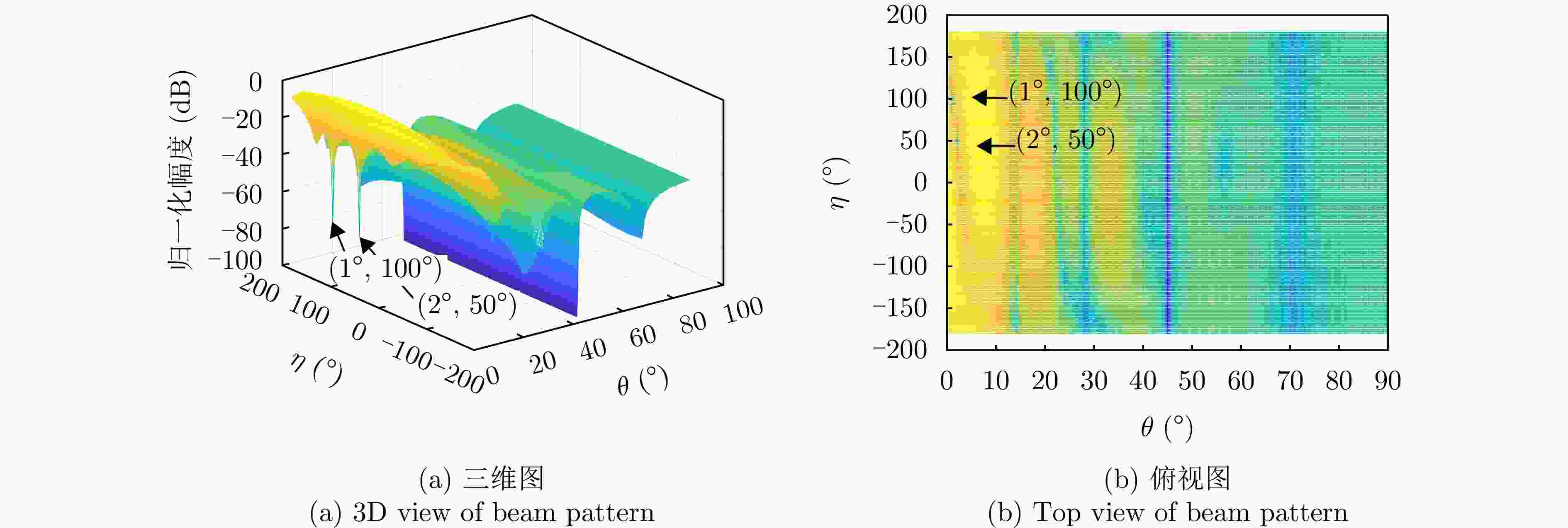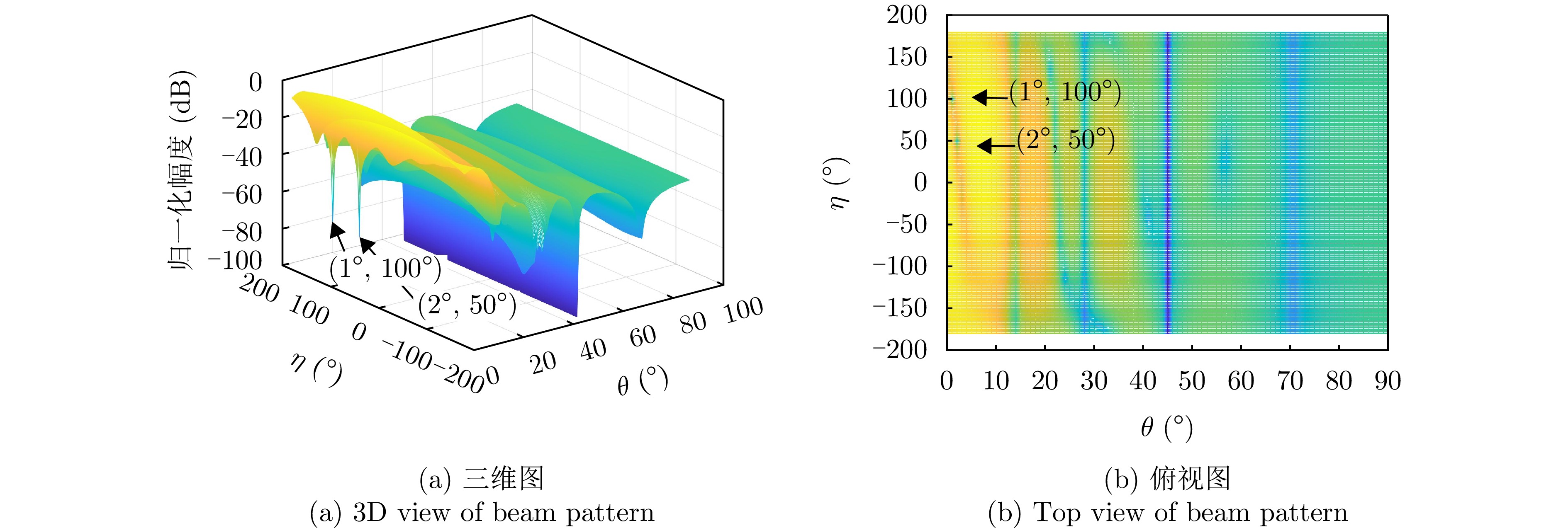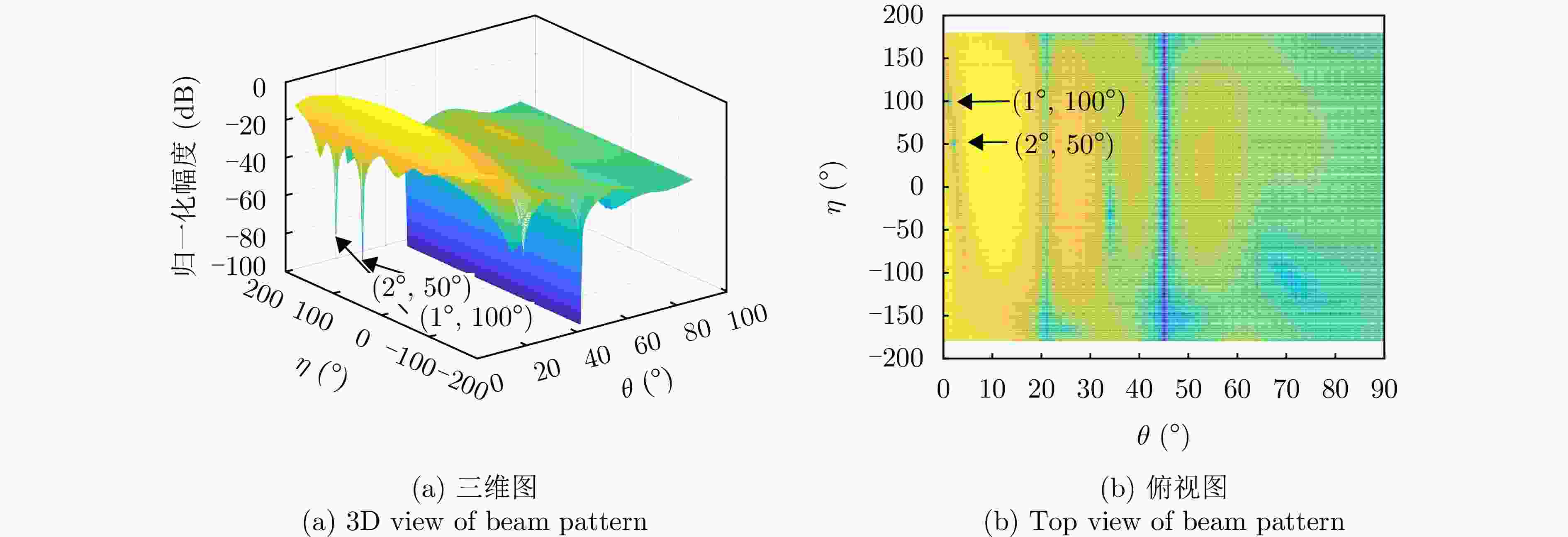 参数 参数值 阵元间距 λ/2 波束指向$\left( {{\theta _0},{\varphi _0}} \right)$ (0°, 0°) 波束指向极化参数$({\eta _0},{\gamma _0})$ (90°, 0°) 目标信号方向$\left( {{\theta _s},{\varphi _s}} \right)$ (1°, 45°) 目标信号极化参数$({\eta _s},{\gamma _s})$ (80°, 0°) 目标SNR (dB) –10 主瓣干扰J1方向$\left( {\theta _1^{\rm J},\varphi _1^{\rm J}} \right)$ (1°, 45°) 主瓣干扰J1极化参数$(\eta _1^{\rm J},\gamma _1^{\rm J})$ (45°, 100°) 主瓣干扰J2方向$\left( {\theta _2^{\rm J},\varphi _2^{\rm J}} \right)$ (2°, 45°) 主瓣干扰J2极化参数$(\eta _2^{\rm J},\gamma _2^{\rm J})$ (45°, 50°) 表 2 仿真场景