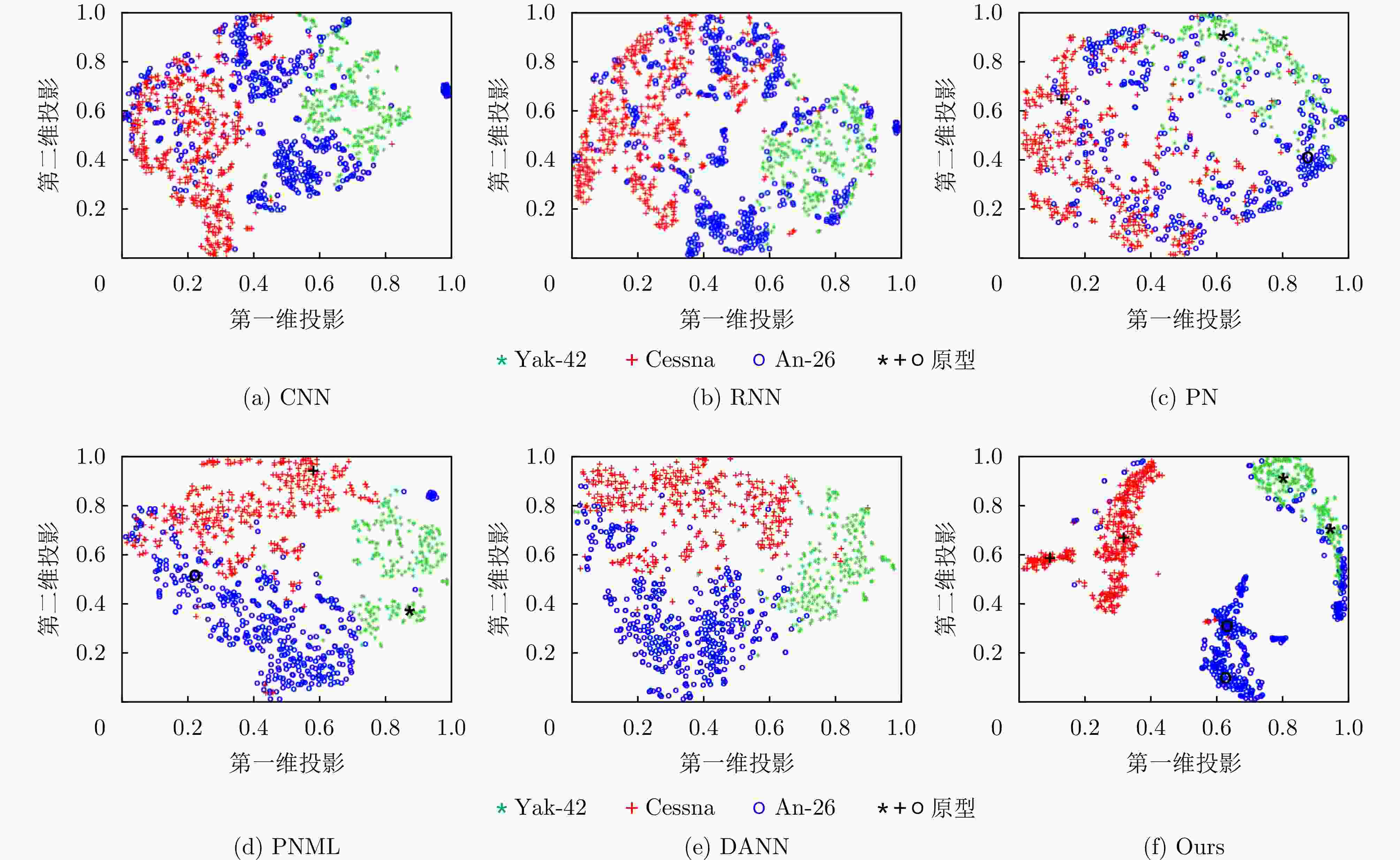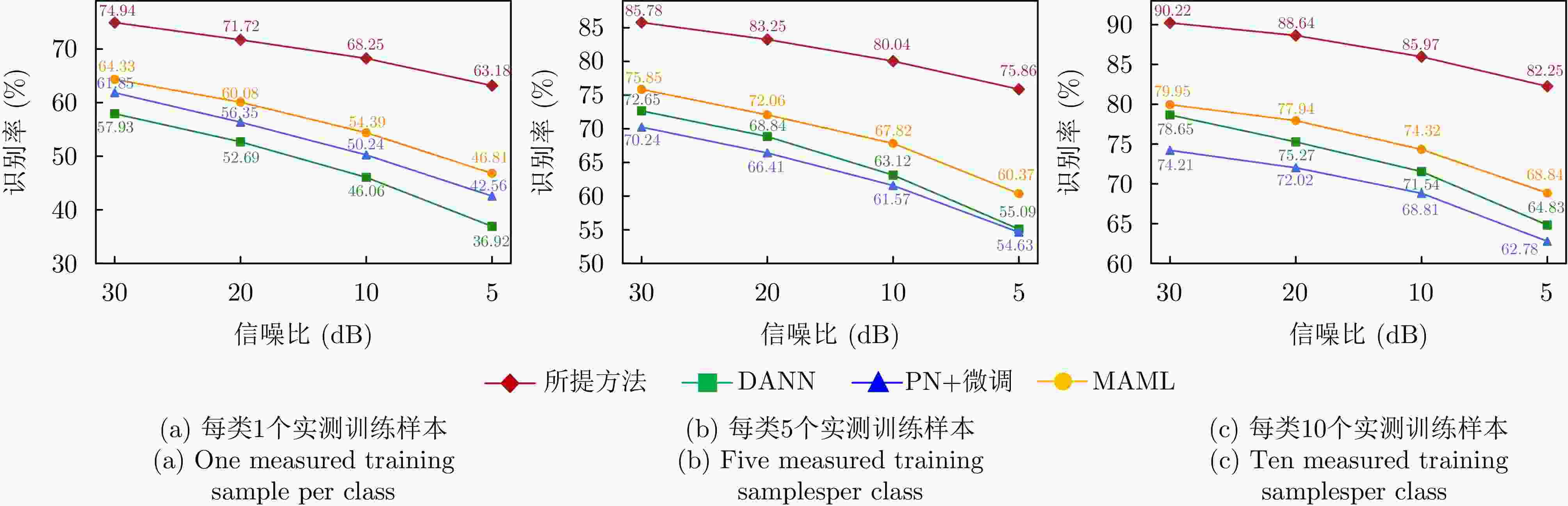 方法 训练计算复杂度(FLOPs) 单批次训练时间(ms) PN+微调 1.5×109 18.9 PNML 1.4×109 17.6 MAML 2.4×109 30.7 DAN 1.9×109 21.3 DANN 2.0×109 22.5 所提方法 2.1×109 26.9 表 10 不同方法单个测试HRRP样本计算复杂度和推理时间对比