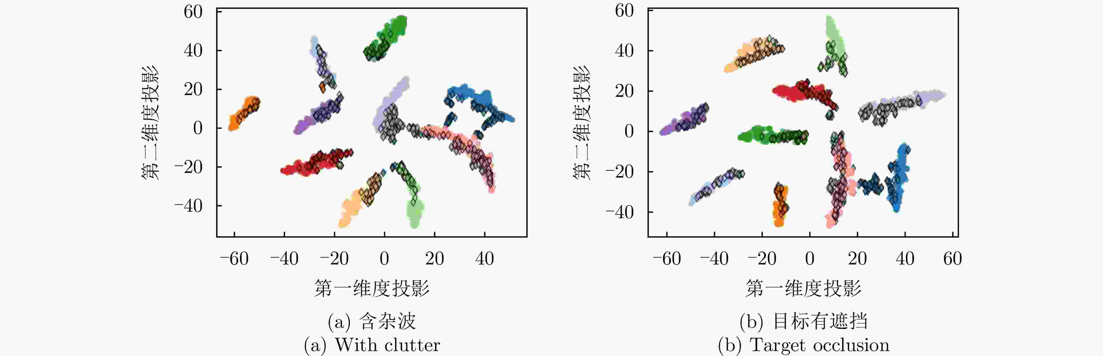 方法 1shot 5shot 10shot PN+微调 60.10%±1.94% 67.89%±1.45% 71.65%±1.12% DAN 58.14%±1.26% 69.96%±0.97% 75.23%±0.83% DANN 58.81%±1.17% 70.24%±0.90% 76.39%±0.78% 所提方法 69.52%±0.81% 77.46%±0.52% 82.74%±0.39% 注:表内加粗数值表示最优指标数值。 表 12 不同方法在含杂波、目标有遮挡条件下SAMPLE数据集转换成的HRRP数据上的识别性能对比(20次实验平均结果)