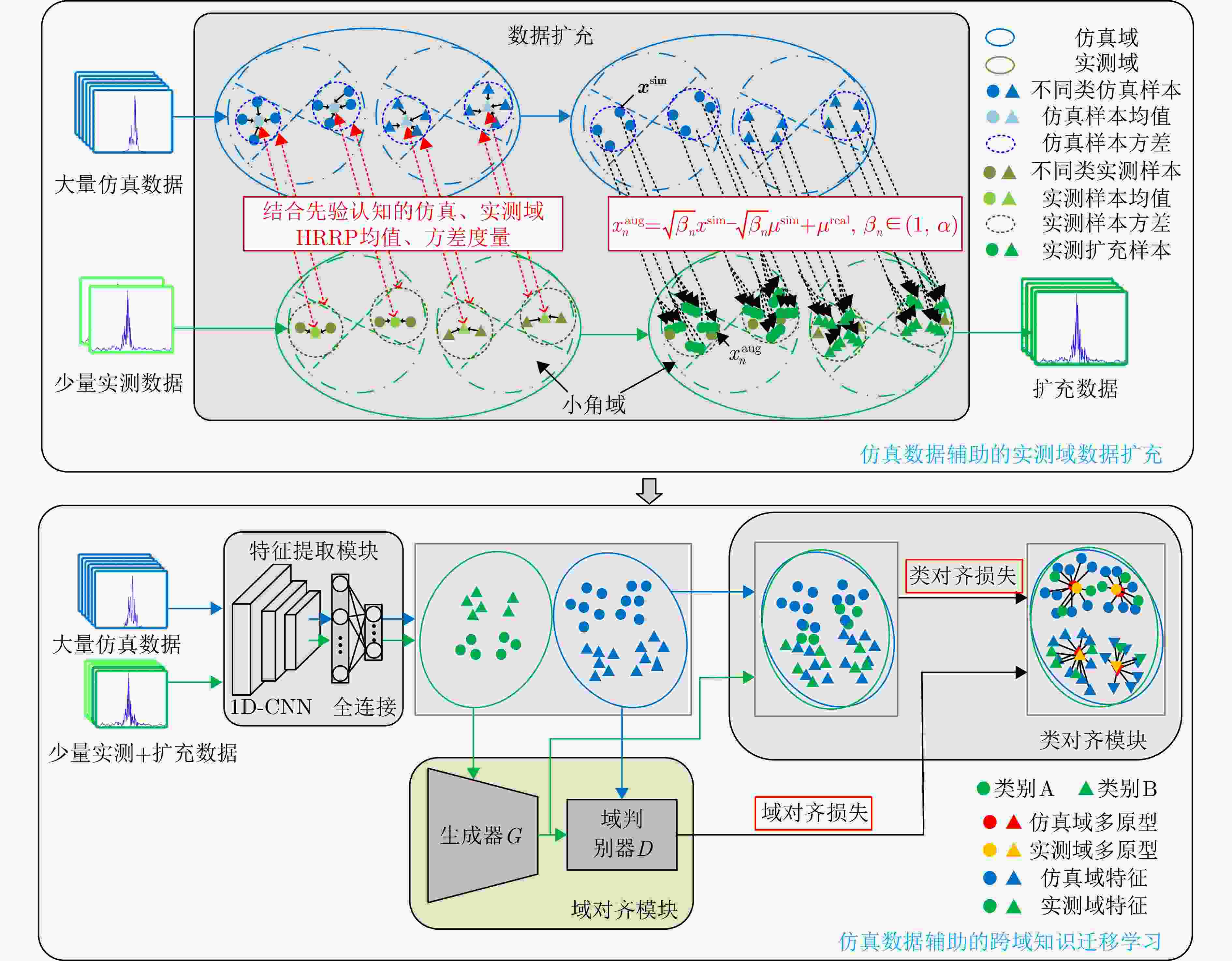 摘要: 雷达高分辨距离像(HRRP)目标识别研究广泛、方法众多,特别是深度学习在雷达HRRP识别领域的应用与发展,为直接利用雷达回波实现高效、精确的目标感知提供了技术支撑。然而,深层识别网络依赖大量训练数据。对于非合作目标,受雷达系统参数、目标快速机动等因素限制,实际很难提前获取姿态完备的HRRP训练样本,深层识别网络面临学习过拟合、泛化能力显著下降的问题。针对上述问题,考虑关注目标的全姿态电磁仿真数据易获取,该文以仿真数据为辅助,从数据扩充和跨域知识迁移学习两方面来缓解小样本问题。数据扩充方面,结合一定姿态角角域范围内仿真、实测HRRP在均值和方差特性两方面的差异分析,对与少量实测HRRP同角域的大量仿真HRRP样本进行线性变换,使其均值、方差满足实测域HRRP特性,实现可表征真实HRRP分布特性的数据扩充。跨域知识迁移学习方面,考虑数据扩充策略仅能实现临近姿态角的样本扩充,对仿真数据知识的利用仍不充分,所提方法利用基于生成对抗约束的域对齐策略和基于对比学习约束的类对齐策略,将具有强可分性与泛化性的仿真域全姿态数据特征和实测域特征按类拉近,进一步辅助实测域数据的学习,实现小样本识别性能的更大提升。基于3类飞机目标以及10类地面车辆目标电磁仿真和实测HRRP数据的实验表明,所提方法相较于现有小样本识别方法具有更优的识别稳健性。Abstract: Research on target recognition using radar high-resolution range profiles (HRRPs) is extensive and diverse in methodology. In particular, the application and development of deep learning to radar HRRP target recognition have enabled efficient, precise target perception directly from radar echoes. However, deep learning-based recognition networks rely on large amounts of training data. For non-cooperative targets, due to limited radar system parameters and rapid target attitude variations, acquiring adequate HRRP training samples that comprehensively cover target attitudes in advance is difficult in practice. Consequently, deep recognition networks are prone to overfitting and exhibit considerably degraded generalization capability. To address these issues, and given the ease of obtaining full-attitude electromagnetic simulation data for the target, this paper leverages simulated data as auxiliary information to mitigate the small-sample-size problem through data augmentation and cross-domain knowledge-transfer learning. For data augmentation, based on the analysis of differences in mean and variance between simulated and measured HRRPs within a given attitude-angle range, a linear transformation is applied to a set of simulated HRRPs spanning the same angular domain as a small set of measured HRRPs. This adjustment ensures that the simulated data’s mean and variance match the characteristics of the measured HRRPs, thereby achieving data augmentation that approximates the true distributional properties of HRRPs. Meanwhile, for cross-domain knowledge transfer learning, the proposed method introduces a domain alignment strategy based on generative adversarial constraints and a class alignment strategy based on contrastive learning constraints. These approaches draw the domain features of full-attitude simulation—strong discriminability and generalizability—closer to the measured domain features on a class-by-class basis, thereby further aiding learning from the measured domain data and leading to substantial improvements in few-shot recognition performance. Experimental results based on electromagnetic simulated and measured HRRP data for three and ten types of aircraft and ground vehicle targets, respectively, demonstrate that the proposed method yields superior recognition robustness compared with existing few-shot recognition methods.