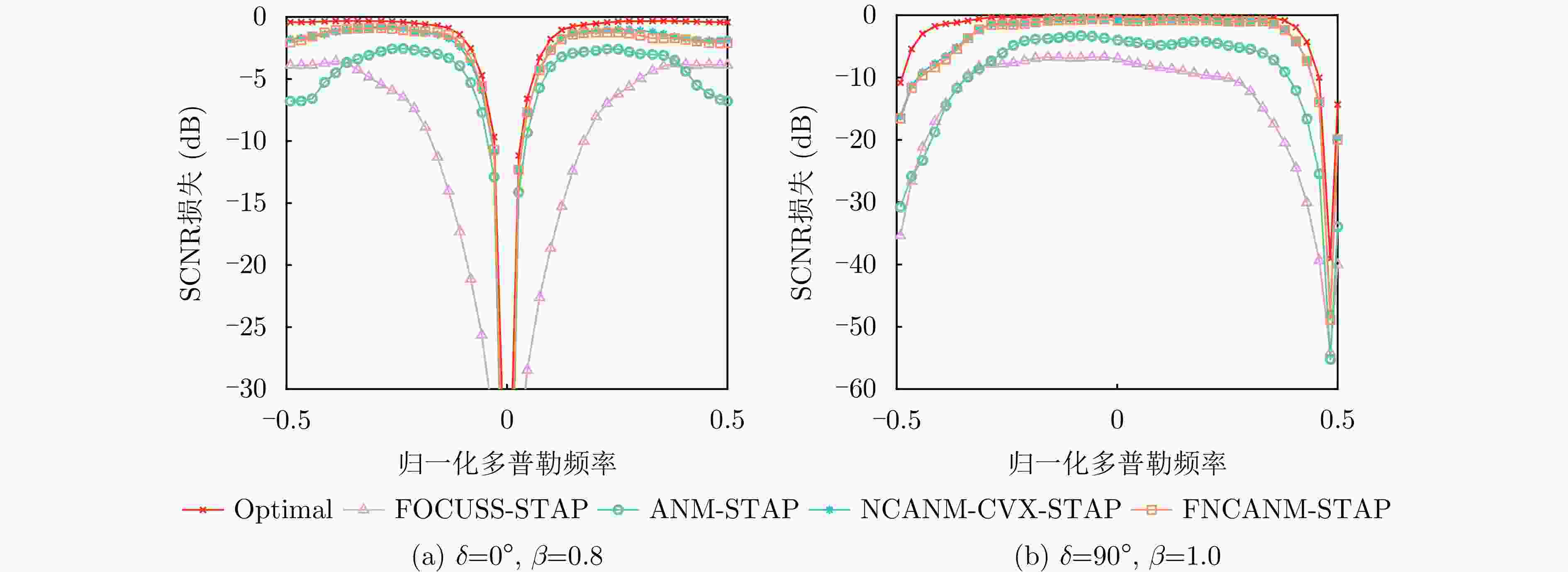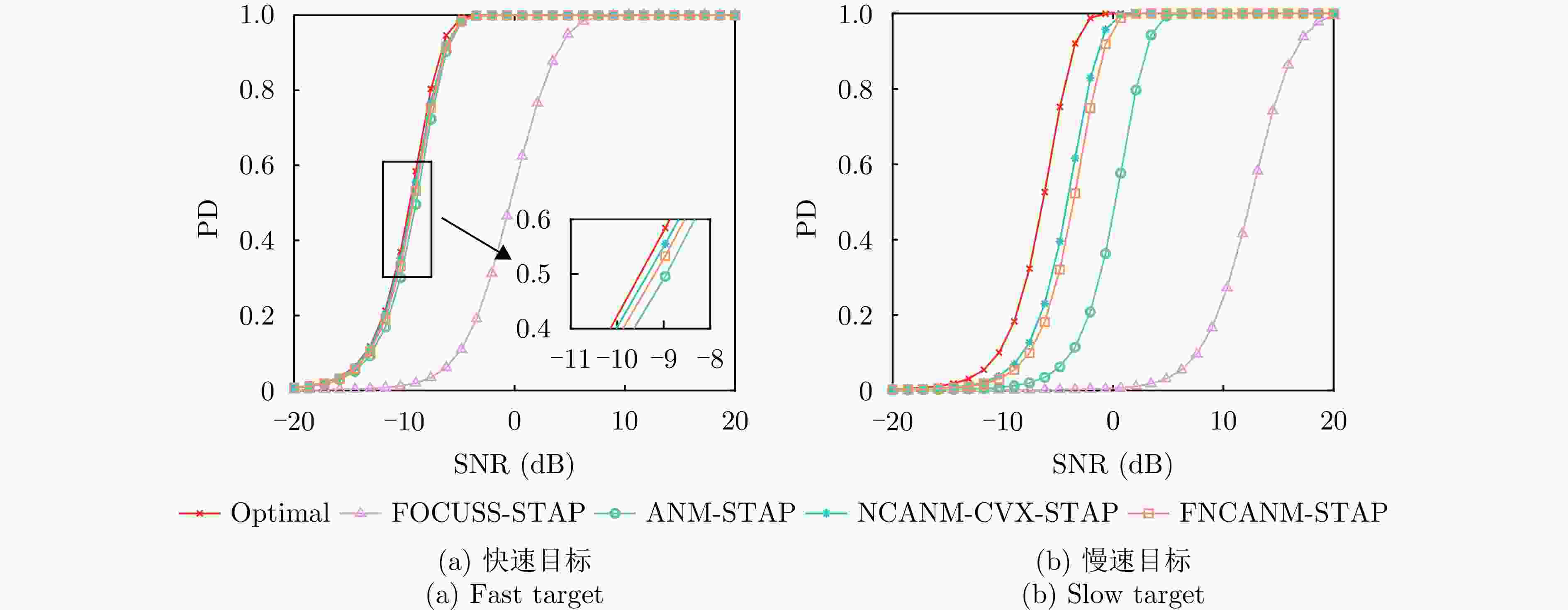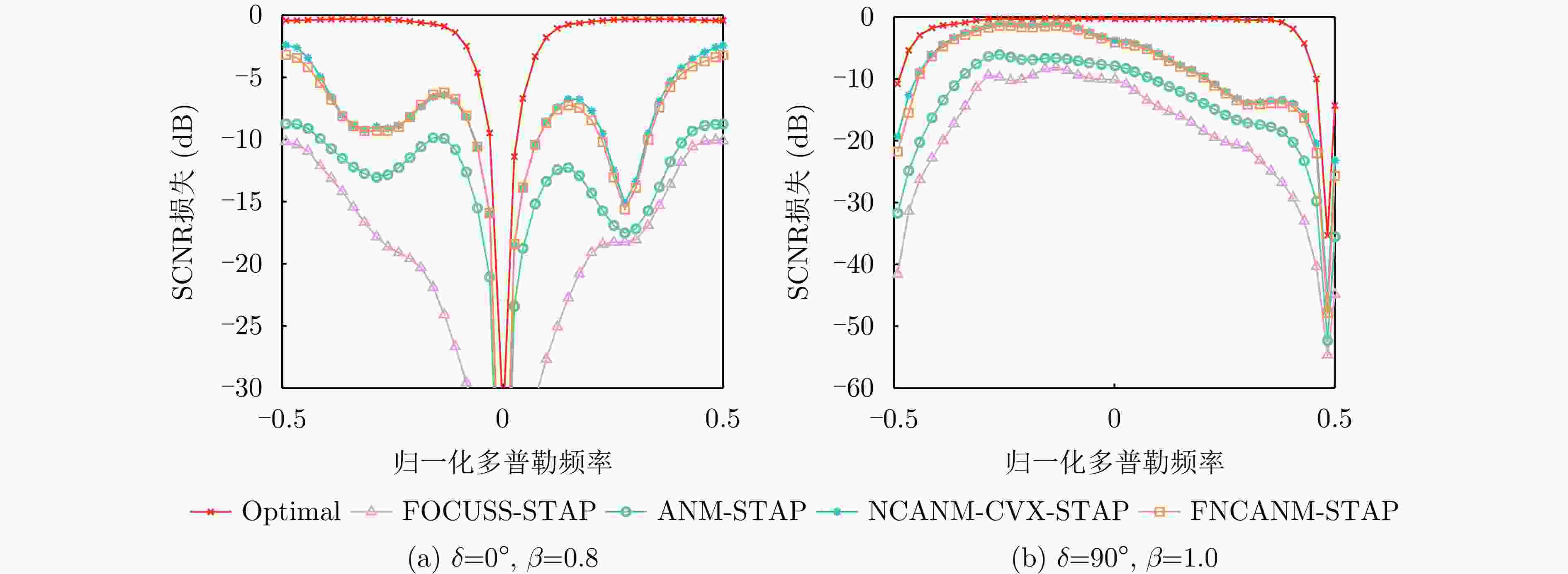 算法 复乘法次数 计算复杂度 FOCUSS-STAP $ O({T_{{\text{FOCUSS}}}}({(NK)^3}{({\rho _{\text{s}}}{\rho _{\text{d}}} + 1)^2} + {(NK)^2}{\rho _{\text{s}}}{\rho _{\text{d}}}L)) $ $ O({T_{{\text{FOCUSS}}}}{(NK)^3}{({\rho _{\text{s}}}{\rho _{\text{d}}})^2}) $ ANM-CVX-STAP $ O({\text{log(}}1/\varepsilon ){({L^2} + (2N - 1)(2K - 1) + NKL)^2}{(NK + L)^{2.5}}) $ $ O({\text{log(}}1/\varepsilon ){(NK)^{3.5}}) $ NCANM-CVX-STAP $ O({T_{{\text{MM}}}}({\text{log(}}1/\varepsilon ){({L^2} + (2N - 1)(2K - 1) + NKL)^2}{(NK + L)^2})) $ $ O({T_{{\text{MM}}}}{\text{log(}}1/\varepsilon ){(NK)^{3.5}}) $ FNCANM-STAP $ O({T_{{\text{MM}}}}{T_{{\text{FNCANM}}}}(({k_{\mathrm{r}}} + 1){(NK + L)^2} + k_{\mathrm{r}} + {(NK)^2}({N_{\mathrm{R}}} + 1) + 6NK + {L^2} + L)) $ $ O({T_{{\text{MM}}}}{T_{{\text{FNCANM}}}}{k_{\mathrm{r}}}{(NK)^2}) $ 表 2 雷达系统仿真参数