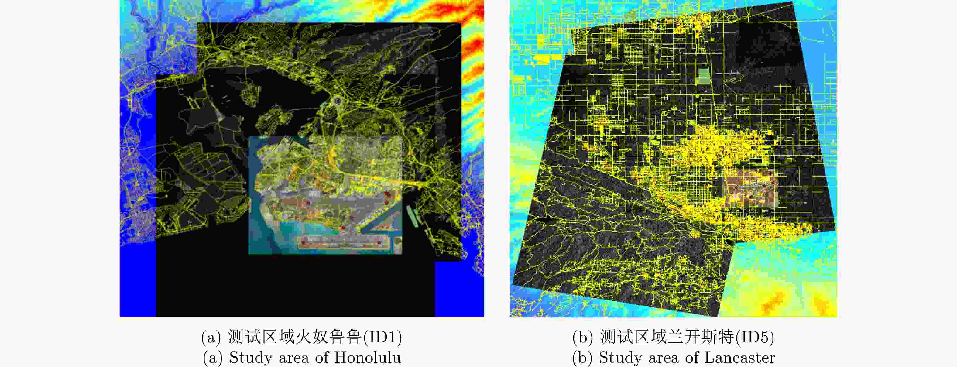 RGB聚束/降轨/右侧视/38.2°/0.56 m/0.34 m 聚束/升轨/右侧视/36.7°/0.56 m/0.34 m 安克雷奇(ID2) 聚束/降轨/右侧视/35.4°/0.56 m/0.34 m 聚束/升轨/右侧视/34.5°/0.56 m/0.33 m 马歇尔(ID3) 聚束/降轨/右侧视/32.3°/0.56 m/0.33 m 聚束/升轨/右侧视/27.7°/0.56 m/0.31 m 萨斯卡通(ID4) 聚束/降轨/右侧视/26.6°/0.56 m/0.31 m 聚束/升轨/右侧视/39.1°/0.56 m/0.34 m 兰开斯特(ID5) 条带/降轨/右侧视/28.4°/1.12 m/1.73 m 条带/升轨/右侧视/42.5°/1.12 m/1.7 m 表 2 测试区域提取到的控制点精度评估结果,以及控制点数量
