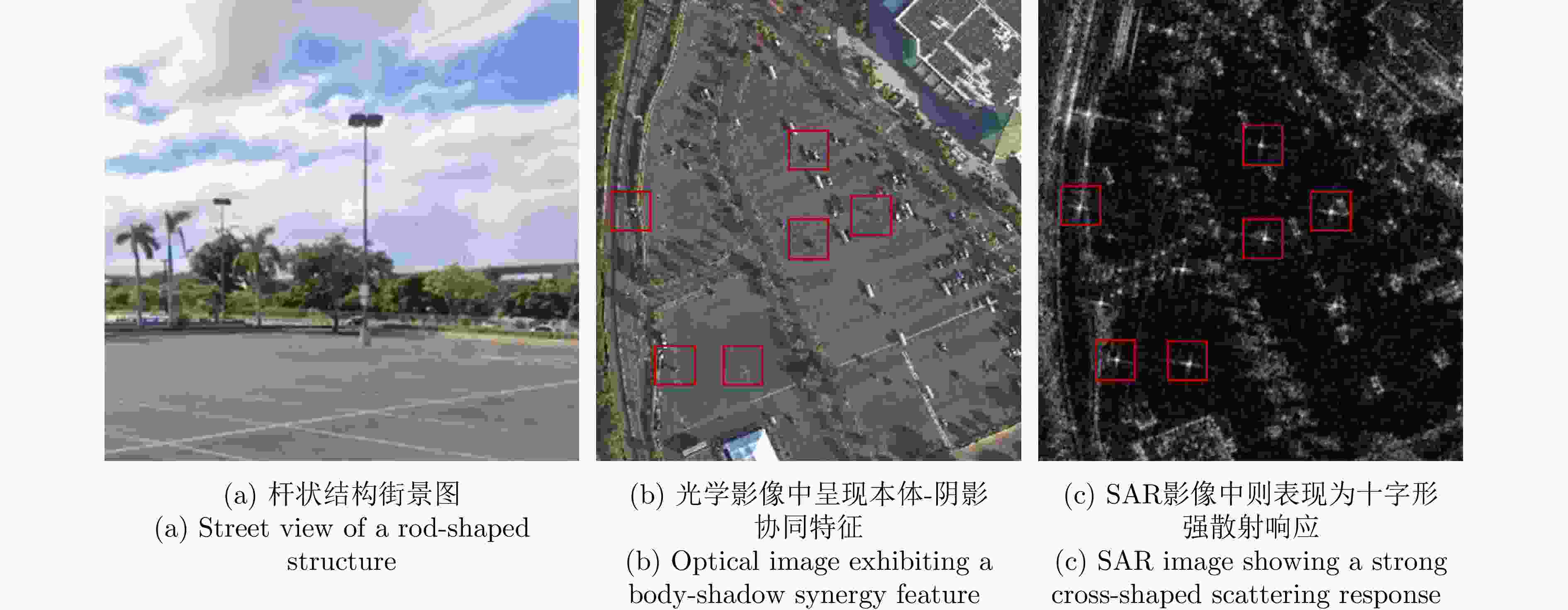 摘要: 控制点作为遥感影像定位精度提升的核心基准,其空间分布特征与几何质量直接影响正射校正的可靠性,是保障多源影像融合、变化检测及定量反演精度的关键基础。针对传统角反射器布设成本高、实施难度大,难以满足全球应用需求的问题,以及现有异源控制点(如光学影像和激光测高数据)因与合成孔径雷达(SAR)影像存在显著模态差异,难以兼顾精度与鲁棒性的问题,该研究提出一种基于众源数据的高分辨率SAR影像控制点自动提取方法,并构建了基于控制片的高精度正射校正技术框架。本方法充分利用城市环境中广泛分布的杆状人造地物特性:在光学影像中,这类地物呈现本体-阴影协同结构特征,在SAR影像中则表现为十字形强散射响应。首先利用开源机场跑道数据校正谷歌光学影像,建立平面基准框架;进而通过光学-SAR影像匹配点与立体SAR影像匹配点的协同平差解算,实现不同升降轨立体SAR影像的初始定位优化;最终结合道路和停车场矢量数据提取感兴趣区域,采用信杂比检测算法识别强散射点,并通过点目标分析与立体定位技术获取控制点的三维空间坐标。基于控制点坐标对立体SAR影像的残余平面误差进行修正后,可生成不同升降轨SAR影像的控制片数据。通过采用多个区域的高分三号升降轨SAR影像开展控制点提取验证,结果表明:基于聚束模式立体SAR影像提取的控制点三维定位精度达亚米级,基于提取的控制点和控制片实现了测试影像的正射校正,通过角反射器和机载激光点云真值验证,结果发现测试影像定位精度提升显著,其中聚束模式定位误差为1.78像素,超精细条带模式为1.09像素,精细条带模式为0.82像素,较传统光学参考影像匹配校正方法精度提升了47.2%, 49.3%和37.4%。本研究创新性地引入众源信息辅助SAR控制点提取和升降轨SAR控制片构建,突破光学参考底图匹配校正的精度瓶颈,为高分辨率SAR影像精确定位与联合处理提供了可推广的新路径。Abstract: Ground control points (GCPs) are essential for improving the positioning accuracy of remote sensing imagery. Their spatial distribution and geometric quality directly affect the reliability of orthorectification. GCPs serve as a critical foundation for ensuring the accuracy of multi-source image fusion, change detection, and quantitative inversion. However, traditional corner reflector deployment presents high costs and implementation difficulties, struggling to meet global application demands. Additionally, existing heterogeneous control points (such as optical imagery and laser altimetry data) exhibit significant modal differences relative to synthetic aperture radar (SAR) imagery, which affects their ability to balance accuracy and robustness. To address these challenges, this study proposes an automatic control point extraction method for high-resolution SAR imagery based on multi-source data. Furthermore, a high-precision orthorectification framework is established using control chips. The method leverages the characteristics of widely distributed pole-like artificial features in urban environments: these features exhibit a body–shadow collaborative structure in optical imagery and a cross-shaped strong scattering response in SAR imagery. First, open-source airport runway data are used to correct Google optical imagery, establishing a planar reference framework. Next, initial positioning optimization for stereo SAR images from ascending and descending orbits is achieved by jointly adjusting optical-SAR and stereo SAR image matching points. Finally, road and parking lot vector data are utilized to extract regions of interest, where strong scattering points are identified using a signal-to-clutter ratio detection algorithm. Three-dimensional spatial coordinates of control points are obtained via point target analysis and stereo positioning techniques. After correcting residual planar errors in stereo SAR images using control point coordinates, control chip data for ascending and descending orbit SAR images are generated. Validation experiments using GaoFen-3 SAR images from multiple regions show that the 3D positioning accuracy of control points extracted from spotlight mode stereo SAR imagery reaches the submeter level. Orthorectification of test images using extracted control points and control chips significantly improves positioning accuracy, as verified by corner reflectors and airborne LiDAR point cloud-based ground truth. Positioning errors are 1.78 pixels (spotlight mode), 1.09 pixels (ultrafine stripmap mode), and 0.82 pixels (fine stripmap mode), corresponding to improvements of 47.2%, 49.3%, and 37.4%, respectively, compared to traditional optical reference image matching correction methods. This study introduces crowdsourced information to assist SAR control point extraction and ascending/descending orbit SAR control chip construction, overcoming the accuracy limitations of optical reference image matching correction. The proposed method provides a scalable approach for high-precision positioning and joint processing of high-resolution SAR imagery.