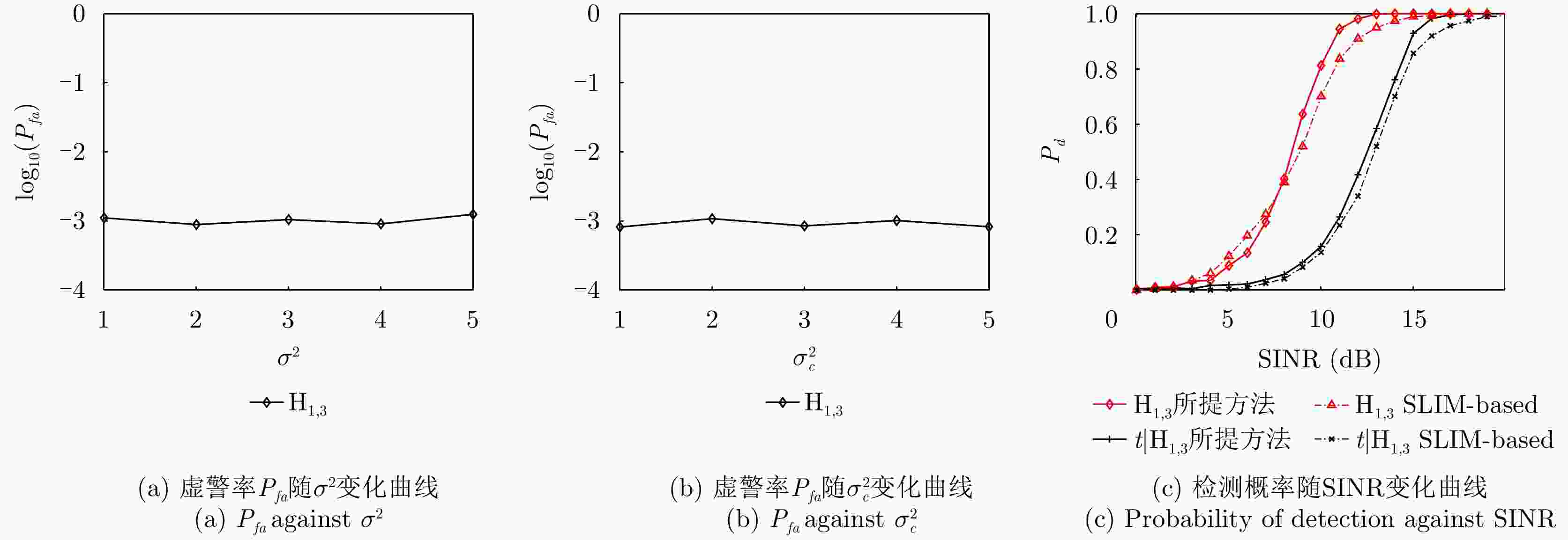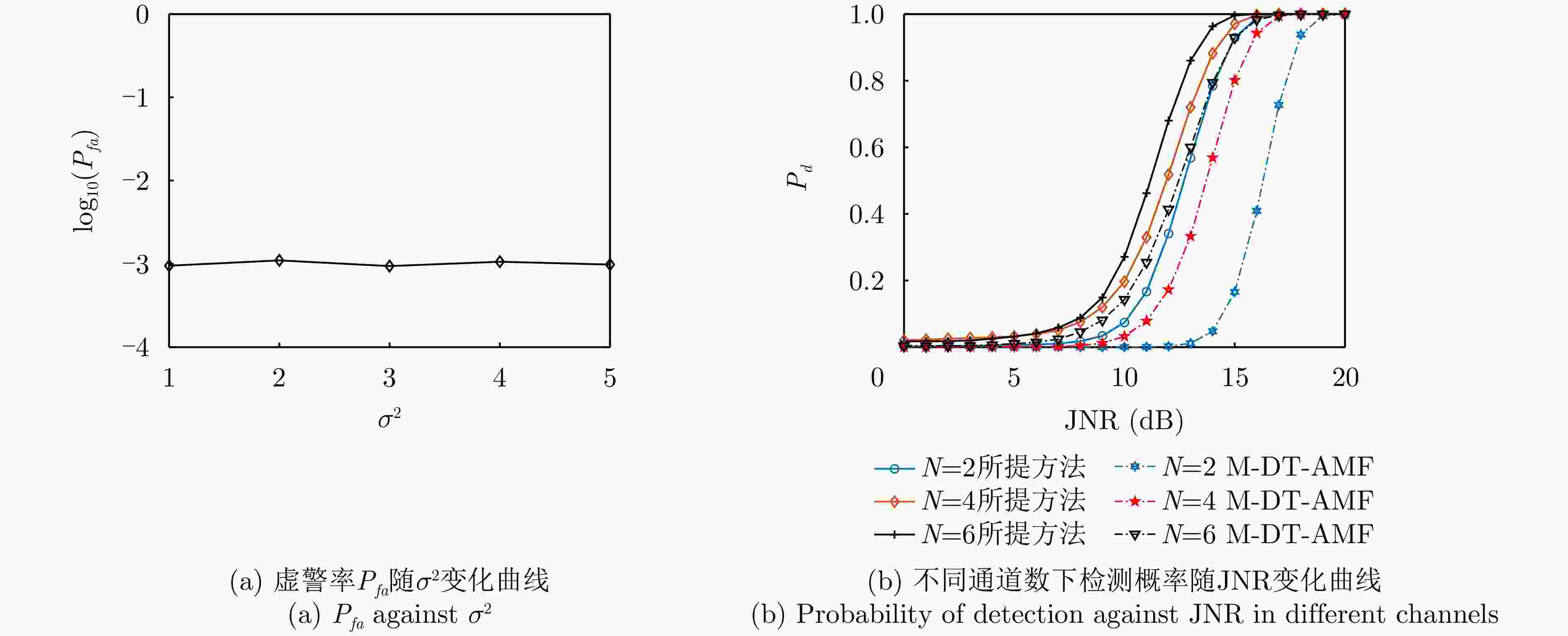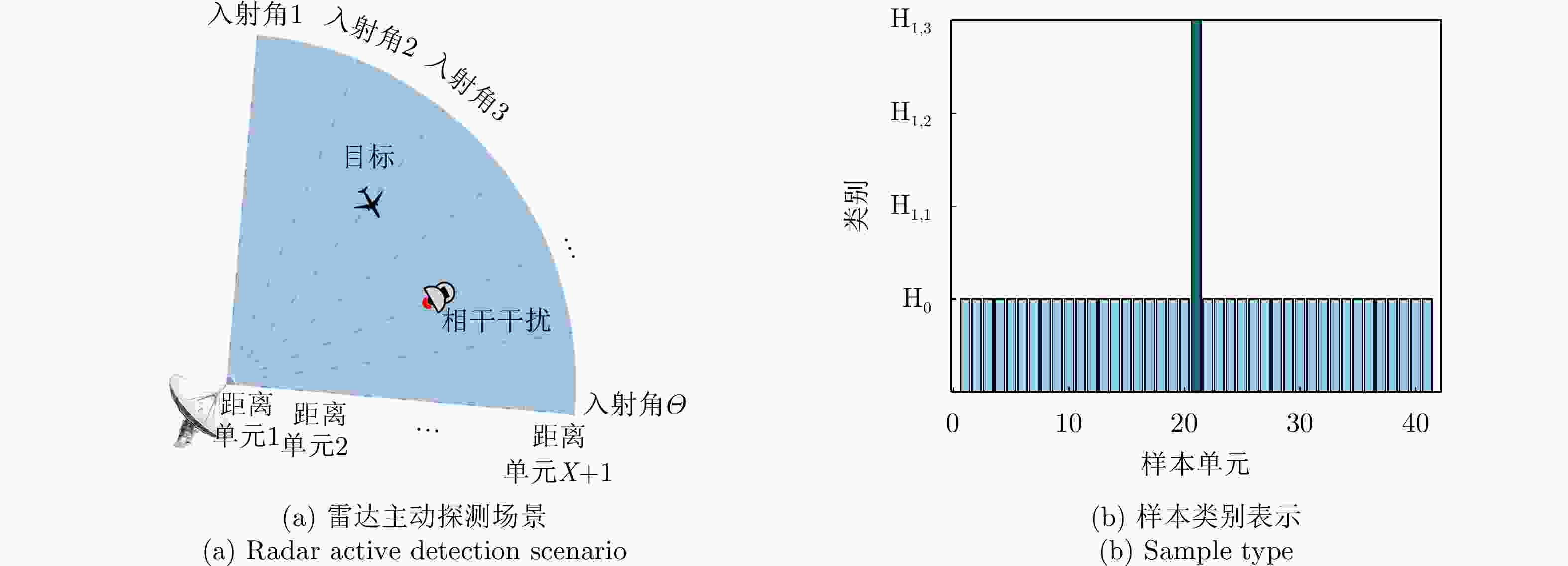 场景 类别 目标数量 SINR 入射角度 CJ数量 JNR 入射角度 $ {{\rm H}_0} $ 1 0 \ \ 0 \ \ $ {{\mathrm{H}}_{1,1}} $ 2 0 \ \ 1 10 dB 30° $ {{\mathrm{H}}_{1,2}} $ 3 1 10 dB 0° 0 \ \ $ {{\mathrm{H}}_{1,3}} $ 4 1 10 dB 0° 1 10 dB 20° -
