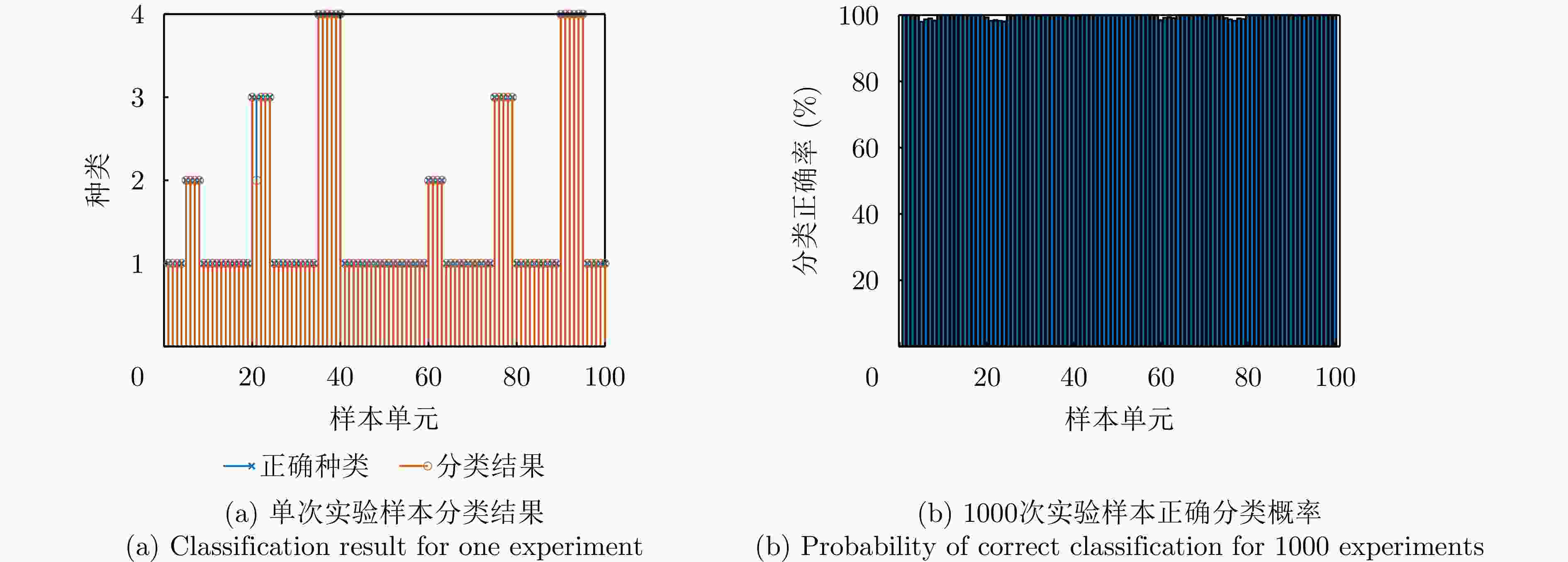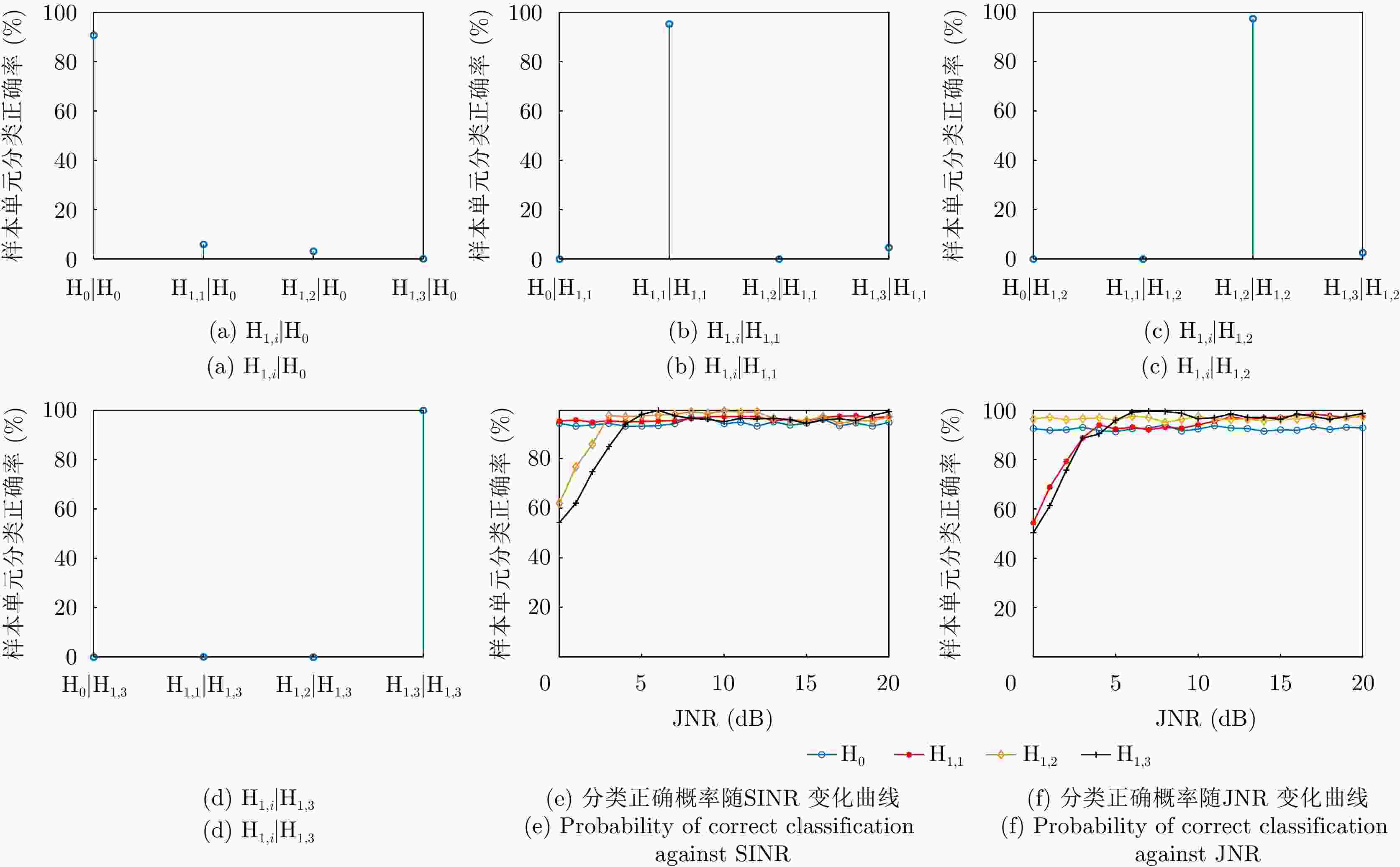 场景 类别 信号成分 JNR 入射角度 所在样本单元 场景1 1 无 \ \ 1~4,9~19,25~34,41~59,64~74,80~89,96~100 2 NCP1 15 dB –2° 5~8,60~63 3 NCP2 15 dB 0° 20~24,75~79 4 NCP3 15 dB 2° 35~40,90~95 场景2 1 无 \ \ 1~4,9~19,25~34,41~59,64~74,80~89,96~100 2 NCP1 15 dB 0° 5~8,60~63 3 NCP2 17.5 dB 0° 20~24,75~79 4 NCP3 20 dB 0° 35~40,90~95 表 2 CJ 与目标参数设置