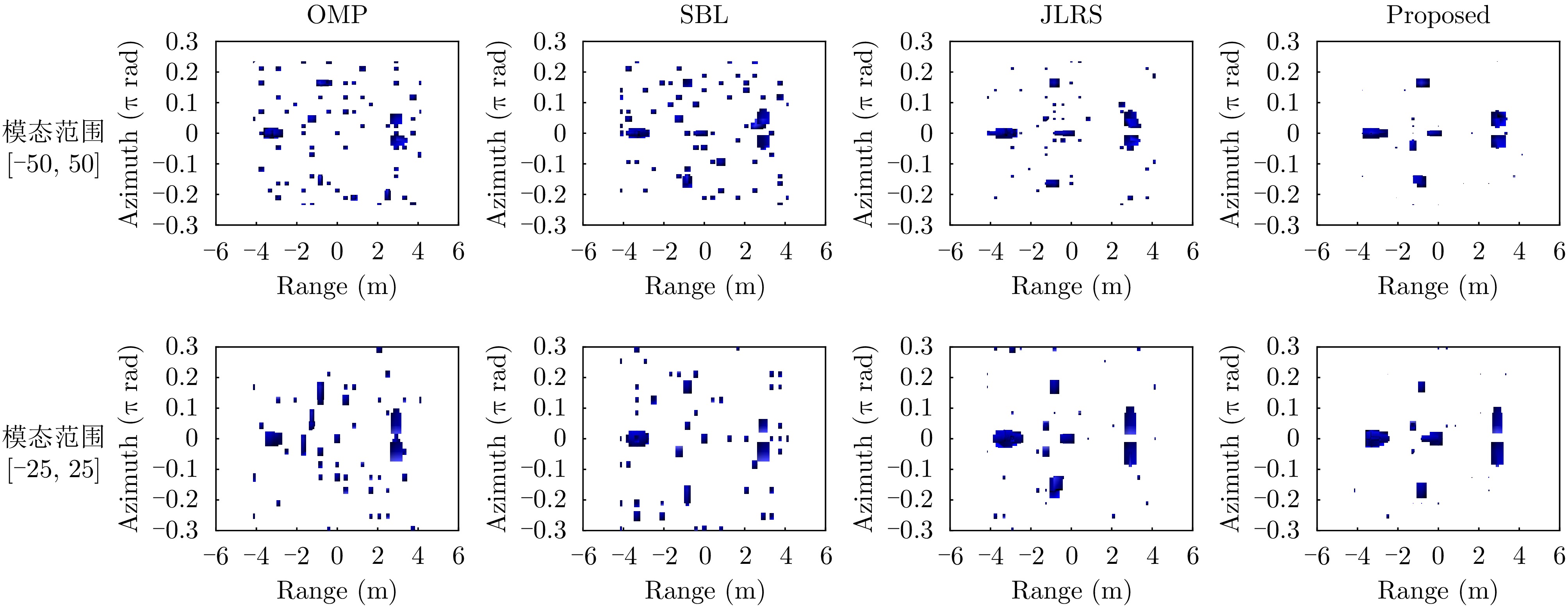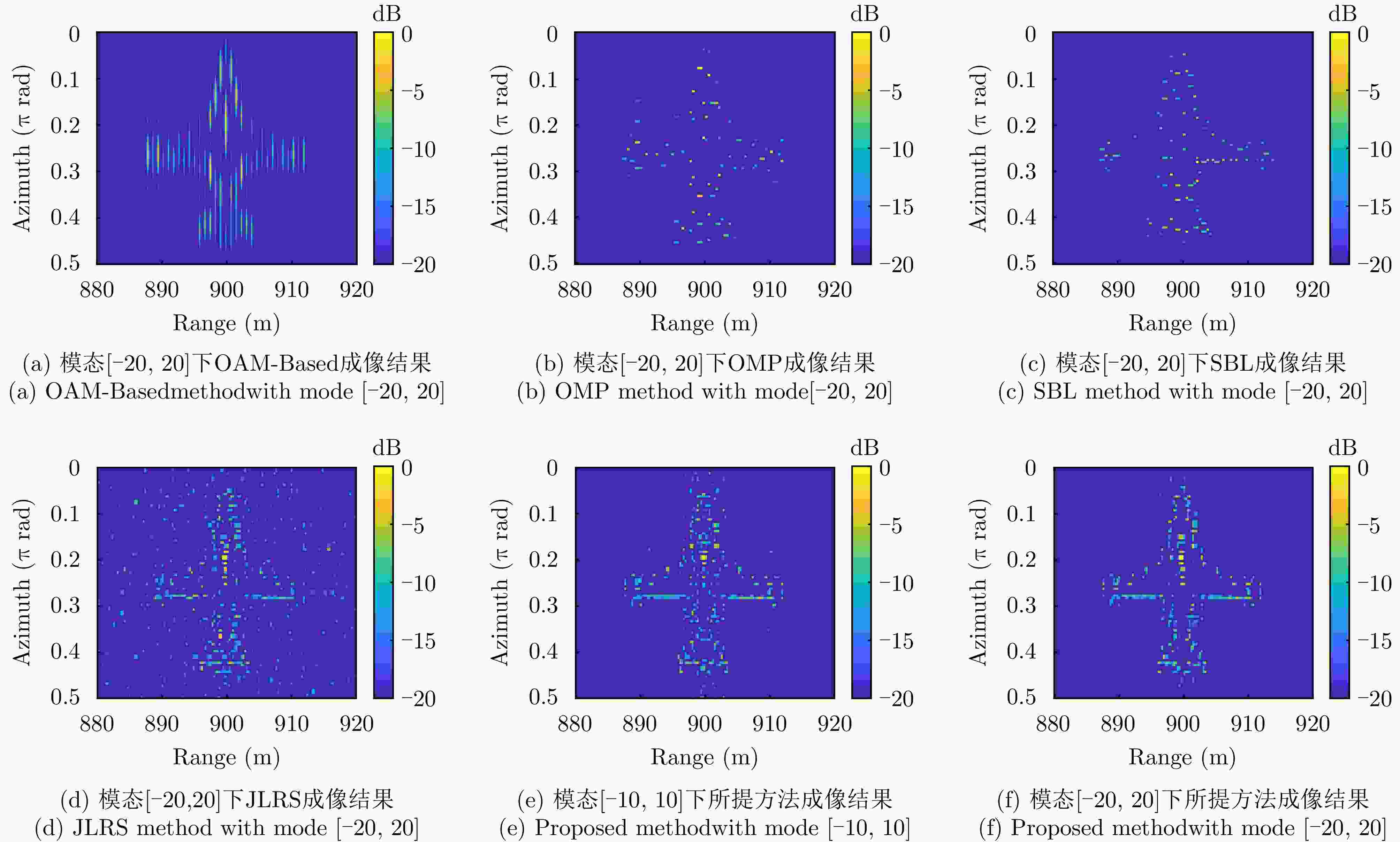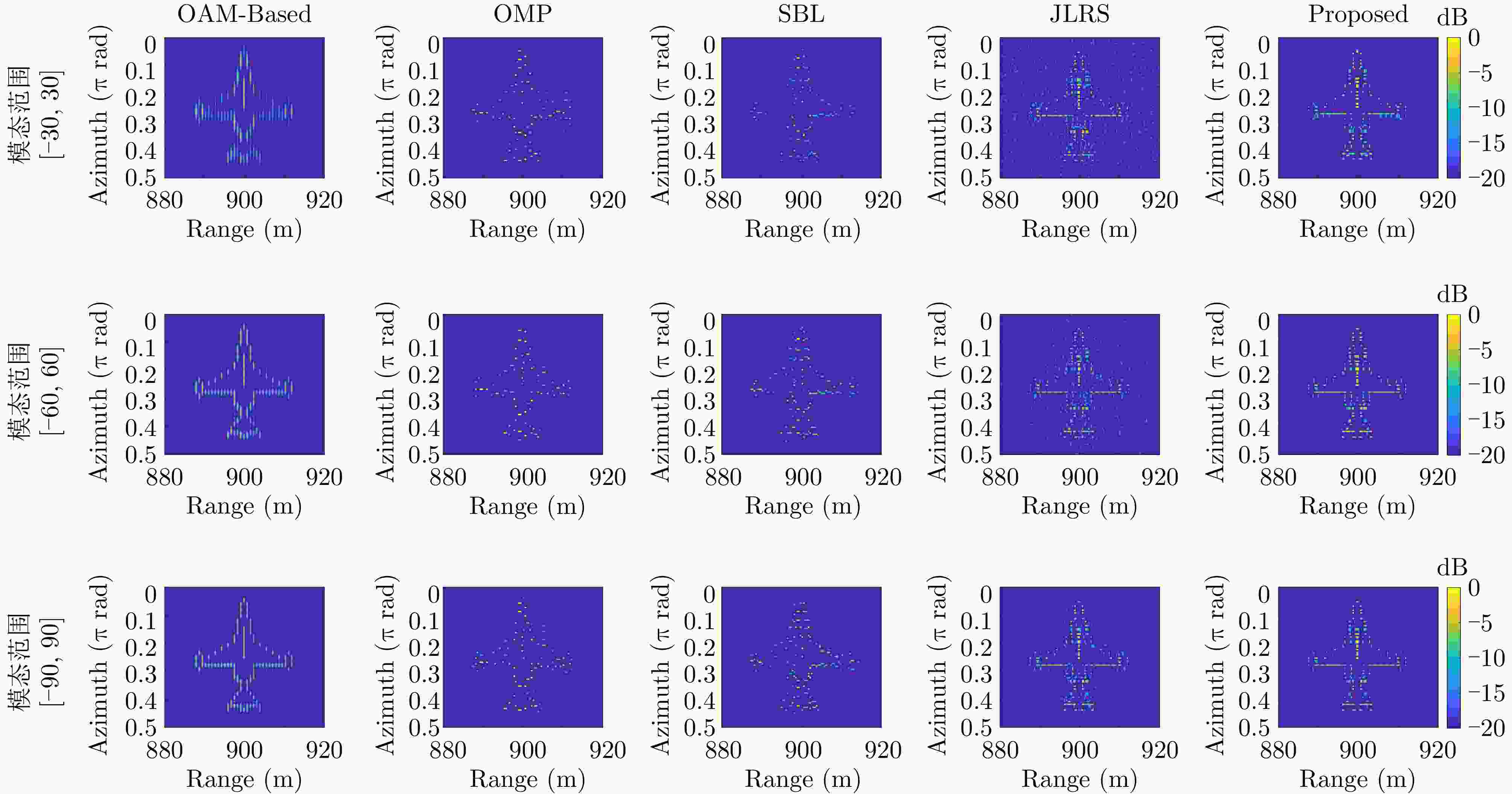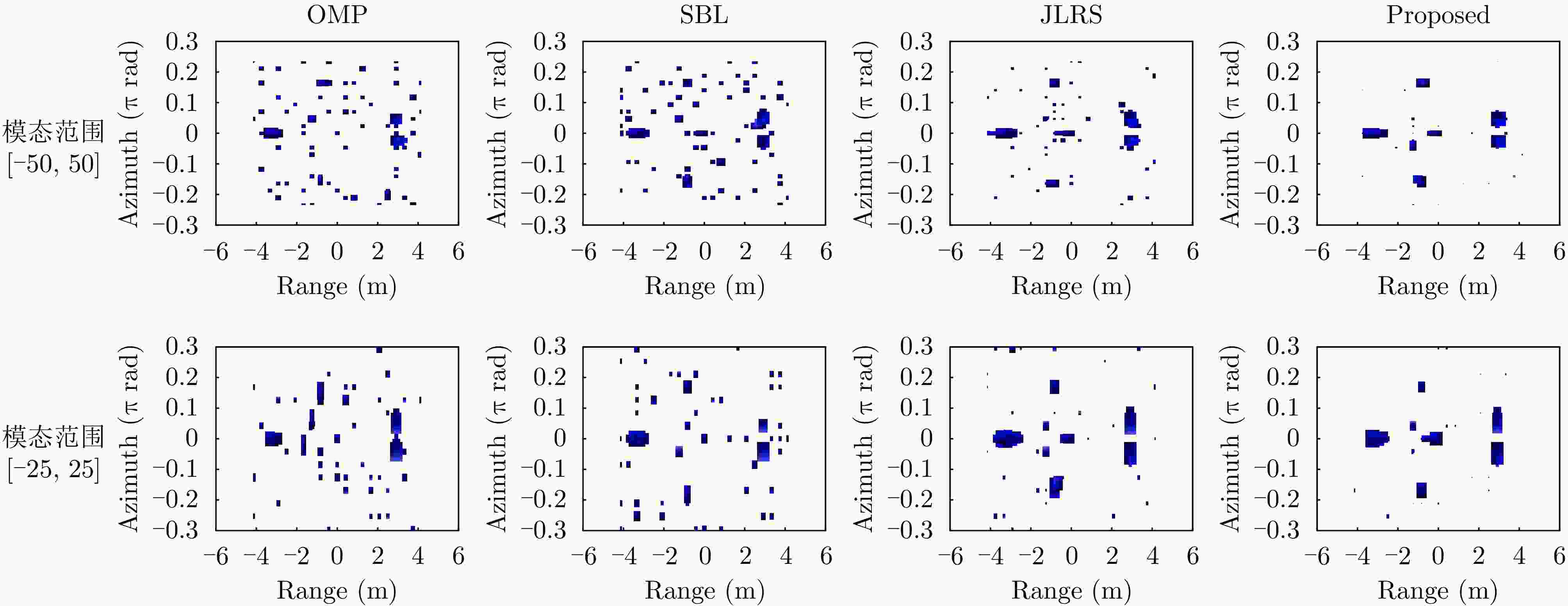 参数 数值 载频f0 10 GHz 带宽B 180 MHz 脉冲周期$ PR $ 50 μs 子脉冲数D 100 阵列半径a 0.5 m 目标俯仰角$ {\theta _0} $ $0.3 \pi $ 目标距离范围 (880, 920) m 目标方位角范围 ($0\pi $, $0.5\pi $) rad 距离单元数$ {N_{r}} $ 120 方位网格数$ {N_{{\mathrm{a}}}} $ 120 -