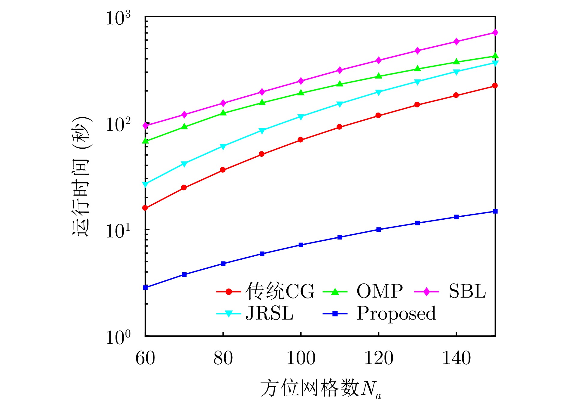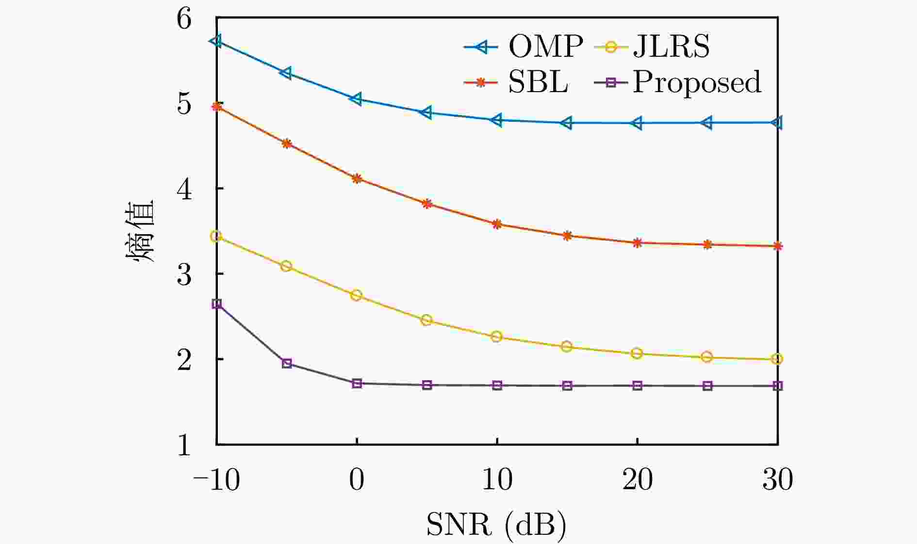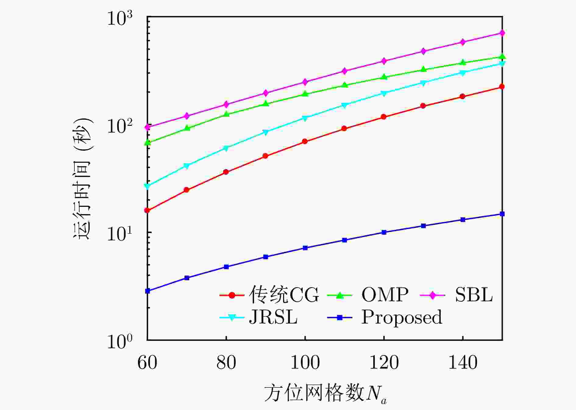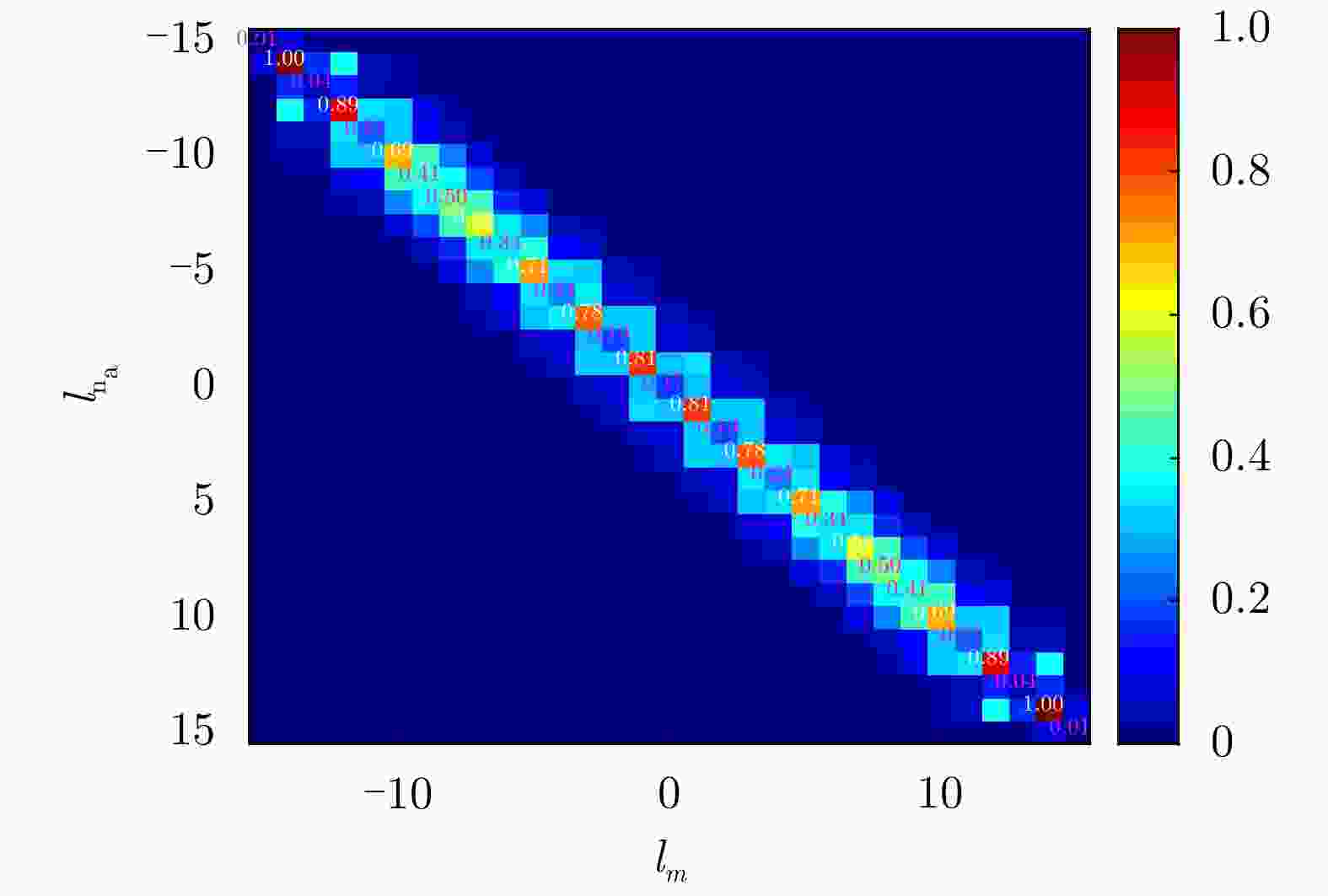 参数 数值 载频f0 10 GHz 带宽B 180 MHz 脉冲周期$ PR $ 50 μs 子脉冲数D 100 阵列半径a 0.5 m 目标俯仰角$ {\theta _0} $ $0.3 \pi $ 目标距离范围 (880, 920) m 目标方位角范围 ($0\pi $, $0.5\pi $) rad 距离单元数$ {N_{r}} $ 120 方位网格数$ {N_{{\mathrm{a}}}} $ 120 -