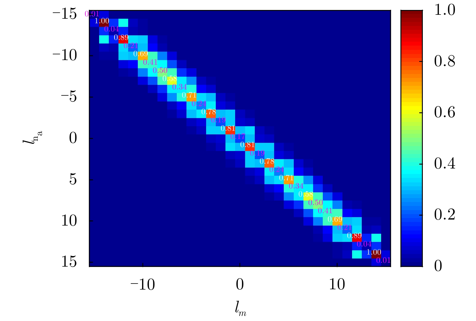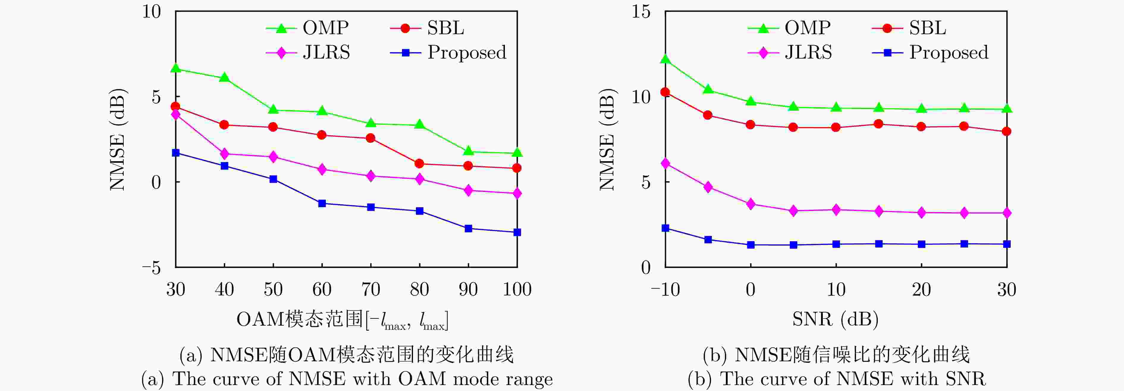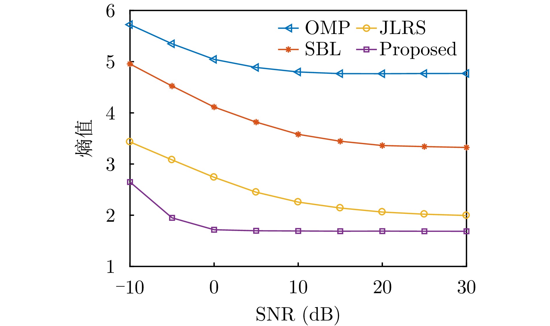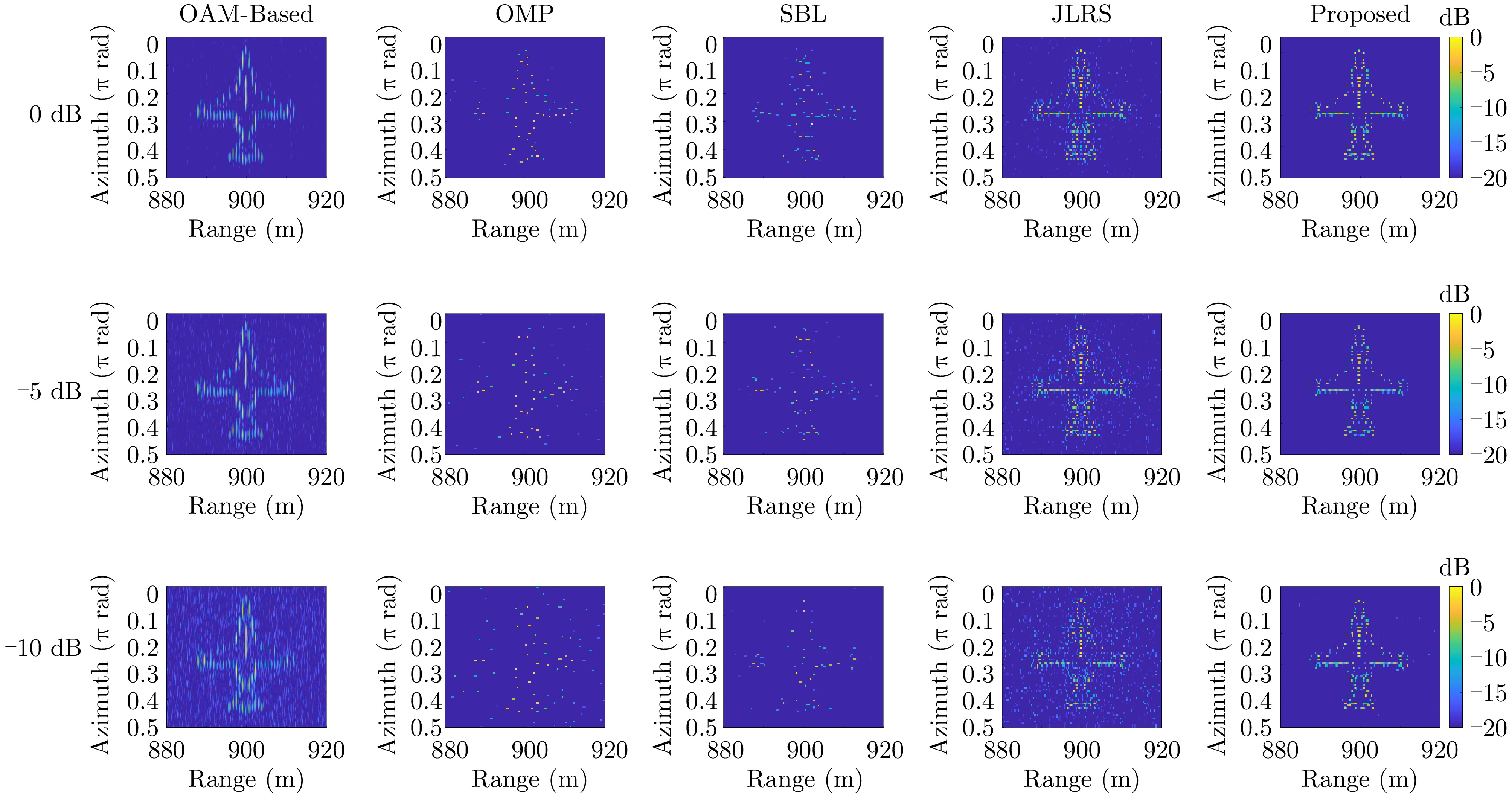参数 数值 载频f0 10 GHz 带宽B 180 MHz 脉冲周期$ PR $ 50 μs 子脉冲数D 100 阵列半径a 0.5 m 目标俯仰角$ {\theta _0} $ $0.3 \pi $ 目标距离范围 (880, 920) m 目标方位角范围 ($0\pi $, $0.5\pi $) rad 距离单元数$ {N_{r}} $ 120 方位网格数$ {N_{{\mathrm{a}}}} $ 120 -
